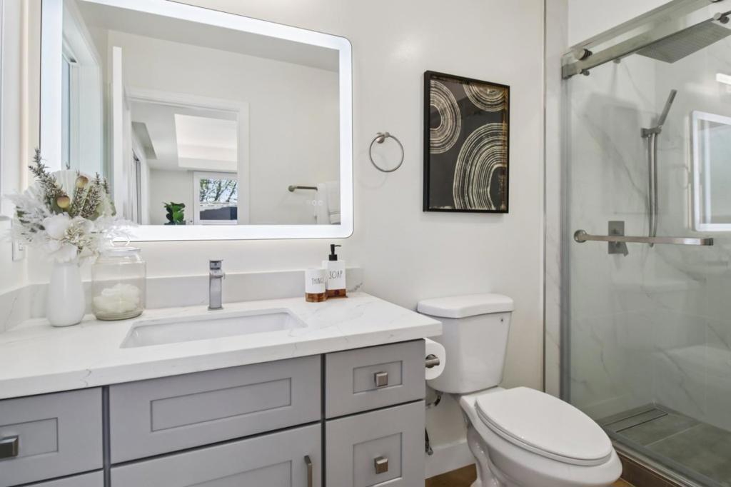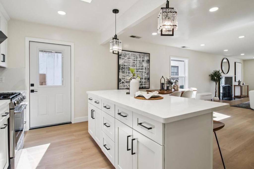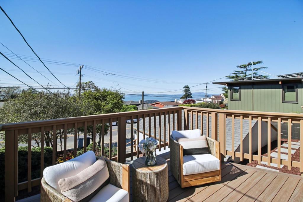 This stunning fully remodeled home offers bay views and exceptional indoor-outdoor living. Renovated with high-quality finishes, it features a bright open floor plan with wide-plank flooring and recessed lighting throughout. The living area includes a sleek fireplace and opens through expansive glass doors to one of two spacious decks, ideal for entertaining, dining, or relaxing with views. The chefs kitchen features white cabinetry, quartz countertops, stainless steel appliances, and a large center island with bar seating. Well-appointed bedrooms provide comfort and flexibility, including a spacious primary suite with dual closets and a beautifully updated bathroom featuring modern vanities, illuminated mirrors, and a frameless glass shower with designer tiles. A sliding door offers direct access to the private backyard, enhancing indoor-outdoor flow. Additional bedrooms are bright and versatile with bay views, complemented by an updated hall bath with modern finishes. Move-in ready with central AC, this home blends style, comfort, and functionality. Close to Tilden Park with easy access to trails, UC Berkeley, downtown, shops, and dining.
