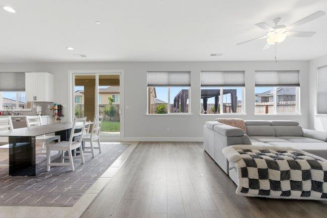 Gorgeous home built in 2023, situated on a corner lot in desirable Santa Ranch Subdivision. Tasteful rock trim at entry leads to pavered front patio and covered porch, with peaks of beautiful mountains! Home includes 5 bedrooms & 4 full bathrooms, with 2 bedrooms & 2 bathrooms on ground floor. Open kitchen includes island, quartz countertops/tile back splash, stainless steel appliances, 5 burner cooktop & walk-in pantry, all overlooking spacious family room! Hallways include extra built-ins, plus upstairs hallway has open space. Large Primary bedroom & Primary bathroom with separate bathtub & shower, double sinks, medicine cabinet & walk-in closet. Laundry room is large with cabinets & countertop. Low maintenance front & backyard landscaping with fully landscaped back yard including covered concrete patio, pavered patio, pergola, shed, artificial lawns including pet turf area, outdoor lighting & in paver lights, lemon, lime & Mandarin trees! Solar is owned & has bird proofing installed. Puronics water Softener system with reverse osmosis, tankless water heater, Tesla electric car charger & Metallic garage flooring! Sellers have added so many extras to this beautiful home! Nice location close to grammar school & parks, so much to offer, so much room, what are you waiting for?!!