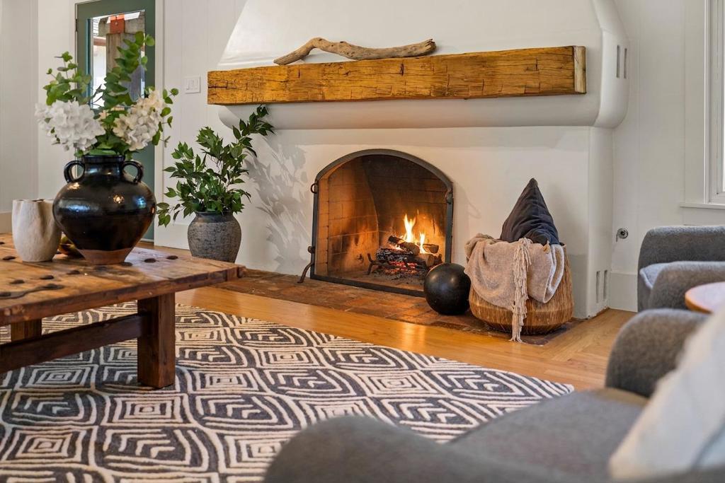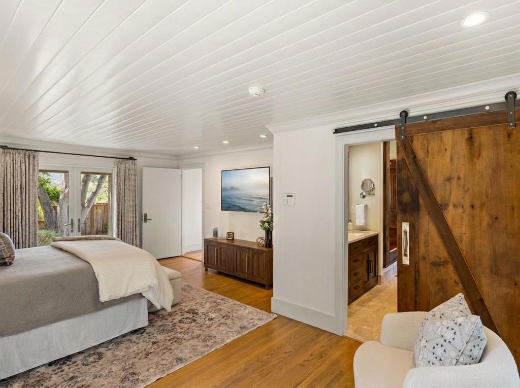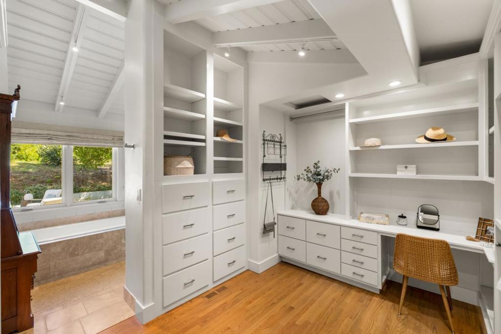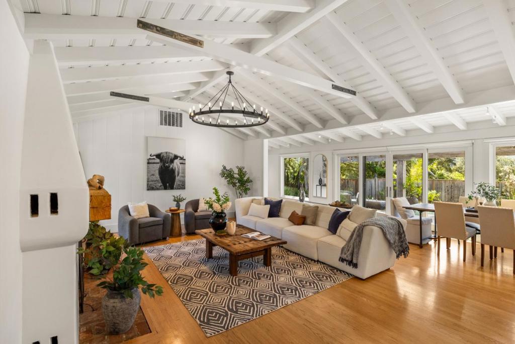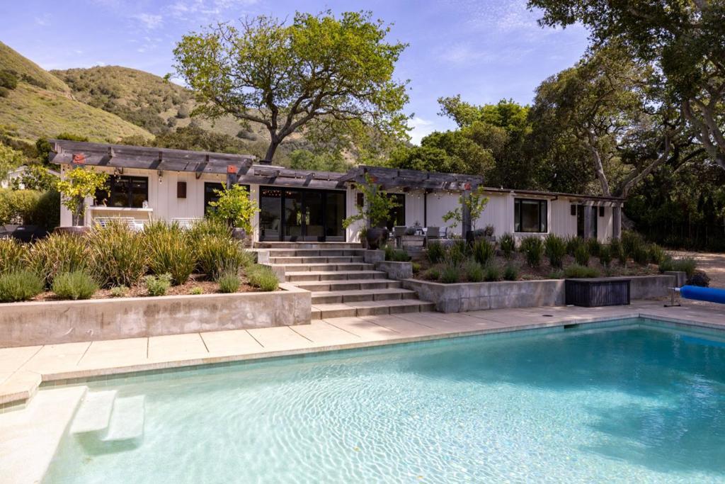 Nestled beneath ancient oaks with sweeping mountain views, this impeccably reimagined California ranch estate offers a rare blend of privacy, beauty, and sophistication. The 2,297 sq ft single-story main residence features soaring vaulted beam ceilings, wide-plank hardwood floors, and walls of glass that open to a stunning pool and gardens. The bright chef's kitchen features quartz countertops, a farmhouse sink, and custom cabinetry. The generous primary suite includes direct garden access, a spa-inspired bath with soaking tub, glass shower, and a custom walk-in dressing room. The main house also features a central air conditioning system! Outside, a string-lit pergola terrace runs the length of the home, terraced steps lead to a sparkling pool framed by lavender and mountain views, and a raised-bed kitchen garden adds charm and function. The detached guest quarters offer flexibility for guests, extended family, or a studio. A stone court with a fountain, mature oaks, and vibrant bougainvillea completes these incredible grounds.