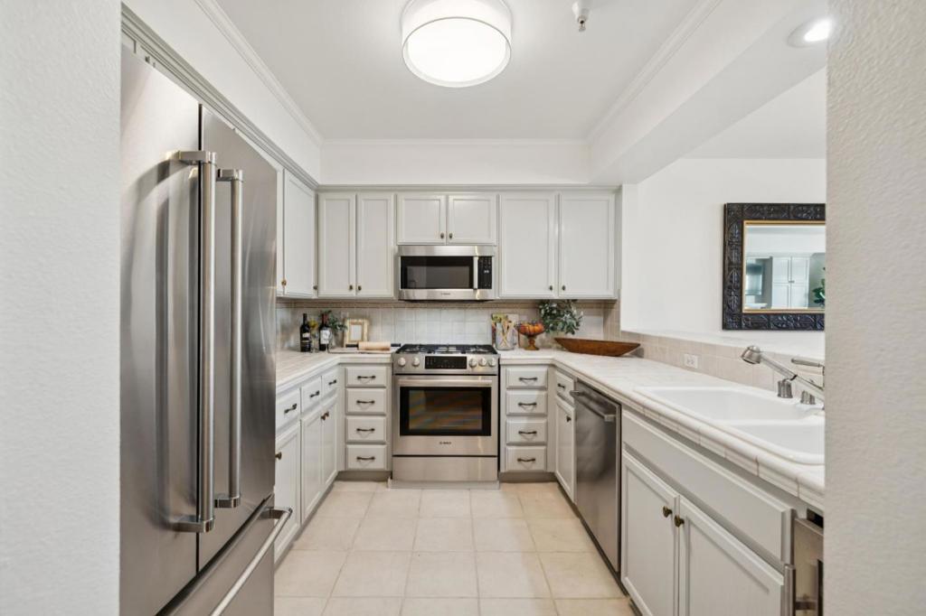 Pure luxury in downtown Burlingame! Rarely available top-floor condominium offering an exceptional blend of style, comfort, and convenience. An impressive entry unfolds with large windows, rich hardwood flooring, designer colors, and an abundance of natural light. The open-concept kitchen is both charming and functional, featuring stainless steel appliances, gas range, breakfast bar, recessed lighting, beverage refrigerator, and double sink. The spacious dining and living areas are highlighted by custom built-in cabinetry, gas fireplace, wall-mounted TV, and access to a private east-facing balcony. The expansive primary en suite boasts vaulted ceilings, two generous closets, and new carpeting. Additional features include central forced air heat, designer lighting, artistic tilework, in-unit laundry, and thoughtful craftsmanship throughout. Built in 2000, this prized Burlingame Mediterranean-style building offers a central courtyard and inviting outdoor spaces for entertaining and relaxation. Deeded parking, storage, and guest parking included. Reasonable HOA fees. Ideally located just blocks from Burlingame Ave. with close proximity to parks, library, recreation, public transportation, Caltrain, BART, SFO and top schools. A great value for those seeking the best of Burlingame!