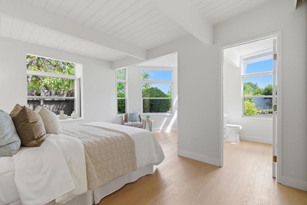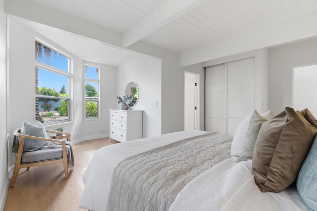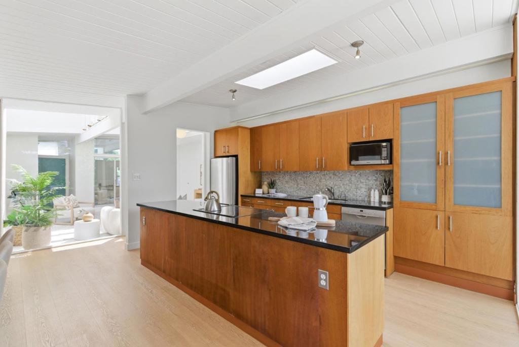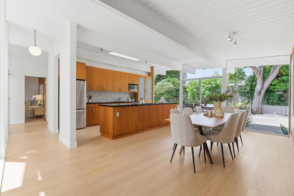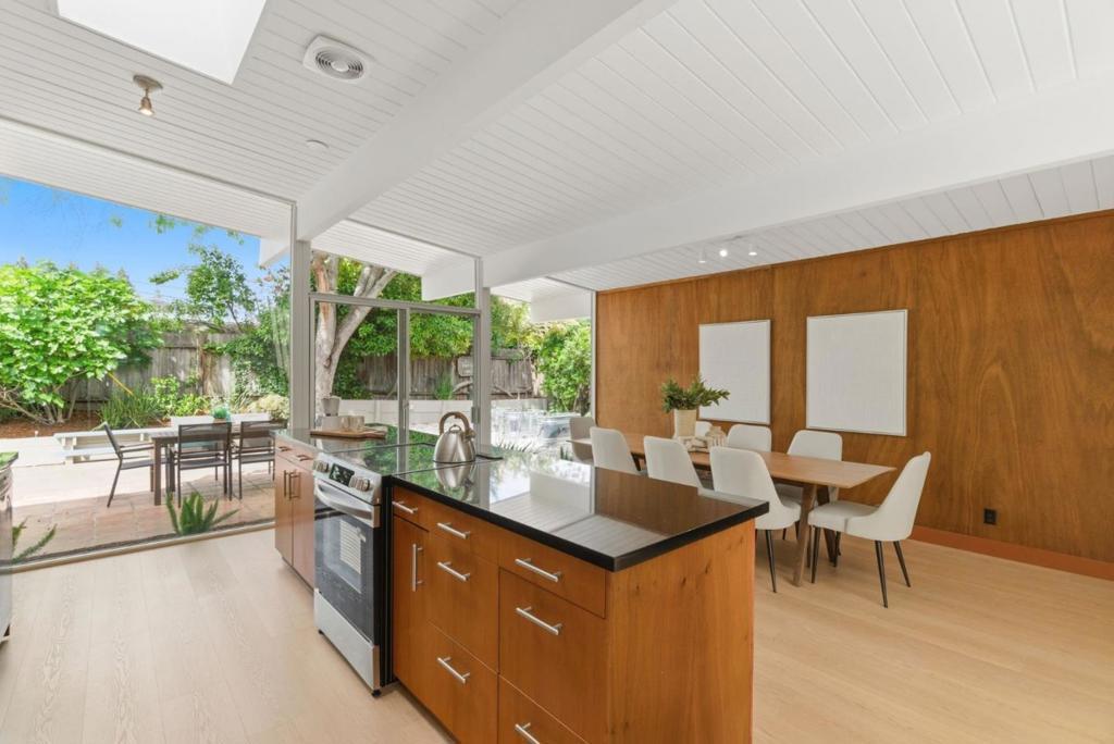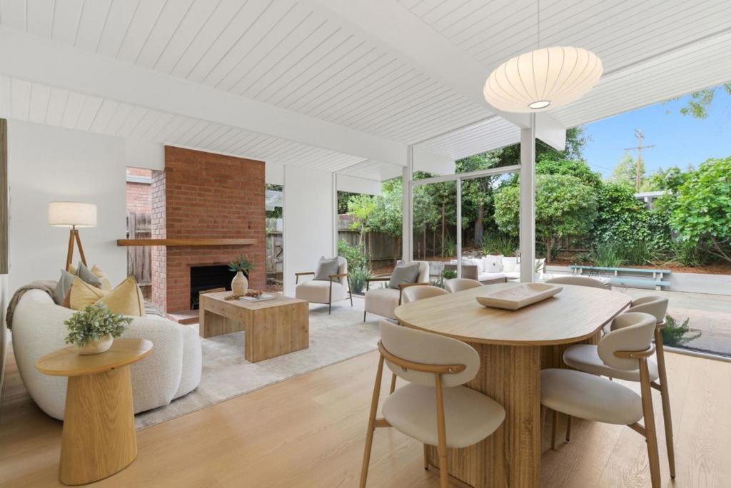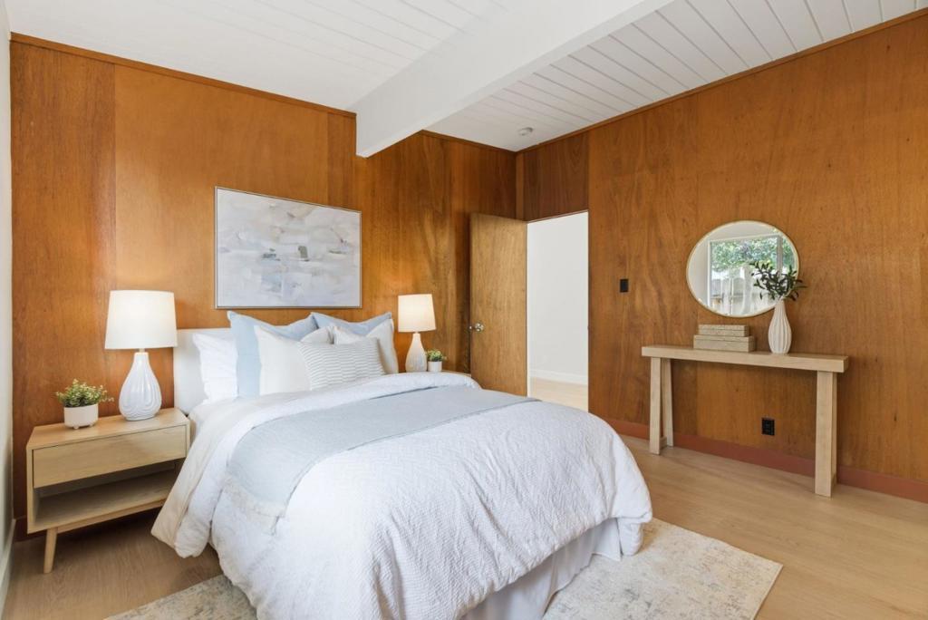 This spacious Fairbrae Eichler offers a unique floorplan with an addition in the front creating two primary suites on either side of the home, perfect for guests or in law quarters, as well as a spacious bonus room great for office or playroom. The enclosed atrium has new porcelain tile flooring, track lighting and skylights for abundant natural light. Youll find classic Eichler features throughout including mahogany paneling, globe lighting, open beam ceilings, post and beam construction, and iconic floor-to-ceiling panels of glass. The living and dining space has a brick wood burning fireplace with custom wood mantle and sliding door to yards. The updated kitchen features custom veneer core mahogany cabinetry, glass mosaic tile backsplash, granite countertops, stainless appliances with breakfast bar as well as eating area. New luxury vinyl plank flooring throughout with radiant heating. Landscaped yards with Spanish tile patio and trough planters. One car garage. Idyllic location, walk to Fairbrae Swim & Racquet Club and Fremont High School. Bike to Cumberland Elementary and Las Palmas Park. Minutes to abundance of El Camino Real amenities, Sprouts, Safeway, Trader Joes, as well as downtown Murphy Ave shops, restaurants, events, weekly Farmers Market and CalTrain station.