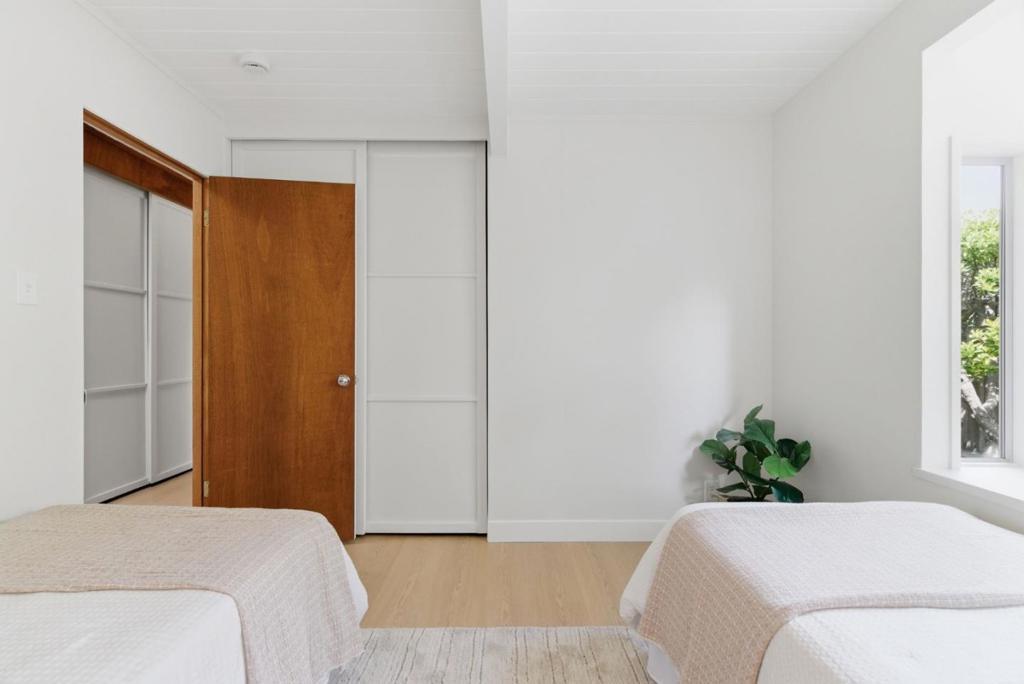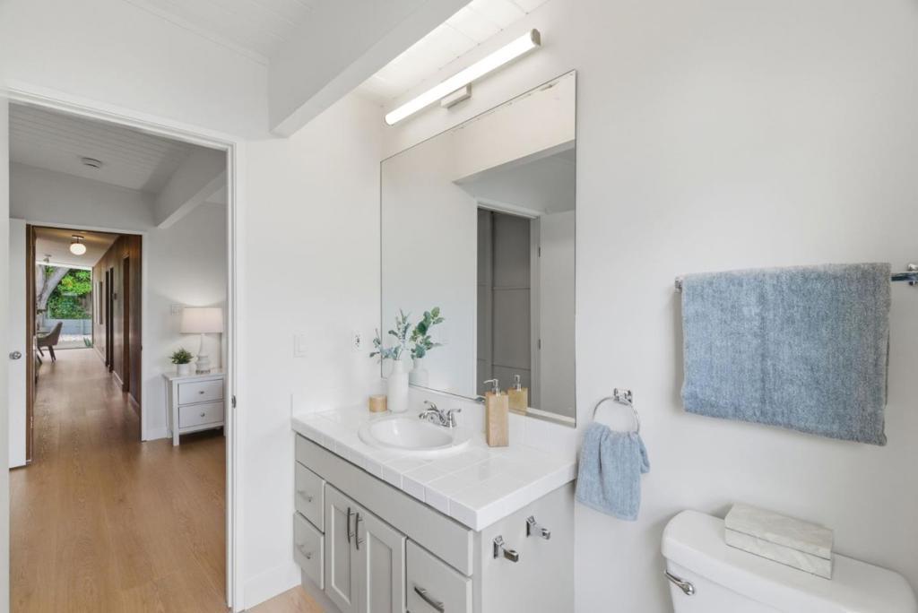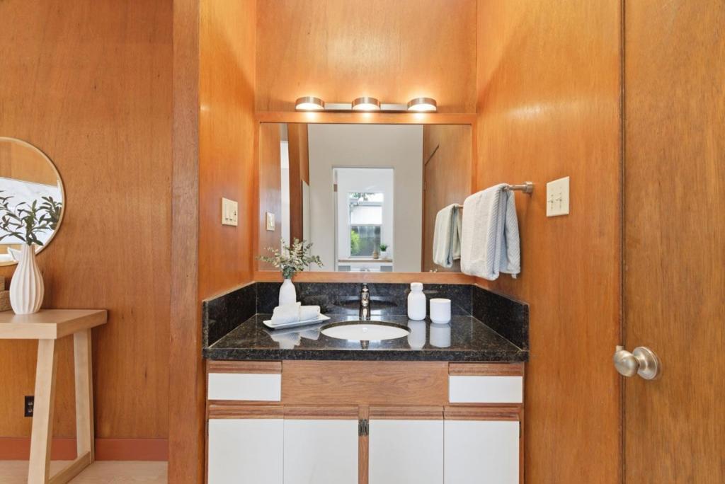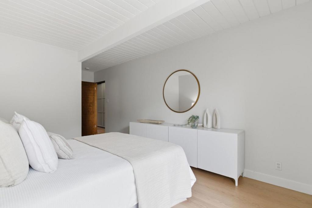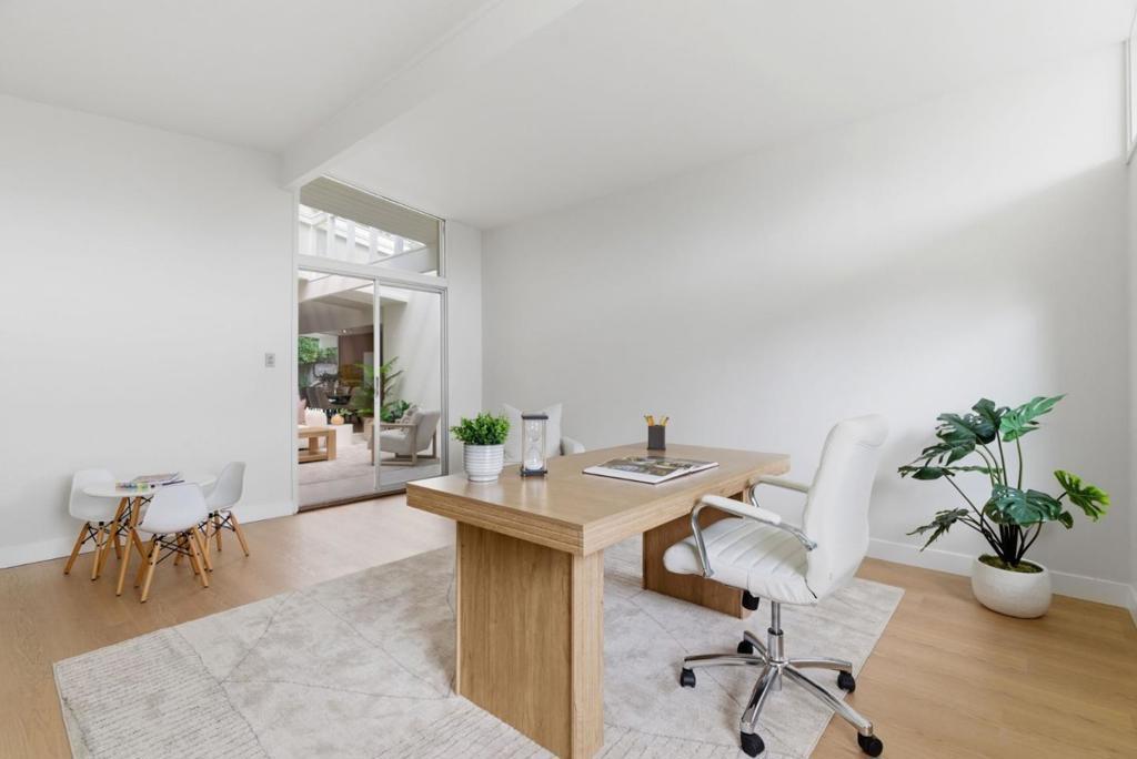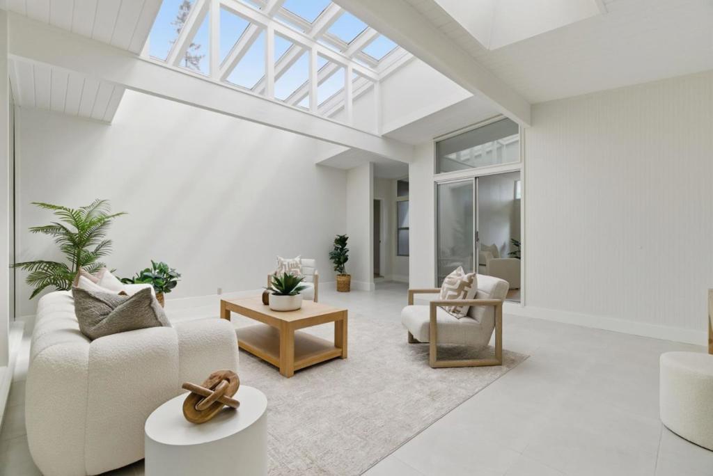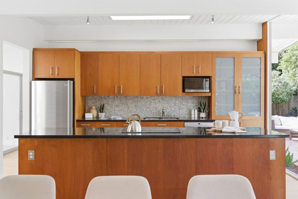 This spacious Fairbrae Eichler offers a unique floorplan with an addition in the front creating two primary suites on either side of the home, perfect for guests or in law quarters, as well as a spacious bonus room great for office or playroom. The enclosed atrium has new porcelain tile flooring, track lighting and skylights for abundant natural light. Youll find classic Eichler features throughout including mahogany paneling, globe lighting, open beam ceilings, post and beam construction, and iconic floor-to-ceiling panels of glass. The living and dining space has a brick wood burning fireplace with custom wood mantle and sliding door to yards. The updated kitchen features custom veneer core mahogany cabinetry, glass mosaic tile backsplash, granite countertops, stainless appliances with breakfast bar as well as eating area. New luxury vinyl plank flooring throughout with radiant heating. Landscaped yards with Spanish tile patio and trough planters. One car garage. Idyllic location, walk to Fairbrae Swim & Racquet Club and Fremont High School. Bike to Cumberland Elementary and Las Palmas Park. Minutes to abundance of El Camino Real amenities, Sprouts, Safeway, Trader Joes, as well as downtown Murphy Ave shops, restaurants, events, weekly Farmers Market and CalTrain station.