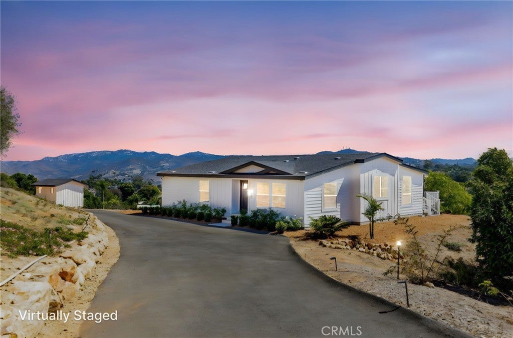 Welcome to 812 Quail Hill Road, a stunning 3 bedroom, 2 bath home offering 1,920 square feet of stylish living space on 2.05 acres with sweeping mountain views. Built in 2021, this contemporary retreat blends modern design with the natural beauty of Fallbrook’s rolling hills. The open floor plan creates a seamless flow from the expansive kitchen and dining area into the inviting family room, where accordion glass doors open to a spacious Trex deck—perfect for entertaining or simply enjoying the breathtaking scenery. The chef’s kitchen showcases quartz countertops, custom wood cabinetry, premium Bertazzoni appliances, and a Moen hands-free faucet, while the bathrooms feature Carrara marble with Delta and Grohe fixtures. Natural light fills the interiors, highlighting luxury vinyl flooring and a sleek Napoleon fireplace. A game room and a formal living room at the entry provide flexible space for entertaining and everyday living. Smart home features, thoughtful finishes, and effortless indoor-outdoor living enhance the comfort and sophistication of this home. The A70-zoned 2.05-acre lot is cleared and ready for your imagination—expand your outdoor living, add a pool, bring in horses, chickens, or goats, or create a private garden retreat. Just minutes from downtown Fallbrook, Hwy 15, Hwy 76, and the Camp Pendleton back gate, this property offers a rare combination of privacy, convenience, and endless views—an exceptional opportunity to experience modern living in one of North County’s most desirable settings. Manufactured home is on permanent foundation.