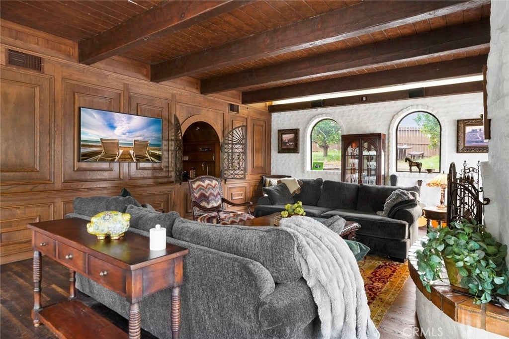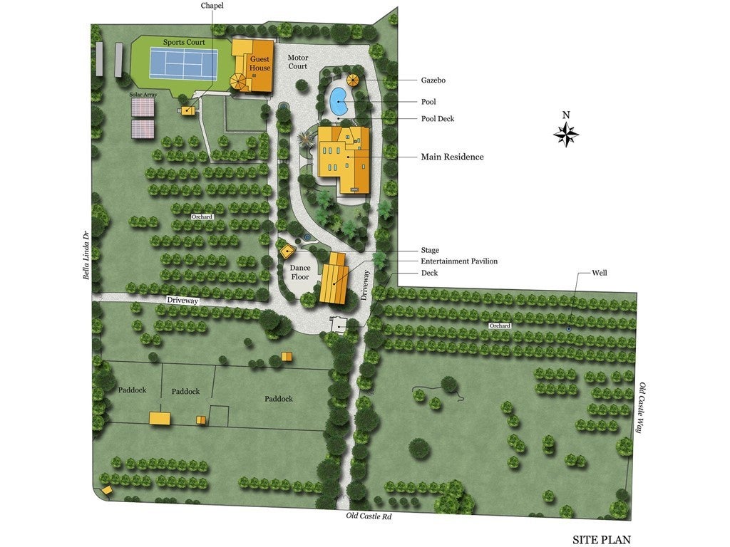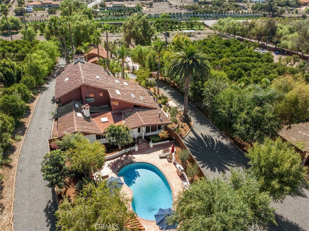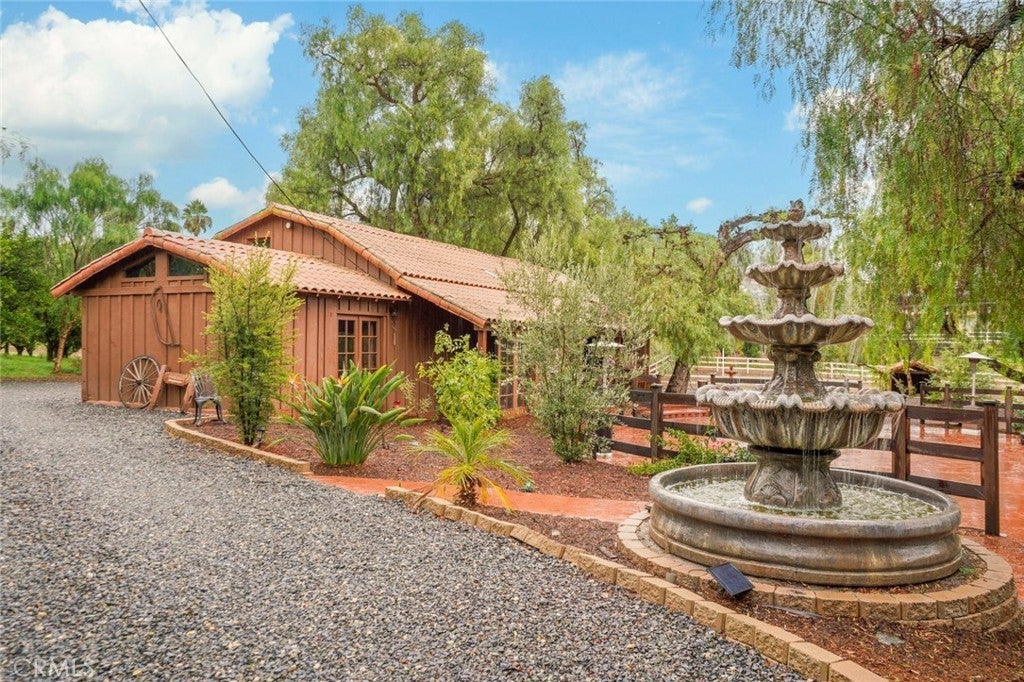With a rare blend of old-world charm and modern amenities, this hacienda style estate brims with history, grace, attention to the details for fine living, entertainment and enjoyment of the land. The main house showcases classic hacienda elements plus a generous guest house provides a comfortable stay for visitors. Nestled on over 6 lush acres, everything was designed for unforgettable gatherings. The expansive entertainment pavilion features party rooms, a kitchen, bathroom and bar. Host lively events on the dance floor, dine under ambient lighting, or enjoy live performances on the built-in stage. Stroll through your own flourishing grove of delicious Valencia oranges and passion fruit irrigated by your private well. Tend to your horses or farm animals at the nearby corrals. Grab a game at your private sport court and a swim afterwards in the refreshing sparkling pool. Eco-conscious solar panels are owned. Find dedicated parking and hookups for your RV next to a custom deck. The private gated entrance and beautiful tree lined driveway is timeless and impressive. Whether looking for a private oasis or a family compound, hobby farm or expand your crop, tend to a horse or buy another, this stunning property has it all.
