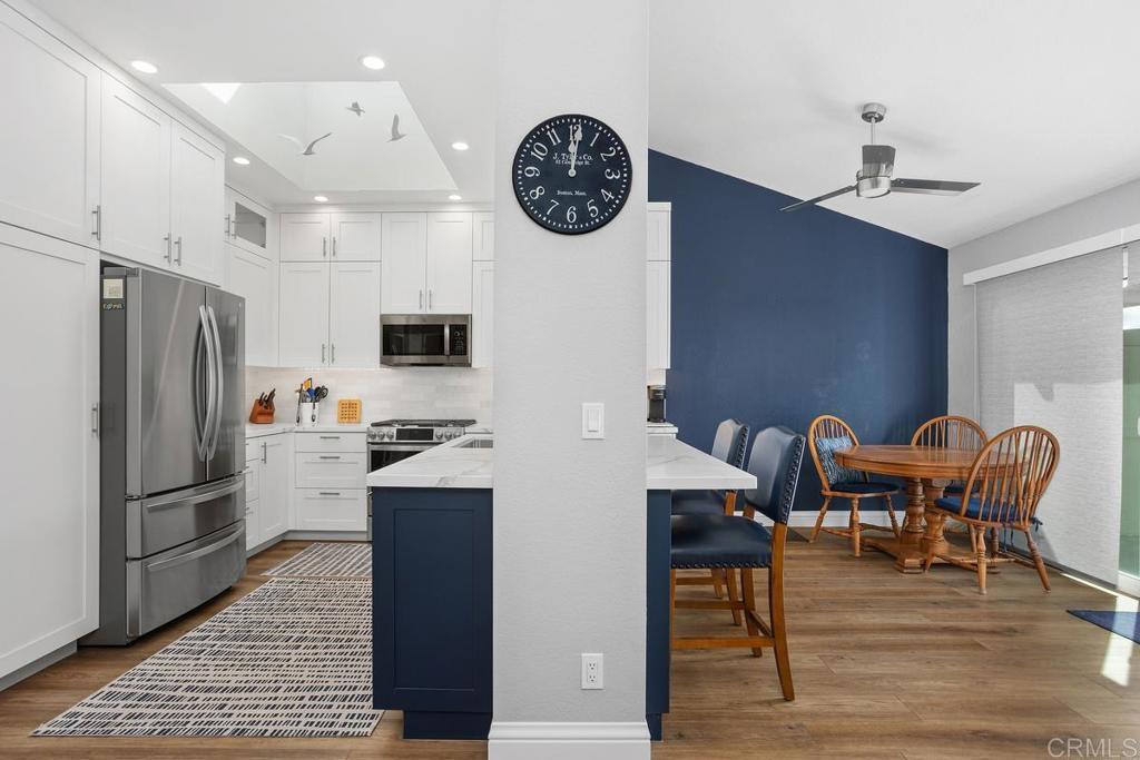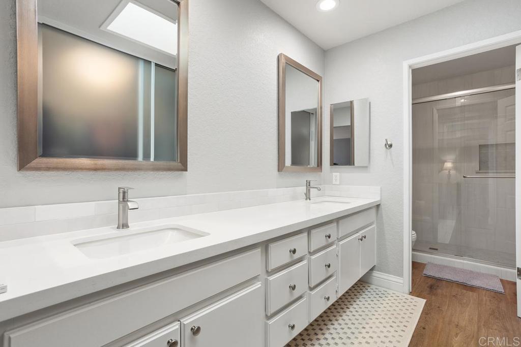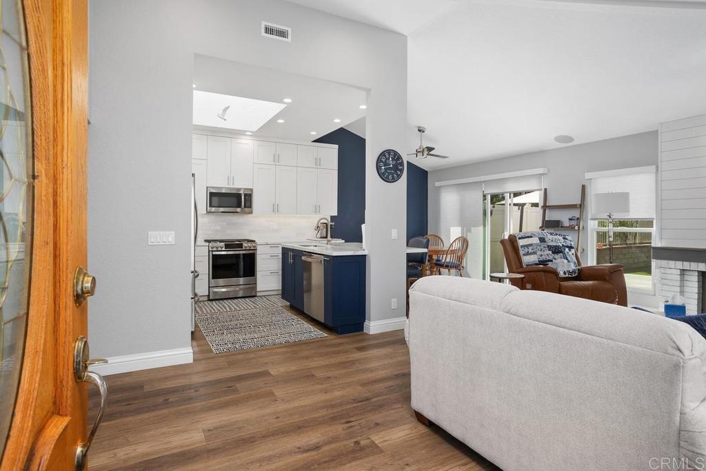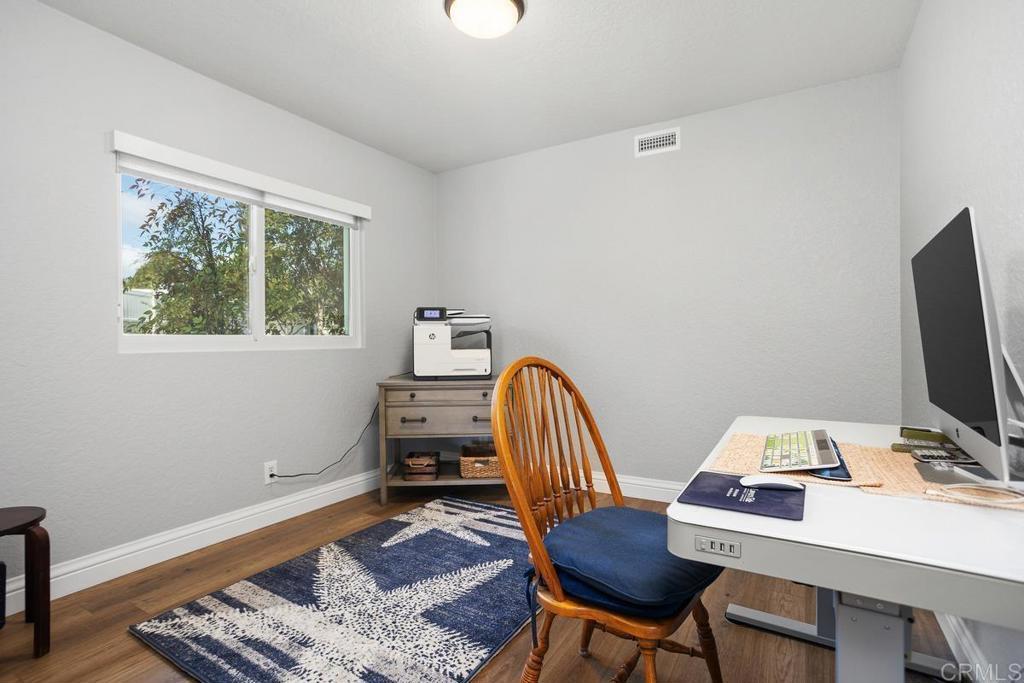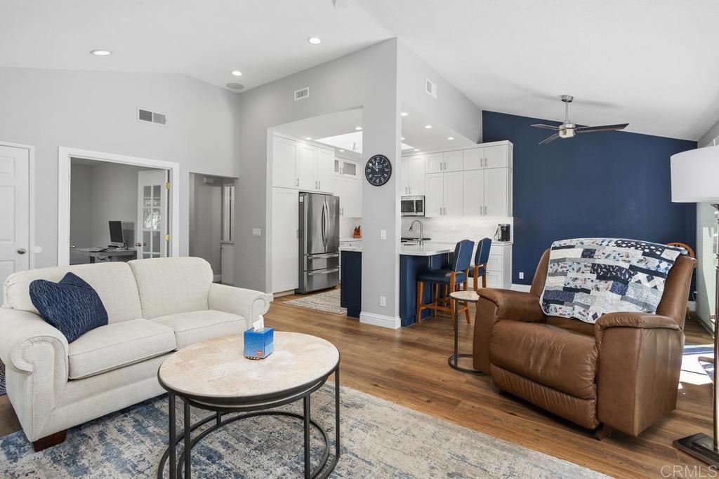 High end upgrades highlight this stunning two bedroom home that includes an additional room for office/den or guest bedroom. The kitchen is truly to die for, the fantastic bright and open design features quartz counters, tiled backsplash with under cabinet lighting, beautiful white cabinets from floor to ceiling offer space for everything, gorgeous blue base at the center island w/ breakfast bar. Stainless steel appliances (2021), amazing automated skylight (2021) that opens with a push of the button allowing wonderful breezes in, recessed lighting. Luxury vinyl plank flooring throughout this home compliments any decor with its neutral warm color. Sliding door off dining area leads out to the relaxing and private back yard. The primary bedroom has vaulted ceilings, en suite bathroom featuring double sinks, new tile shower, walk-in closet and a private enclosed patio with new decking for your own zen retreat. Renewal by Anderson windows (2020) with transferable warranty, new HVAC (2023), Full Home Filtration System (2021), tankless water heater (2022), owned Solar Optimum Solar (2019). This wonderful patio home is walking distance to the members only, Shadowridge Country Club featuring dining, drinks, social activities and of course, golf.