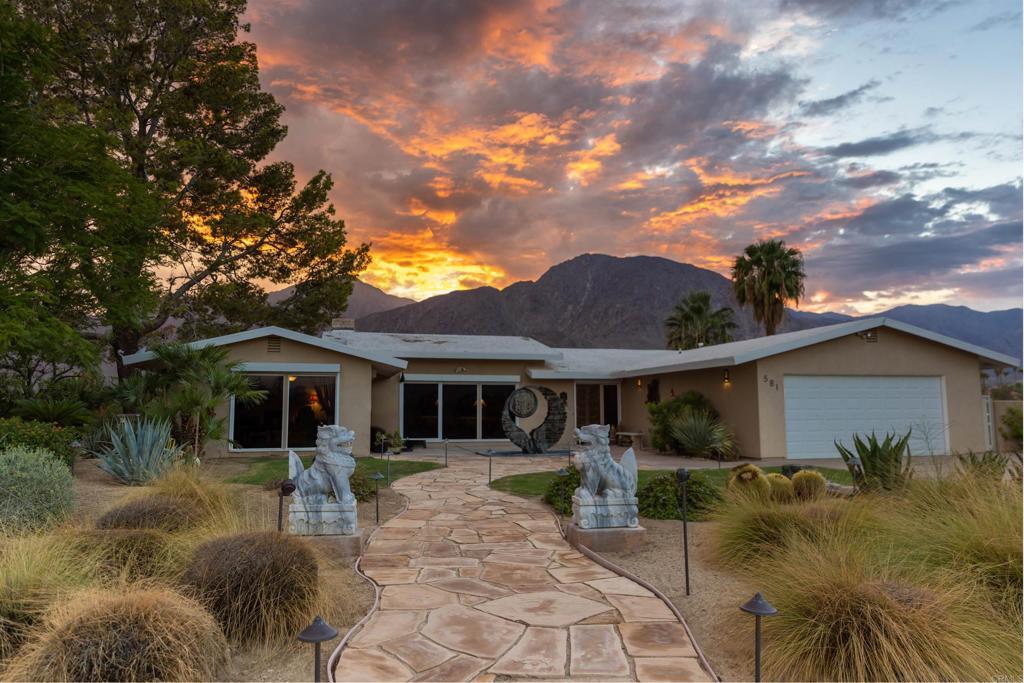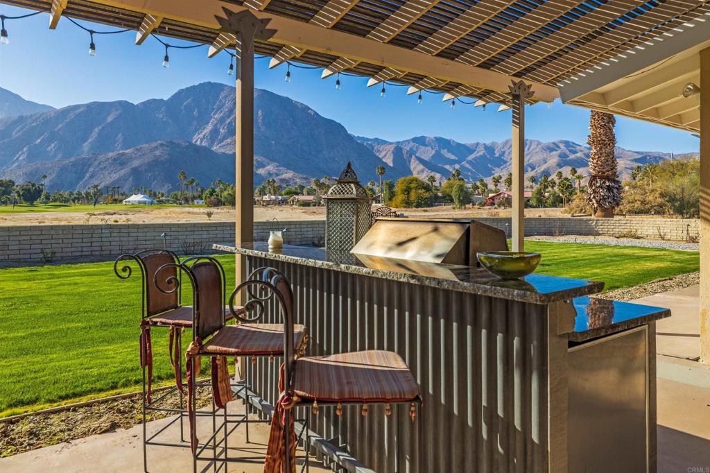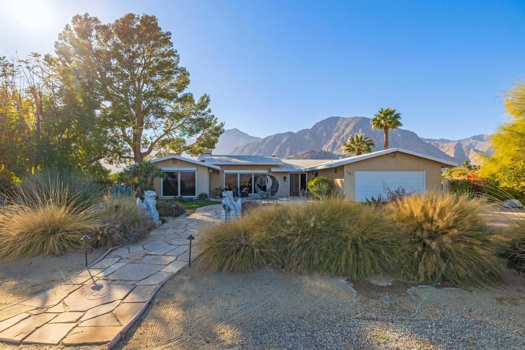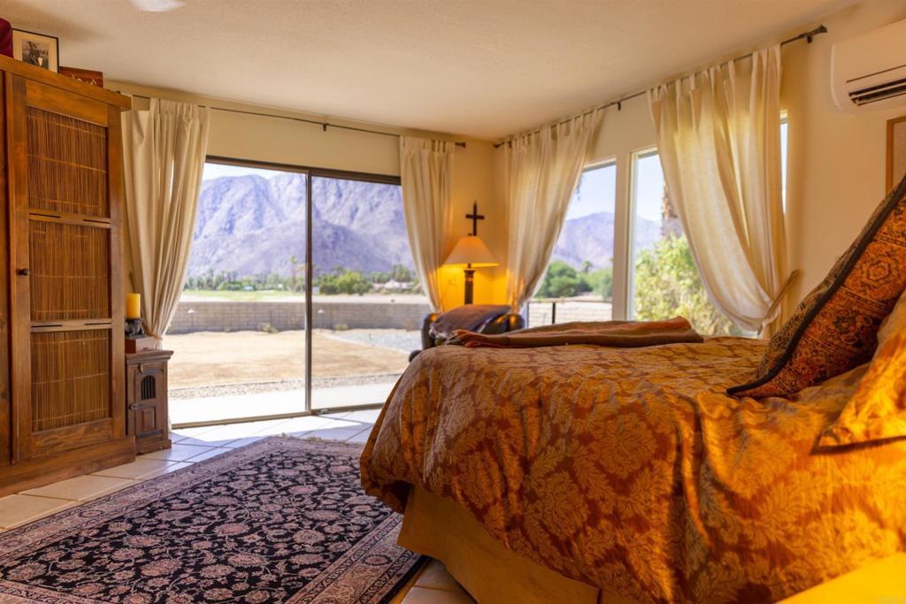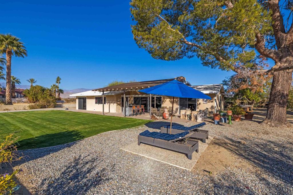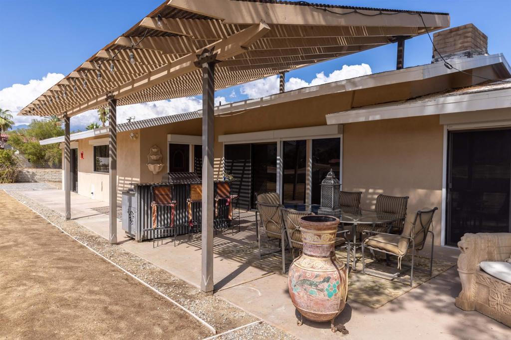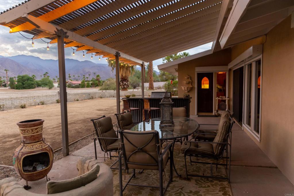 Lovely Moroccan inspired home located in the De Anza Golf Estates. Landscaping, fountain, BBQ and gates all custom designed by renowned metal sculptor John Richen. Granite counter tops, newer appliances, new AC, metal security shutters on all windows. Stunning views from both front and back of the desert, golf course and surrounding mountains. Featuring 3 bedrooms, 2 bathrooms with master suite on the other end of the house for privacy. Includes neighboring lot for a total of 0.82 acre giving plenty of room for a pool, guest house, RV parking, etc.