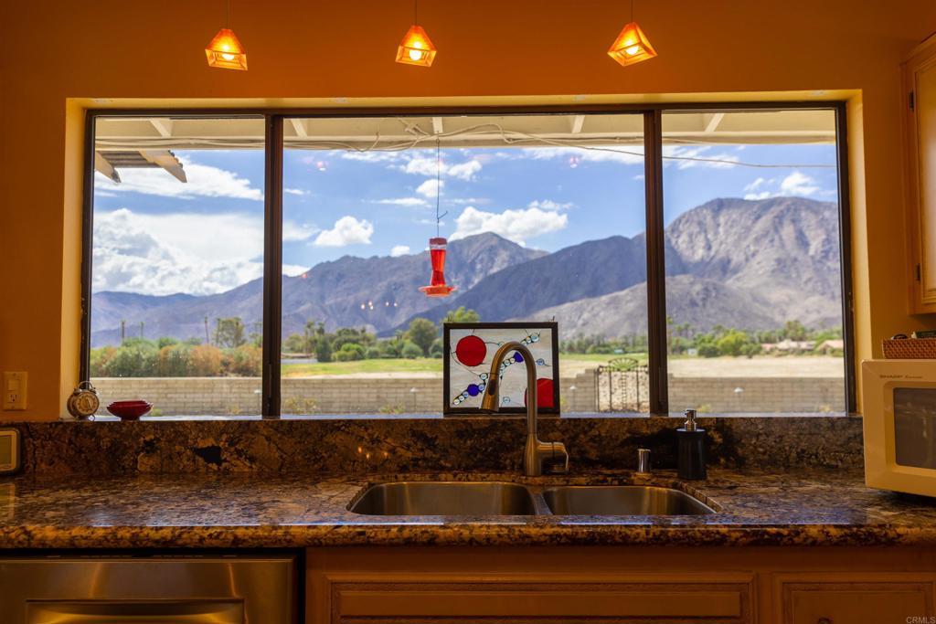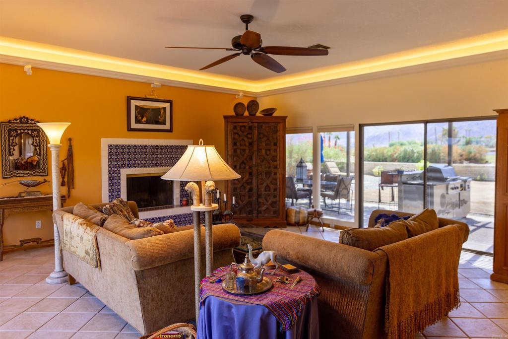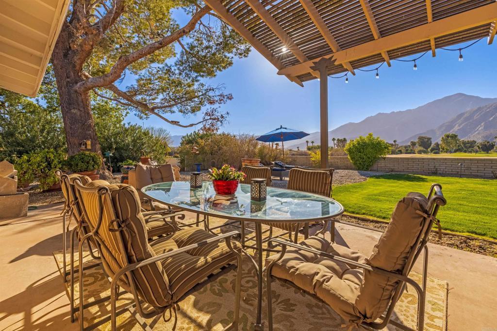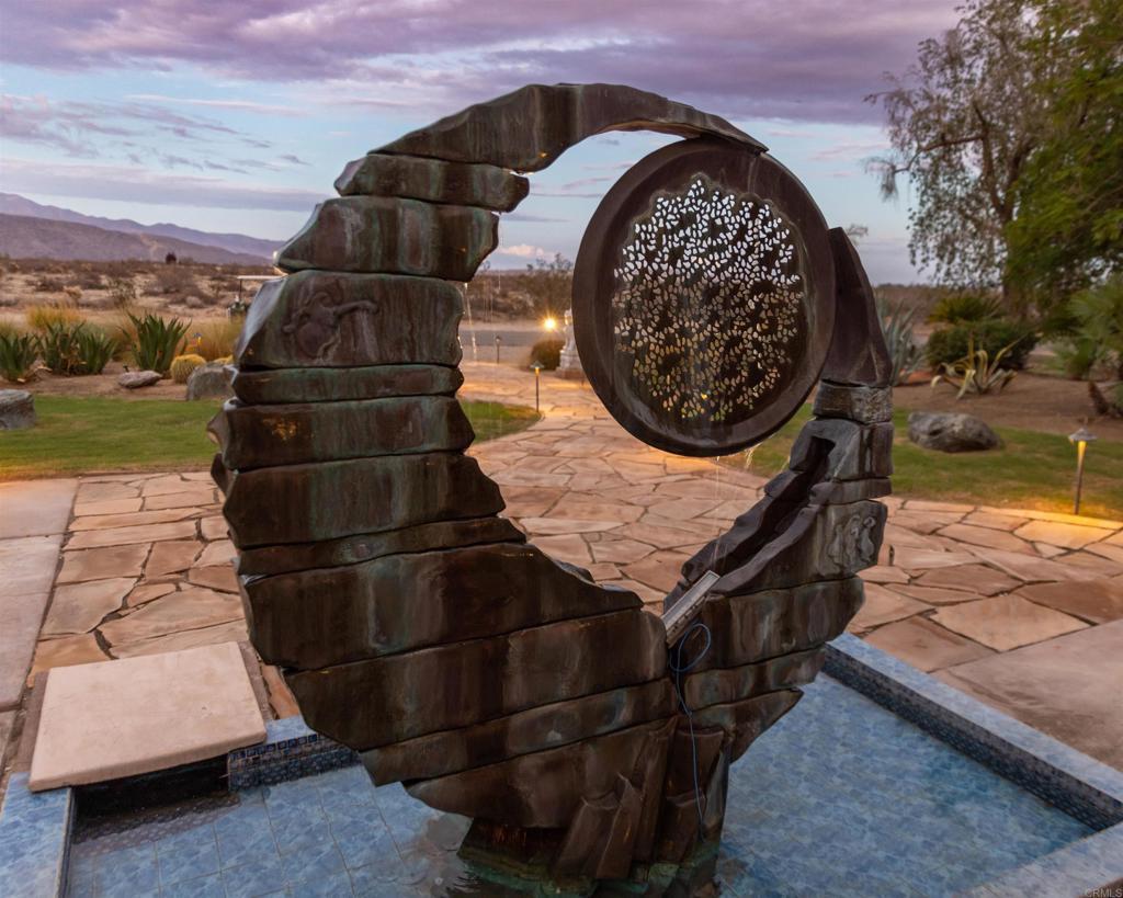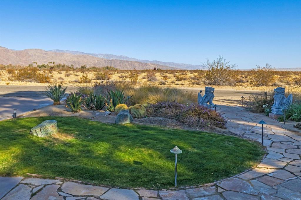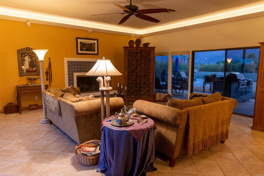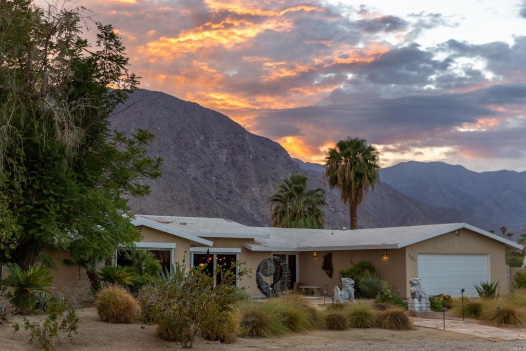 Lovely Moroccan inspired home located in the De Anza Golf Estates. Landscaping, fountain, BBQ and gates all custom designed by renowned metal sculptor John Richen. Granite counter tops, newer appliances, new AC, metal security shutters on all windows. Stunning views from both front and back of the desert, golf course and surrounding mountains. Featuring 3 bedrooms, 2 bathrooms with master suite on the other end of the house for privacy. Includes neighboring lot for a total of 0.82 acre giving plenty of room for a pool, guest house, RV parking, etc.