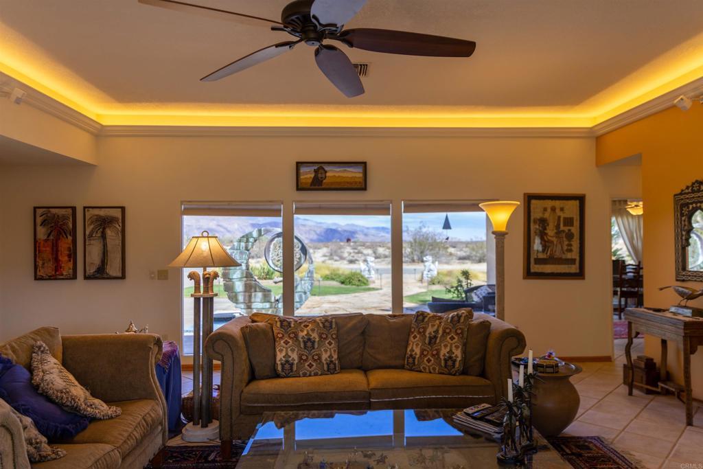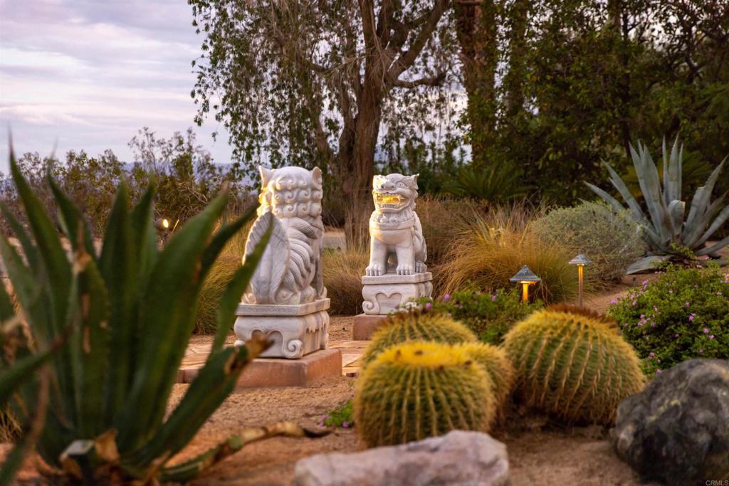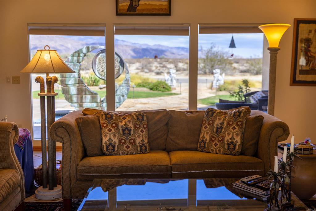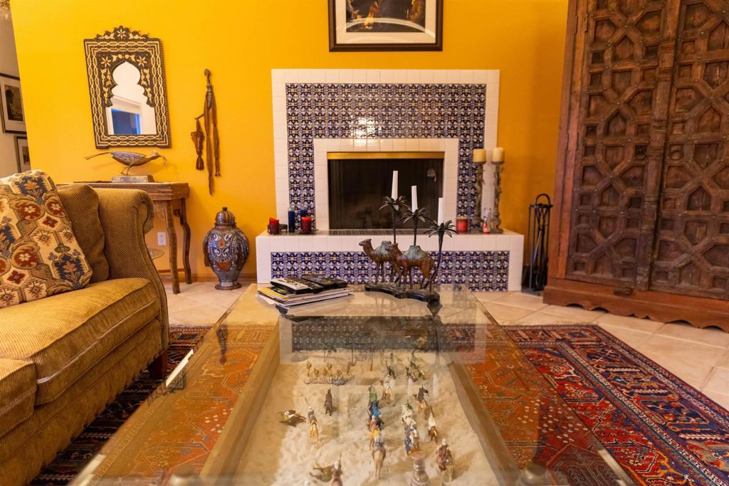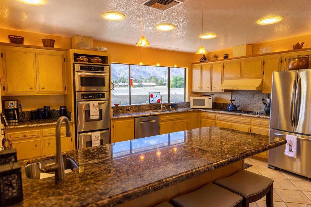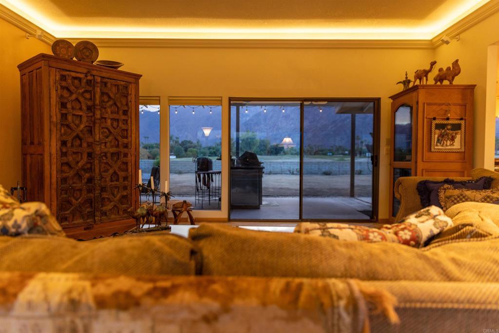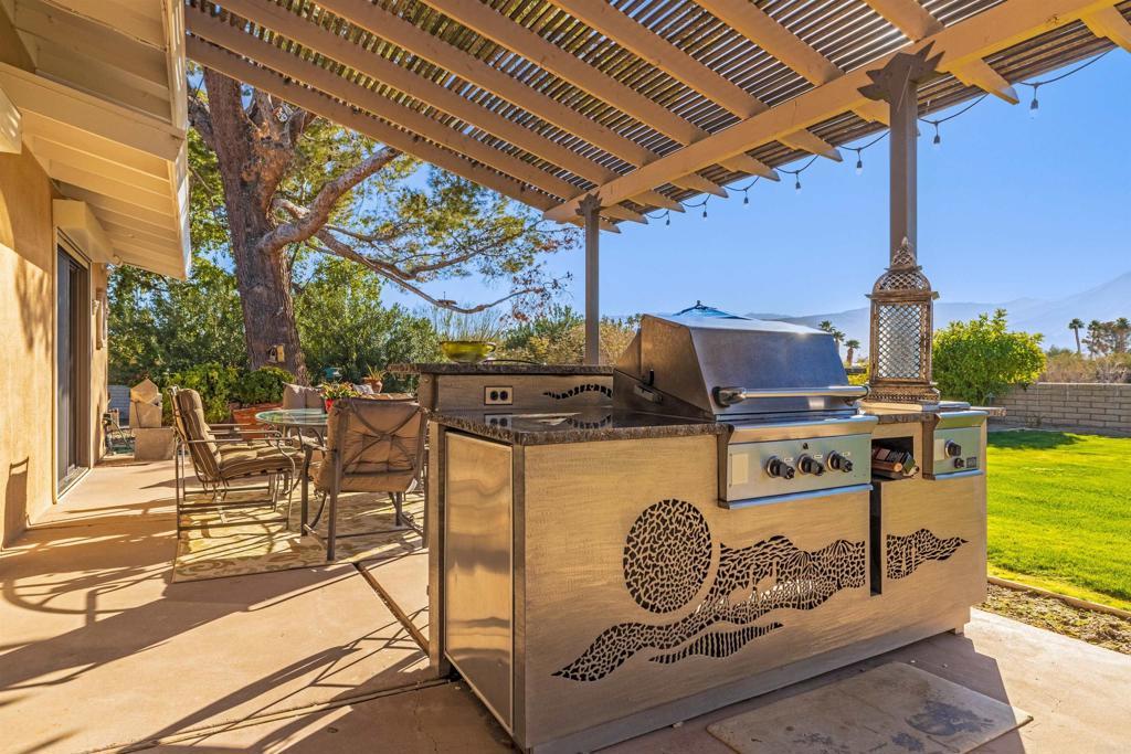 Lovely Moroccan inspired home located in the De Anza Golf Estates. Landscaping, fountain, BBQ and gates all custom designed by renowned metal sculptor John Richen. Granite counter tops, newer appliances, new AC, metal security shutters on all windows. Stunning views from both front and back of the desert, golf course and surrounding mountains. Featuring 3 bedrooms, 2 bathrooms with master suite on the other end of the house for privacy. Includes neighboring lot for a total of 0.82 acre giving plenty of room for a pool, guest house, RV parking, etc.