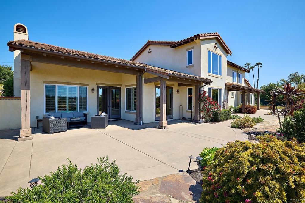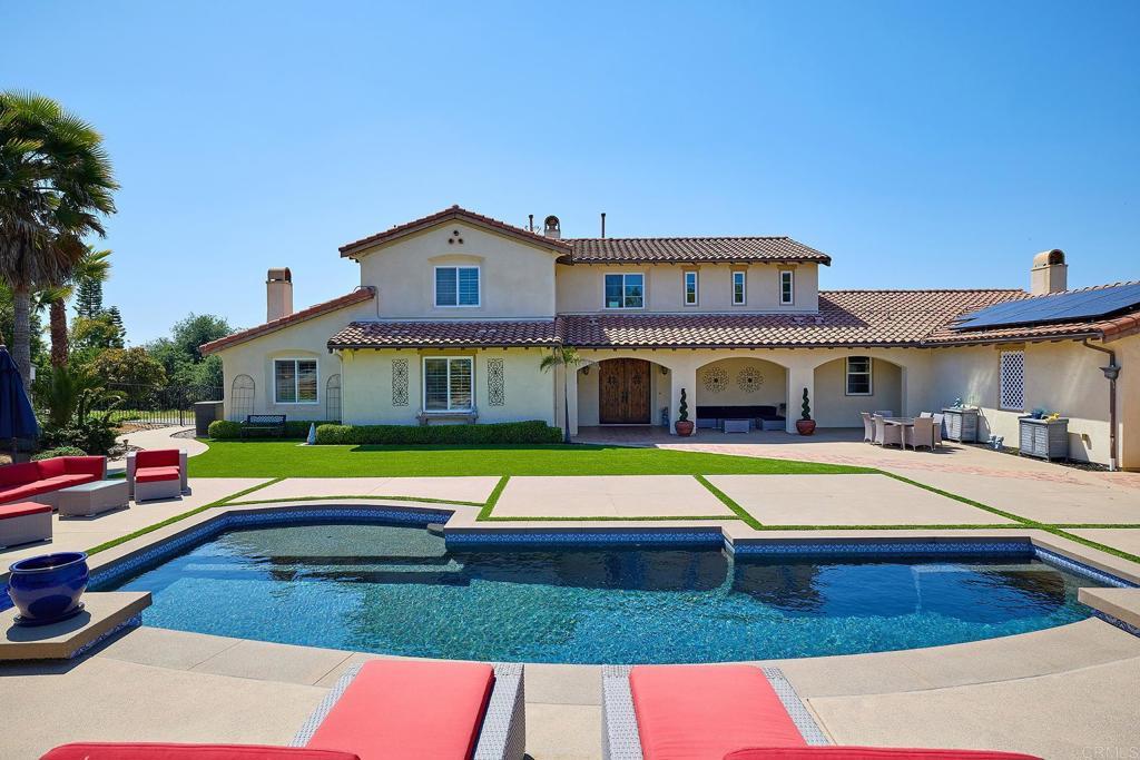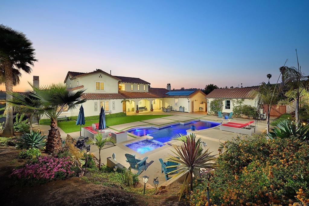 Tucked away in the rolling hills of Bonsall, this exceptional estate offers a rare blend of elegance, seclusion, and resort-style living. Privately set at the end of a quiet cul-de-sac, the 2.01-acre property captures panoramic vistas, coastal breezes, and an unparalleled sense of tranquility. Designed for both sophistication and comfort, the residence features 4 expansive bedrooms and 3.5 bathrooms. Soaring ceilings, abundant natural light, and three stately fireplaces create an inviting atmosphere throughout. The primary suite is a true sanctuary, complete with a spa-inspired ensuite showcasing a custom shower, jetted tub, and oversized walk-in closet. Entertain with ease in the gourmet kitchen, boasting a generous island, dual ovens, and seamless flow to outdoor living spaces—perfect for savoring iconic Bonsall sunsets. Multiple patios, a sparkling saltwater pebble tech pool with Baja shelf, spa, and soothing fountains invite relaxation and gatherings alike. Additional highlights include a versatile loft adjoining the fourth bedroom and full bath, dual-zoned HVAC, solar power, a 4-car garage, RV parking, and ample acreage with potential for a shop or ADU. With sunrise views from the front porch and golden sunsets from the back patio, this property delivers the essence of Southern California luxury—space, serenity, and a lifestyle defined by privacy and beauty.