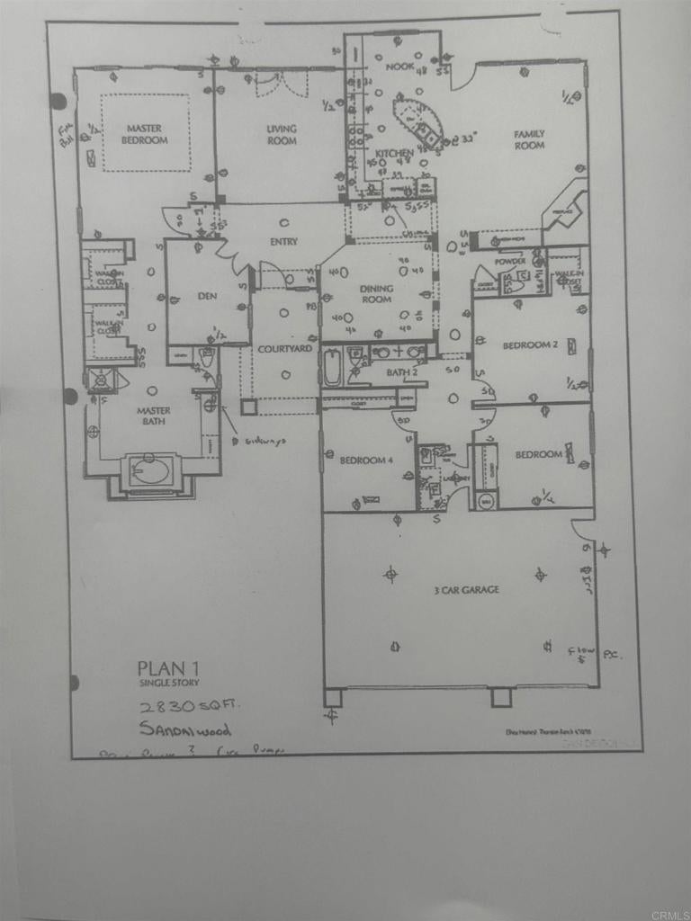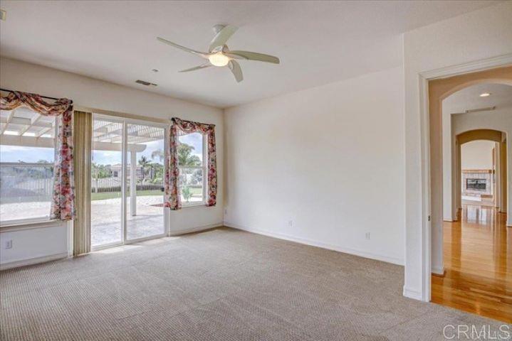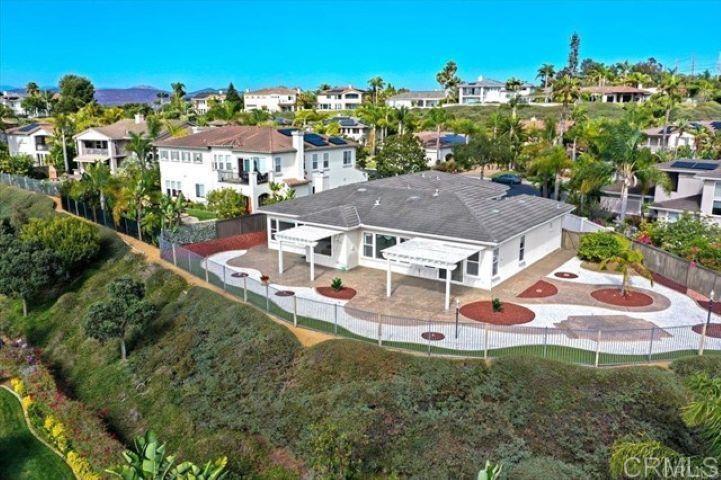 Located in the exclusive gated community of Sandalwood Encinitas, this beautiful, single-level Ocean View Home is located at the end of a serene cul-de-sac on a large 11,808 square foot corner lot. The master bedroom suite is on the south side of the home. All secondary bedrooms are on the north side of the home. Next to the master suite is the library/office. The living room sits directly opposite the entry area. The dining room sits by itself, between the living room and the kitchen/family room area. In the kitchen, there is an island with a sink and eating bar that separates the breakfast area and the family room and fireplace. Down the hall are the three secondary bedrooms and a full bathroom with double sinks. At the end of the hall is the laundry area and the door leading to the epoxy-coated three car garage. This home has a twenty panel Solar Electric System (owned) and two new vertical Air Conditioning units. The backyard features double covered patio areas, garden, and unobstructed wide-angle views to the ocean. The front and rear landscape is low maintenance with artificial turf, stamped concrete and decorative rock.