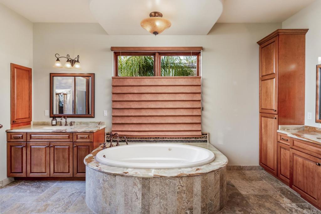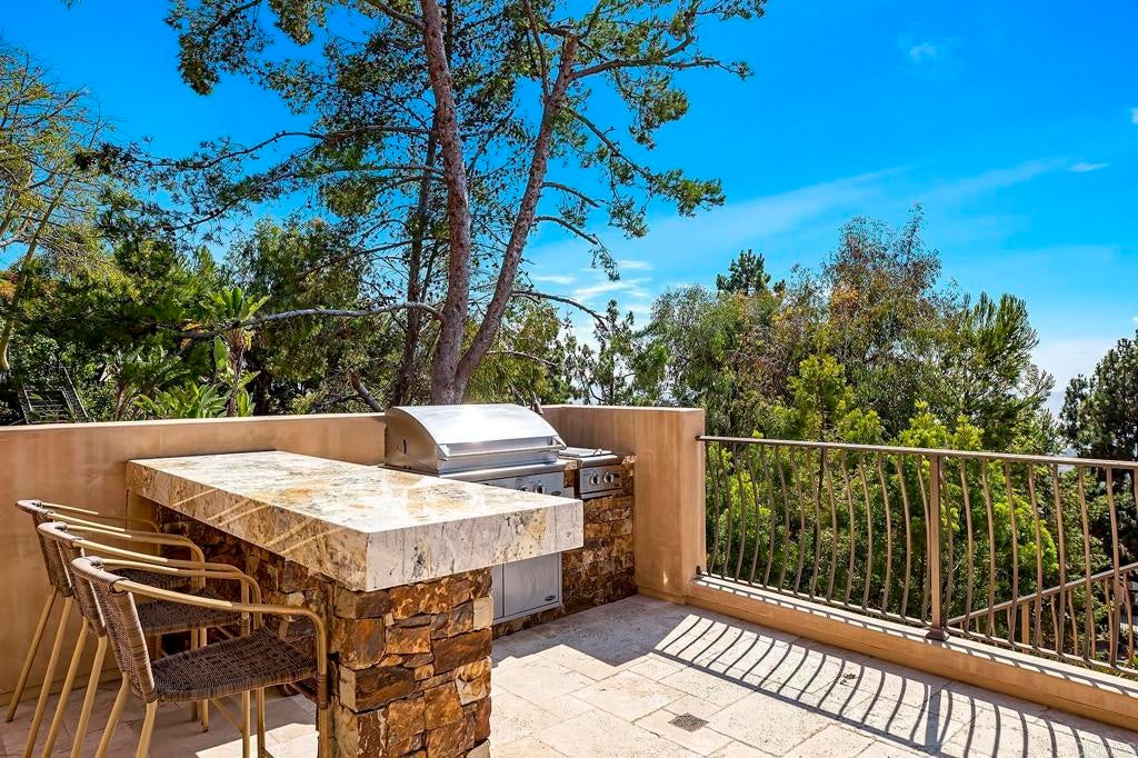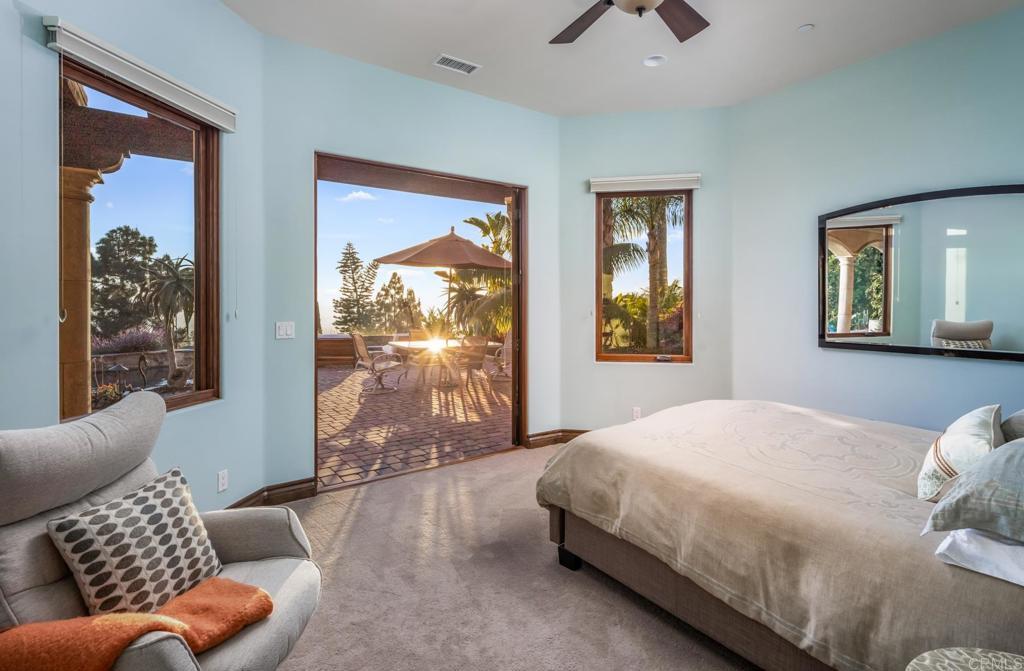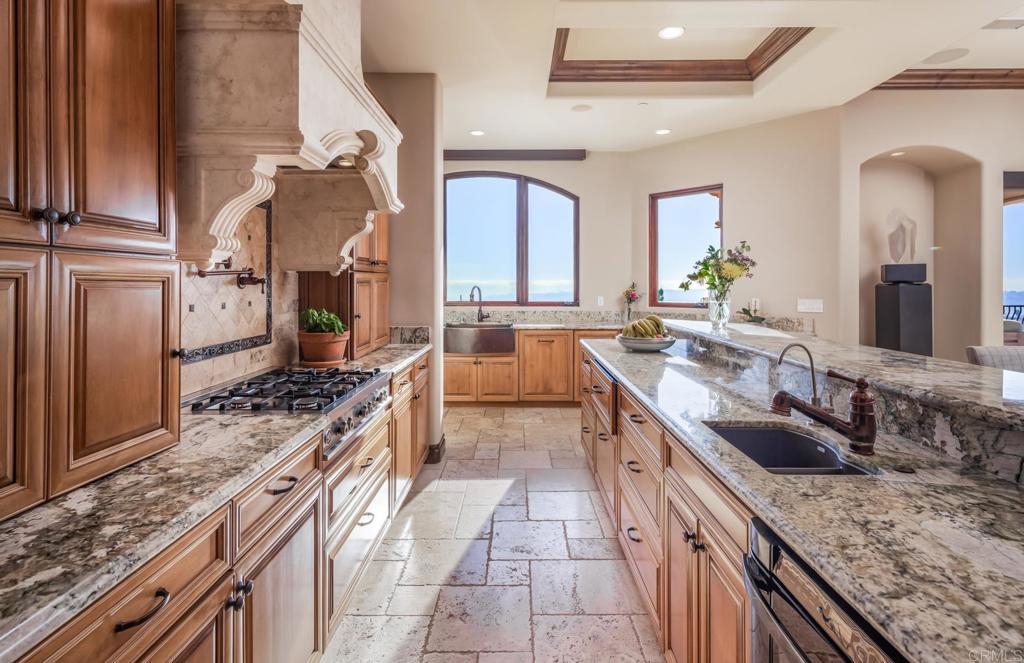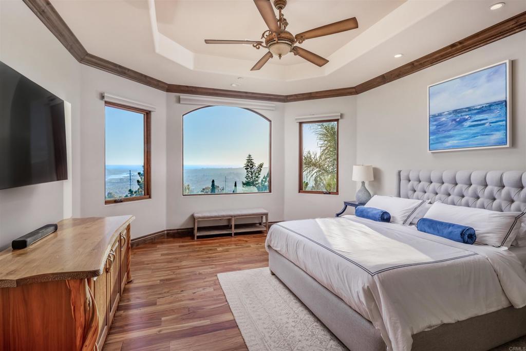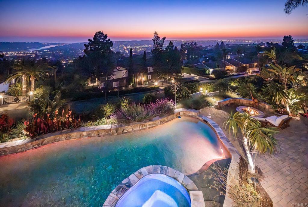 Unrivaled craftsmanship of a 2011-built Italian-Mediterranean estate showcasing a 180-degree lagoon and ocean view within one of Carlsbad’s most desired neighborhoods. Designed by Alex Friehauf, this residence blends artisanal craftsmanship with modern sophistication in an open-concept sanctuary where 15-foot pocket doors dissolve boundaries between refined interiors and 1,450 square feet of covered view decks, perfect for hosting with the backdrop of a vibrant Pacific sunset. Floor-to-ceiling 8-foot windows frame endless vistas of Batiquitos Lagoon, La Costa Resort, and distant Catalina and San Clemente Islands, accentuated by custom hardwood doors, tumbled travertine tiles, and bespoke wrought iron railings. First floor primary bedroom and an open floorplan that bathes every room in natural light, with a smooth Santa Barbara finish exuding timeless allure. The chef’s kitchen, an entertainer’s dream, boasts designer appliances, a prep kitchen, butler’s pantry and numerous custom cabinetry improvements. Outside, a solar-heated saltwater pool and spa, multiple entertainment areas that are complimented by drought-friendly landscaping, a thriving fruit orchard (passion fruit, peach, mango, fig, orange, plum, avocado, lemon), a new vegetable garden, and a greenhouse. A Buddha fountain and front waterfall whisper tranquility, while a terraced lot—city-approved for an ADU or potential tennis/sport court—offers additional possibilities. The primary suite indulges with hardwood floors, expansive walk-in closet with custom cabinetry, a soaking tub, newer steam shower and sauna. Recent improvements include a whole-house filtration system, Sonos surround sound, Leutron LED lighting system, custom window shades, three-zone HVAC, tankless water heaters, and solar electric system for unmatched efficiency. CAT6 wiring and a new security system keep you connected and secure. Storage is extraordinary, with a 3.5-car garage, utility “toy” garage, all with epoxy floors and additional under-house storage. The pinnacle of modern luxury. Ready for its next visionary owner to cherish North County’s most iconic views.