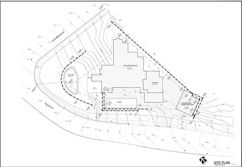 In Coastal Encinitas, this private Leucadia lot sits West of the 5 freeway with potential for ocean views. This ideal location is just a 1/2 mile to the sand at Beacons beach, and a short distance to 101 eateries and shops! Great opportunity to build with the architectural plans already completed or make custom changes to your liking. Renderings show a sophisticated single story with over a 3300 sq.ft. main residence, 3 car garage, plus a detached ADU appox 534 sq,ft,, all perfectly situated on just under 15,000 sq.ft. lot designed to capture the lovely views. No HOA and no Mello-Roos. Great lot ready for development or your fabulous, beach house dream. Adjacent lot #2 is also available together or separately. Construction financing is available....