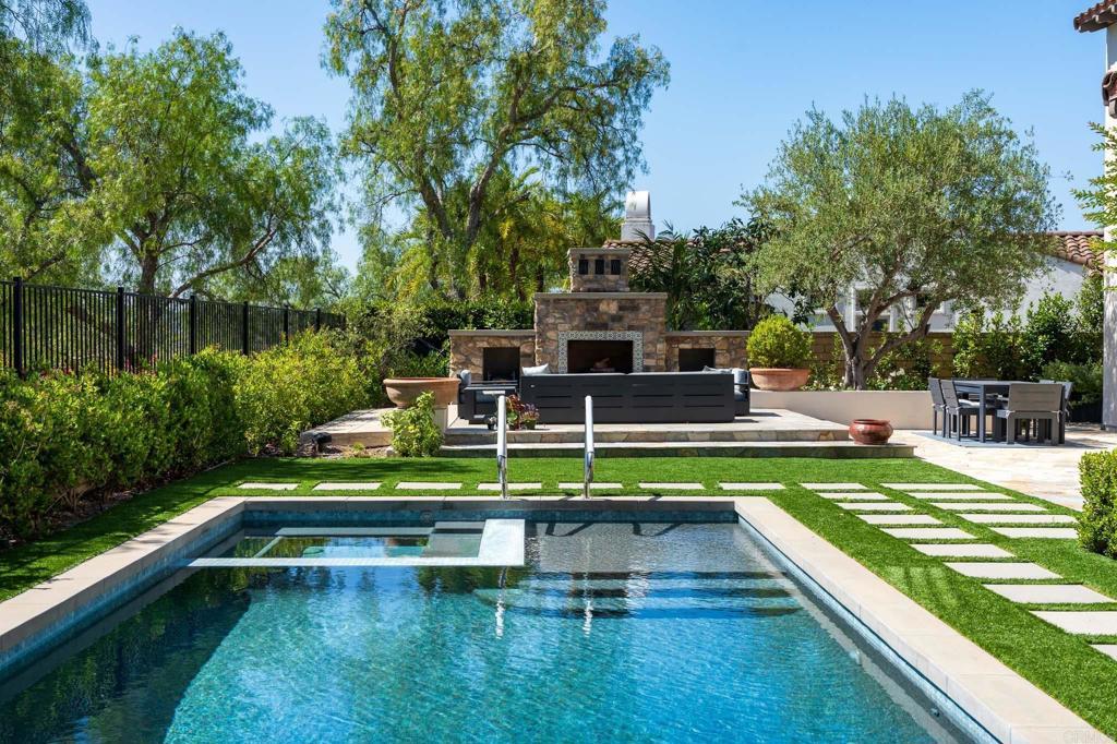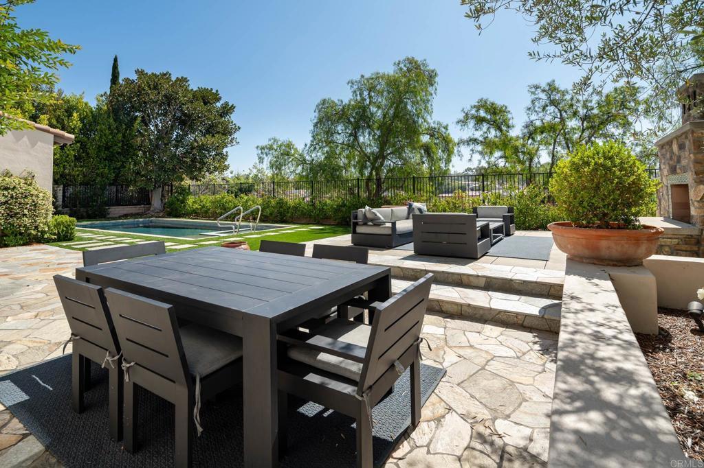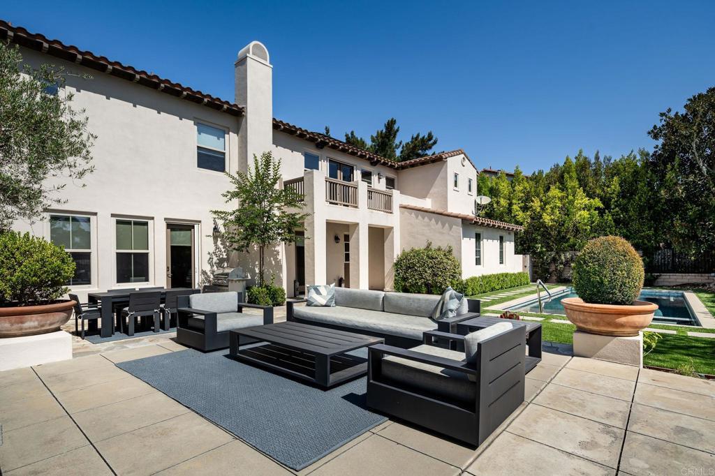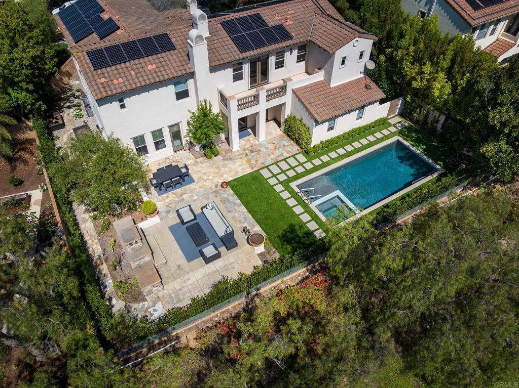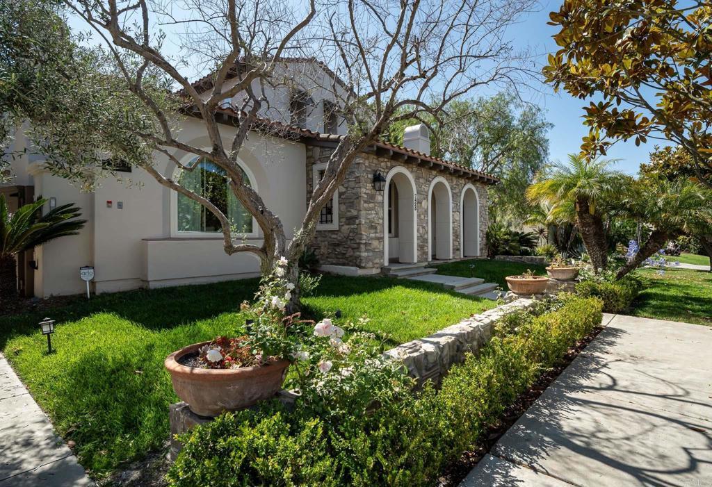 Nestled in the highly sought-after gated community of Mirasol, this beautifully updated 3,975 sq. ft. residence offers a light-filled, open floor plan ideal for modern living and entertaining. Set on a premium lot with mountain and countryside views, the home showcases timeless, neutral finishes and a thoughtful layout designed for both comfort and elegance. Upon entry, you're welcomed into an inviting space featuring high ceilings, custom architectural details, and high-end finishes throughout. The main level offers a formal living room with fireplace, an elegant dining room with built-in cabinetry and fireplace, an office/library, and a spacious family room that flows seamlessly into the gourmet kitchen. Perfect for any discerning chef, the kitchen features a large center island, stone countertops, top-tier stainless steel appliances, a butler’s pantry, wine storage, and a generous casual dining area. Doors open to a private outdoor oasis complete with a sun-drenched pool and spa, an outdoor fireplace, and multiple areas for lounging and dining—ideal for morning coffee, afternoon relaxation, or evening entertaining. Mature landscaping enhances the peaceful, resort-style ambiance. Upstairs, the expansive primary suite offers a private deck, a spa-inspired bath, and a large dressing room. Two additional bedroom suites and a versatile loft/bonus room provide flexible space for children, guests, or extended family. Additional features include: custom wood and stone flooring; designer lighting and fixtures; Rich woodwork and cabinetry; freshly painted interior and exterior; custom window treatments; whole-house and pool solar systems; gated motor court and 4-car garage with ample storage. Residents enjoy proximity to the lifestyle amenities of Santaluz, along with easy access to top-rated schools, fine dining, shopping, beaches, and major freeways.