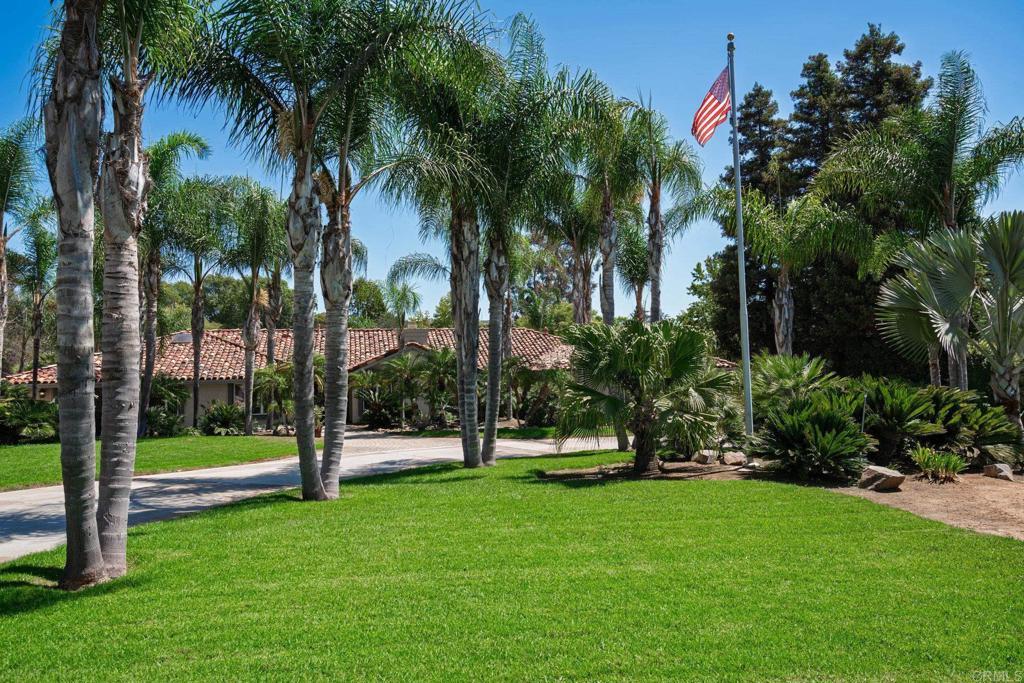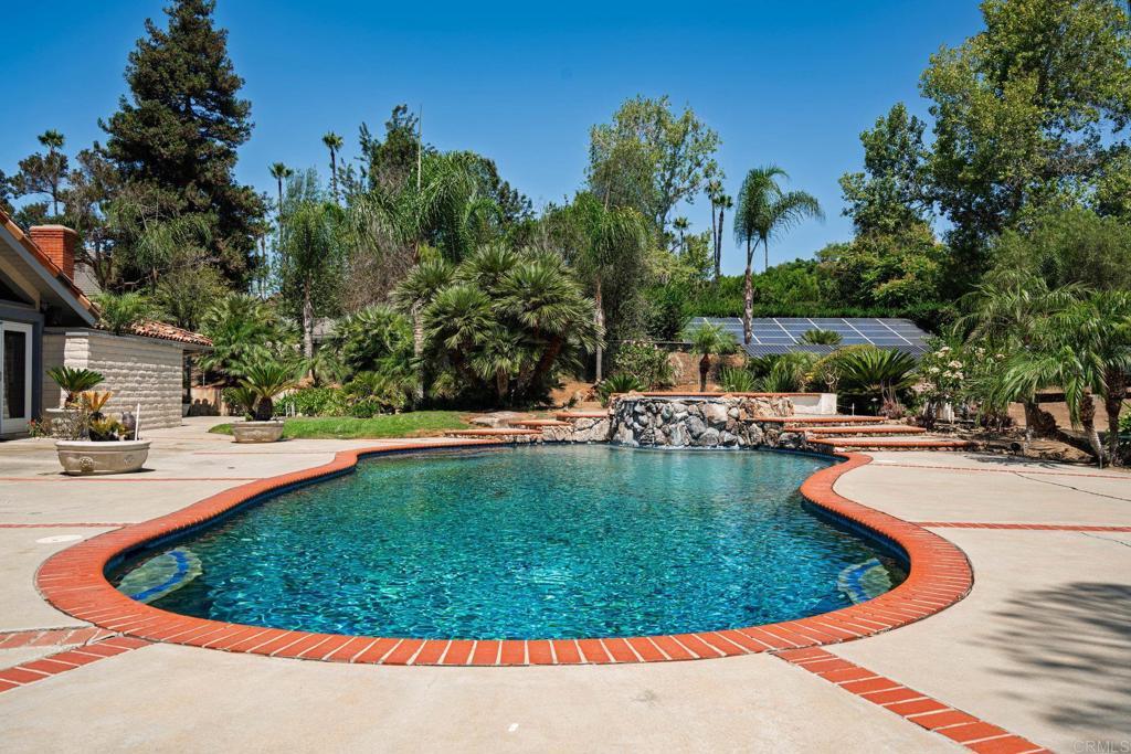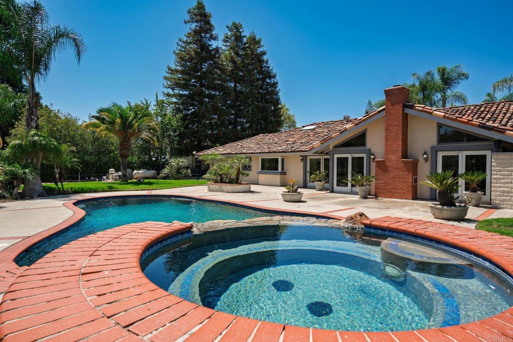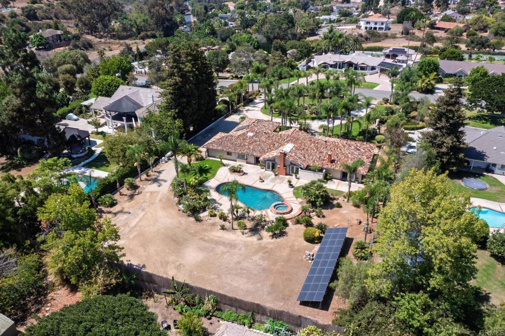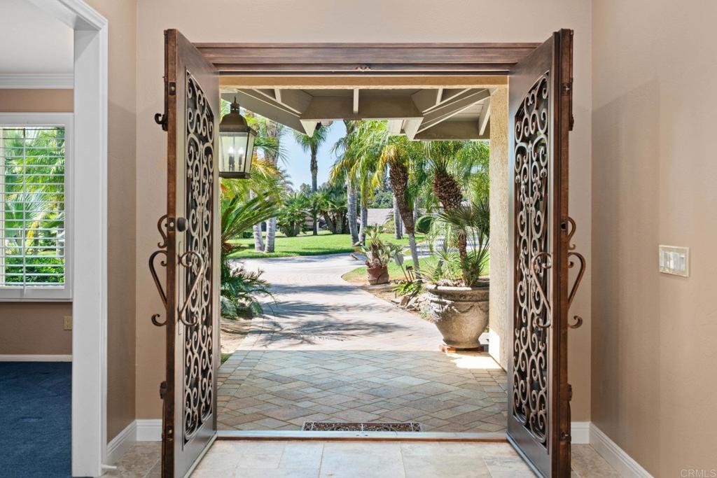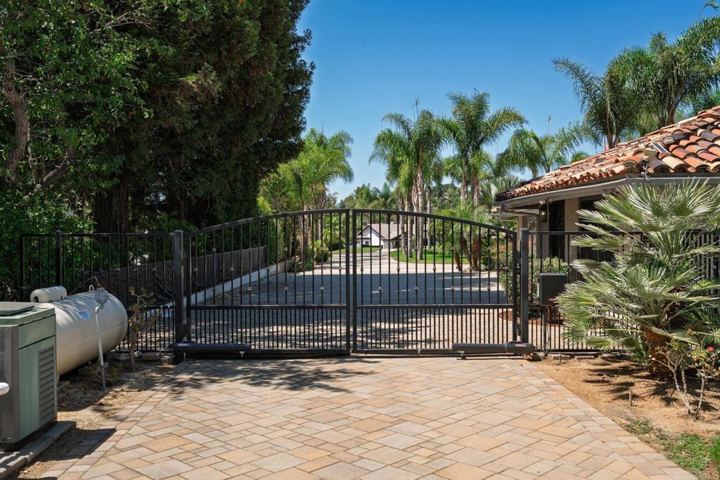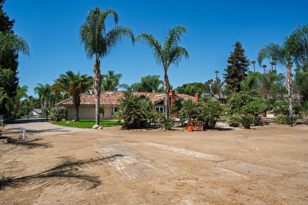 Welcome to this stunning single-story estate on one of Vista’s most sought-after streets set on nearly an acre (.95) with a circular driveway, and a private automatic gate leading to the saltwater pool and huge backyard. This 4-bedroom, 3.5-bathroom home offers exceptional privacy, space, and luxury. A 3-car garage with a convenient half bath, 30 panel solar system, well for landscaping, whole house fan, and water filtration system add to the home’s functionality and efficiency. Plenty of space is available for an ADU, RV, or recreational toys. Step through the custom double front doors into a bright and open floor plan designed for both entertaining and everyday living. The formal dining room features built-in display cabinetry, while the living room offers a cozy fireplace. The spacious family room boasts vaulted ceilings, skylights, track lighting, a ceiling fan, a fireplace, and a wet bar with a refrigerator. The chef’s kitchen is beautifully appointed with Dacor double ovens, a Sub-Zero refrigerator, an ice maker, a Viking cooktop on the center island, a breakfast nook and a garden window overlooking the sparkling saltwater pool and backyard. The primary suite is a true retreat with two closets, a fireplace, and direct access to the backyard. The spa-like primary bathroom includes a separate shower and soaking tub, Toto toilet and bidet, and views of the private atrium. Additional bedrooms are complete with ceiling fans, while the laundry room includes a utility sink. Upgrades such as stone flooring, plantation shutters, crown molding, soft fit ceilings, retractable screen doors, automatic window shades, and recessed lighting complement the home’s timeless style. Mature landscaping with gorgeous palm trees surrounds this one-of-a-kind estate, creating a tranquil and private setting. A true jewel in Vista, rarely available and impossible to duplicate.