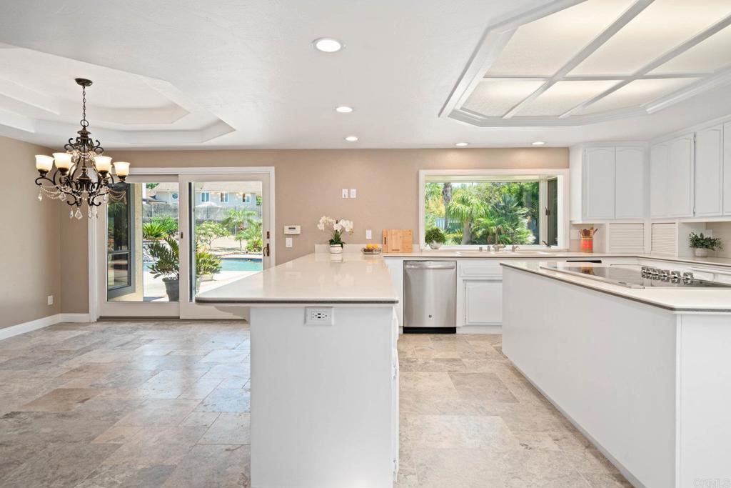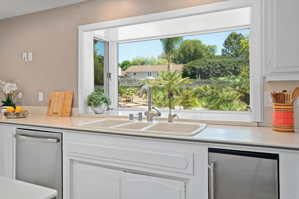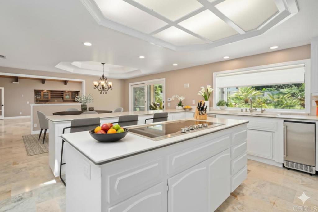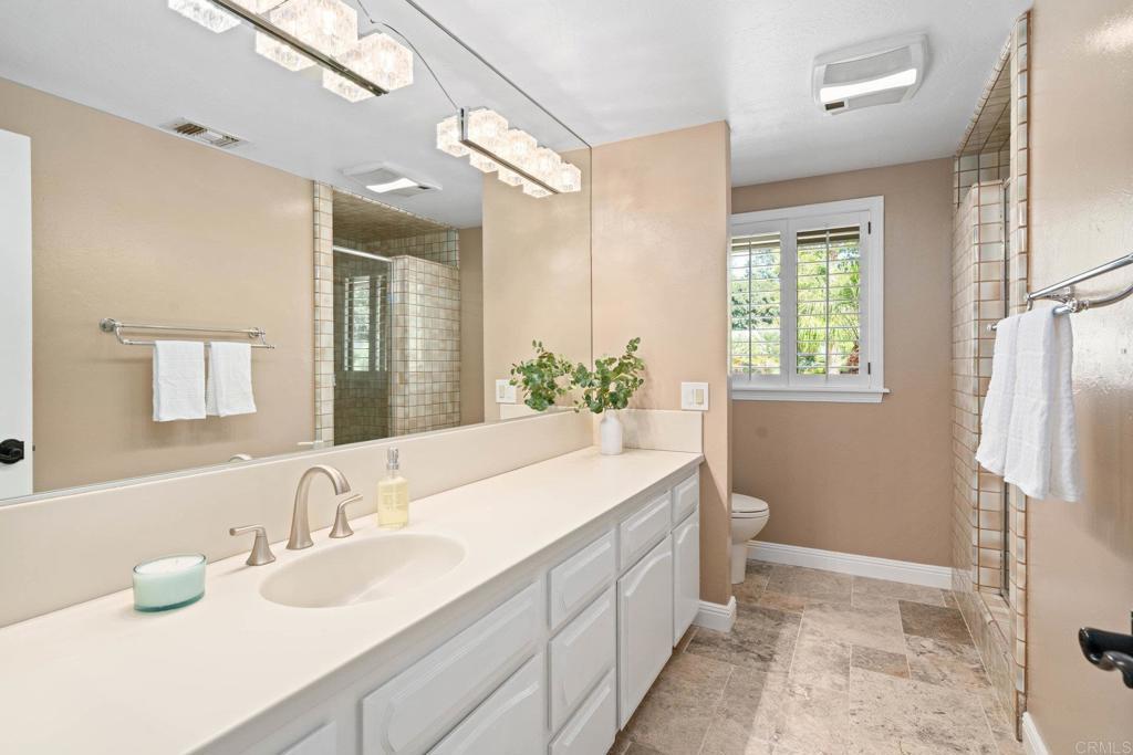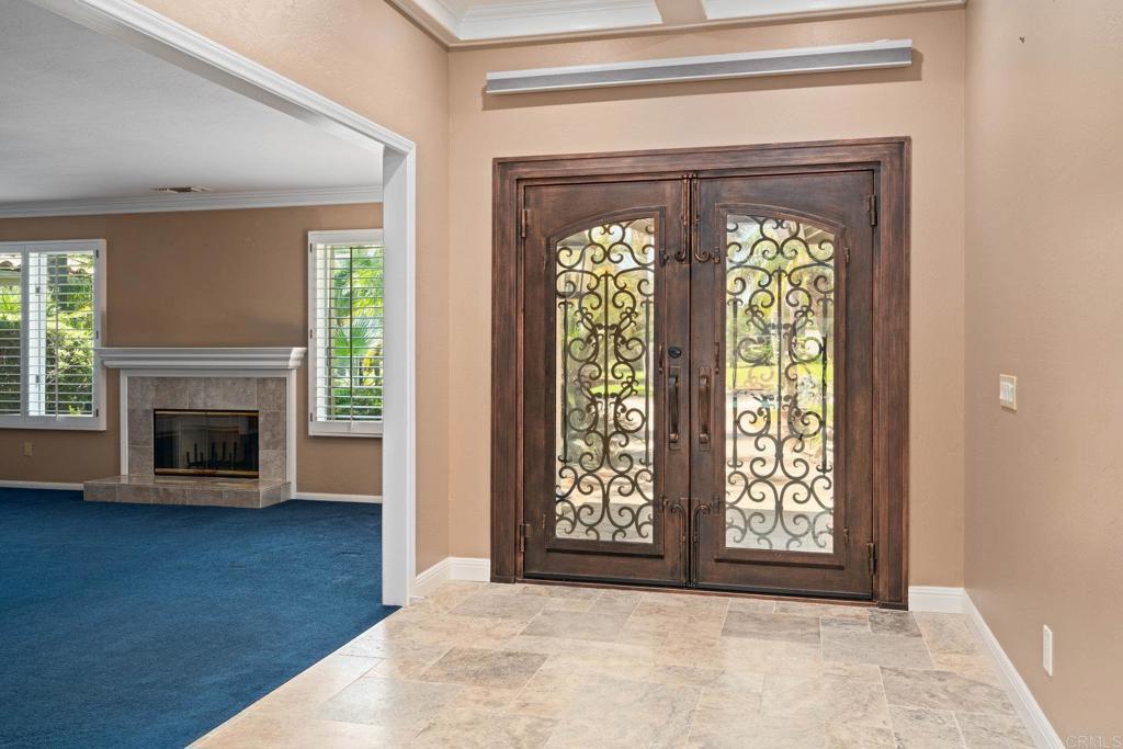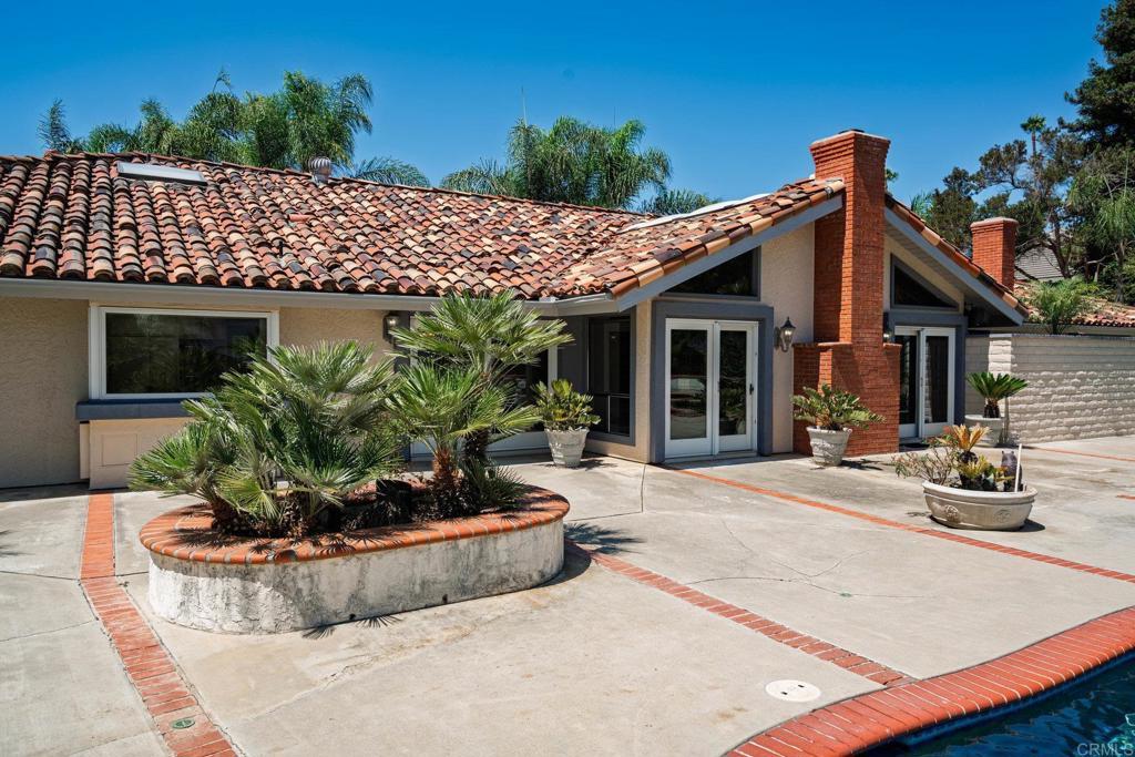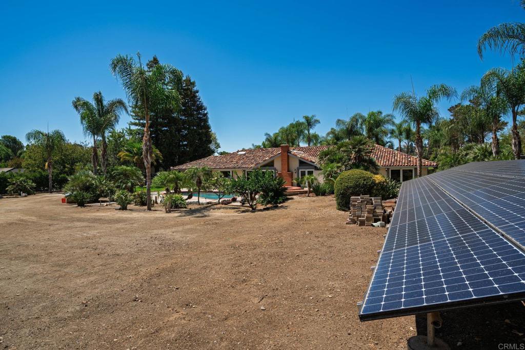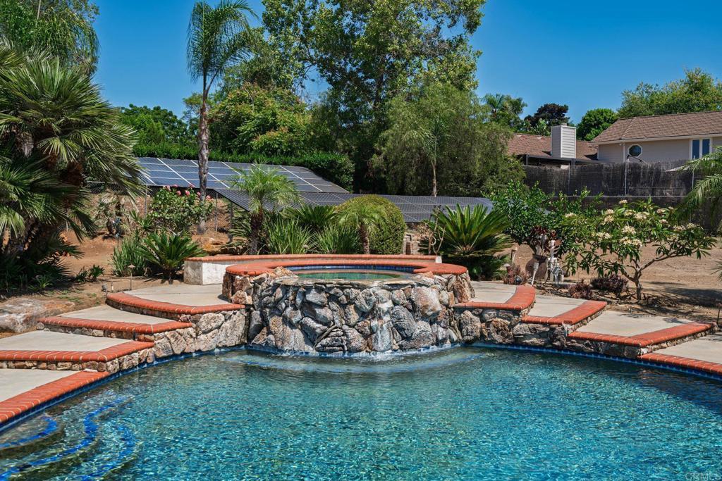 Welcome to this stunning single-story estate on one of Vista’s most sought-after streets set on nearly an acre (.95) with a circular driveway, and a private automatic gate leading to the saltwater pool and huge backyard. This 4-bedroom, 3.5-bathroom home offers exceptional privacy, space, and luxury. A 3-car garage with a convenient half bath, 30 panel solar system, well for landscaping, whole house fan, and water filtration system add to the home’s functionality and efficiency. Plenty of space is available for an ADU, RV, or recreational toys. Step through the custom double front doors into a bright and open floor plan designed for both entertaining and everyday living. The formal dining room features built-in display cabinetry, while the living room offers a cozy fireplace. The spacious family room boasts vaulted ceilings, skylights, track lighting, a ceiling fan, a fireplace, and a wet bar with a refrigerator. The chef’s kitchen is beautifully appointed with Dacor double ovens, a Sub-Zero refrigerator, an ice maker, a Viking cooktop on the center island, a breakfast nook and a garden window overlooking the sparkling saltwater pool and backyard. The primary suite is a true retreat with two closets, a fireplace, and direct access to the backyard. The spa-like primary bathroom includes a separate shower and soaking tub, Toto toilet and bidet, and views of the private atrium. Additional bedrooms are complete with ceiling fans, while the laundry room includes a utility sink. Upgrades such as stone flooring, plantation shutters, crown molding, soft fit ceilings, retractable screen doors, automatic window shades, and recessed lighting complement the home’s timeless style. Mature landscaping with gorgeous palm trees surrounds this one-of-a-kind estate, creating a tranquil and private setting. A true jewel in Vista, rarely available and impossible to duplicate.