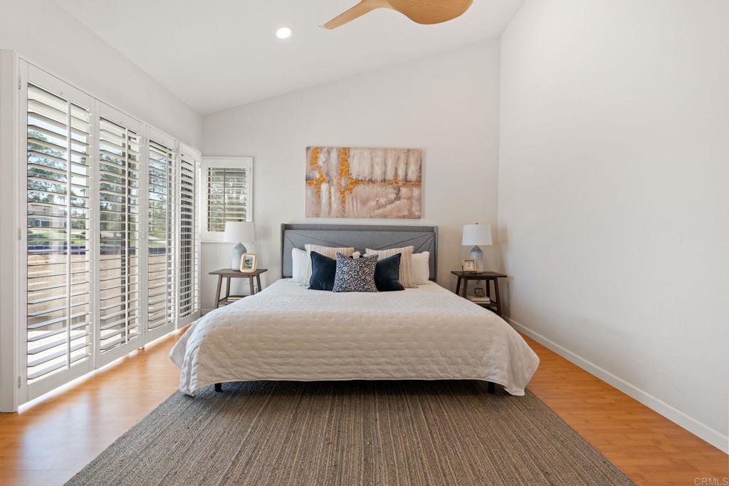 Welcome to your dream home at 12152 Royal Birkdale Row, Unit B, nestled in the gated community of Master Hill and perfectly situated on the 1st hole of the golf course. This exceptional 5-bedroom, 3-bathroom residence spans 1,939 square feet of elegance and offers breathtaking golf course and mountain views from the backyard. Thoughtfully designed for comfort and style, the home features two bedrooms on the main floor and three upstairs. Enjoy luxurious living with hardwood floors, two cozy fireplaces, and a kitchen that's been beautifully updated with new flooring, quartz countertops, and stunning cabinets. Shutters add a touch of elegance throughout. Plus, an attached garage and in-unit washer/dryer make everyday living a breeze. The HOA provides Spectrum high-speed internet/cable, water, trash, and maintenance of the roof, stucco, and wood. In addition, enjoy access to three pools and three spas, and take advantage of the membership at The Community Association at Bernardo Heights, featuring a junior Olympic swimming pool, tennis and pickleball courts, a grill area, and a clubhouse with a weight room, meeting room & game room. This home perfectly blends luxury and leisure, making it an ideal sanctuary for you and your loved ones. Welcome home!