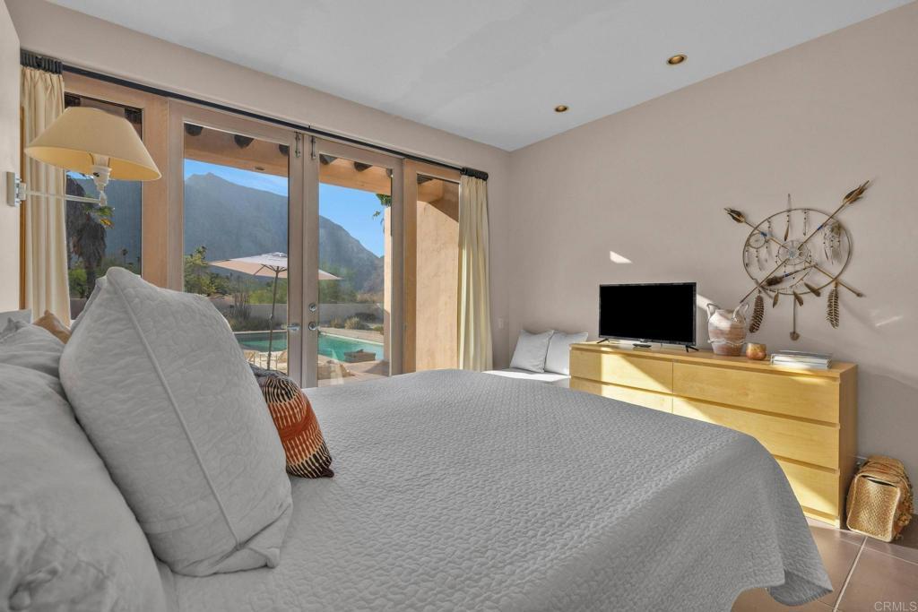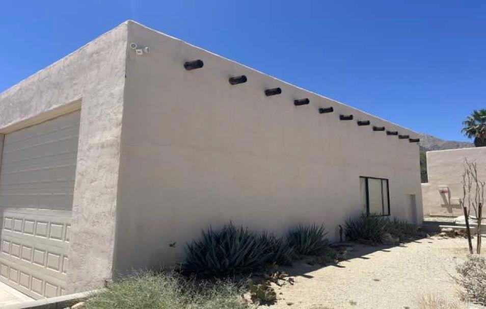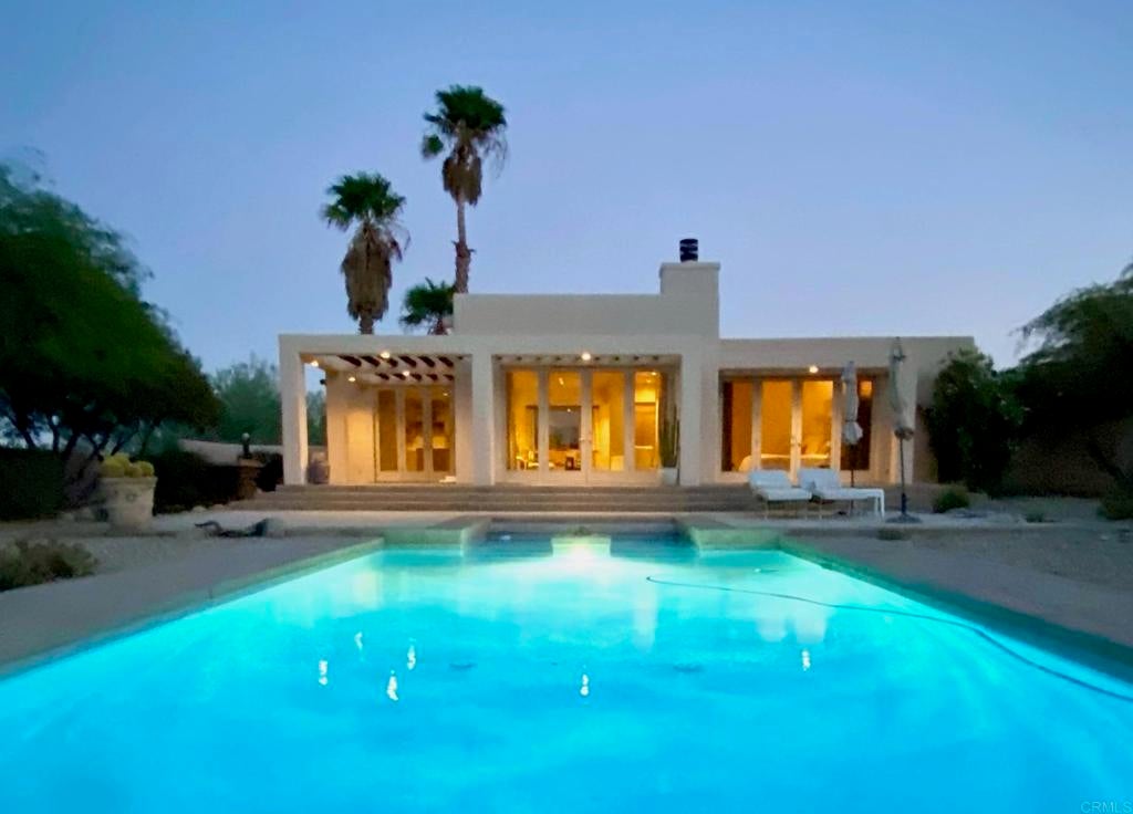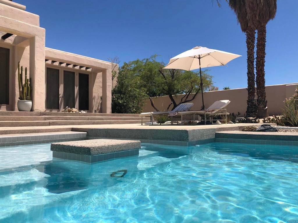 Exceptional Desert Retreat with Custom Architectural Details & Adjacent Lot in Verbena Estates area on 2.21 acres. Private resort-like desert retreat with expansive walled compound is surrounded by beautiful gardens, a perfectly framed view of Indian Head Mountain and Panoramic desert views including gorgeous sunsets over the Santa Rosas. Designed by renowned Laguna Beach Architect this stunning residence showcases custom floor to ceiling windows, doors and skylights that engulf you in the light, peace and beauty of the desert. The open-plan living area with 9 and 10-foot ceilings, 'Santa Barbara' finished walls inside and out, extensive recessed lighting-many on dimmers, built-in speakers-ideal for entertaining indoors and out. The bathrooms feature elegant limestone counters, handmade tile showers and tubs, and designer quality fixtures and lighting. Enjoy seamless indoor-outdoor living with expansive concrete patios, a built-in BBQ area, extensive outdoor lighting and the contemporary 16x32ft. pool. All surrounded by professionally designed landscaping and dramatic mountain views. The property includes a two-car garage plus a detached, extra-large garage-perfect for a potential ADU, RV or all your desert toys. On 2+ Acres experience the best of desert living in this superior location just minutes from shops, dining, Borrego Palm Canyon Trail, and endless outdoor adventure. Walk to the historic Palms Hotel for dining, live music and cocktails. Enjoy spectacular wildflower displays in spring and spectacular star gazing at night. This is truly a one-of-a-kind opportunity—schedule your private showing today! -Owned Solar -Revenue potential as a Vacation Rental in a town that supports VRBO’s which is rare! -No HOA'S -New Kohler Toilets, Bosch dishwasher, microwave, cooktop & oven. -Designer walled compound.