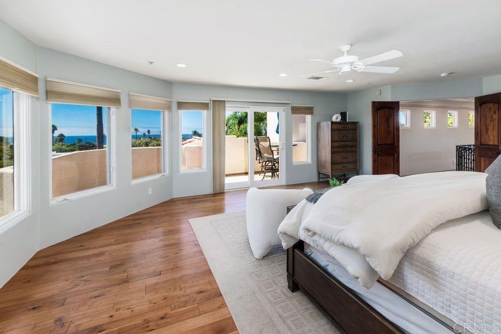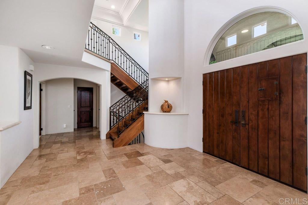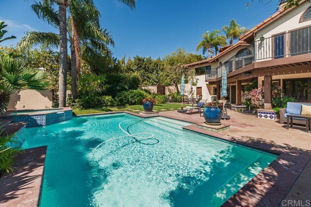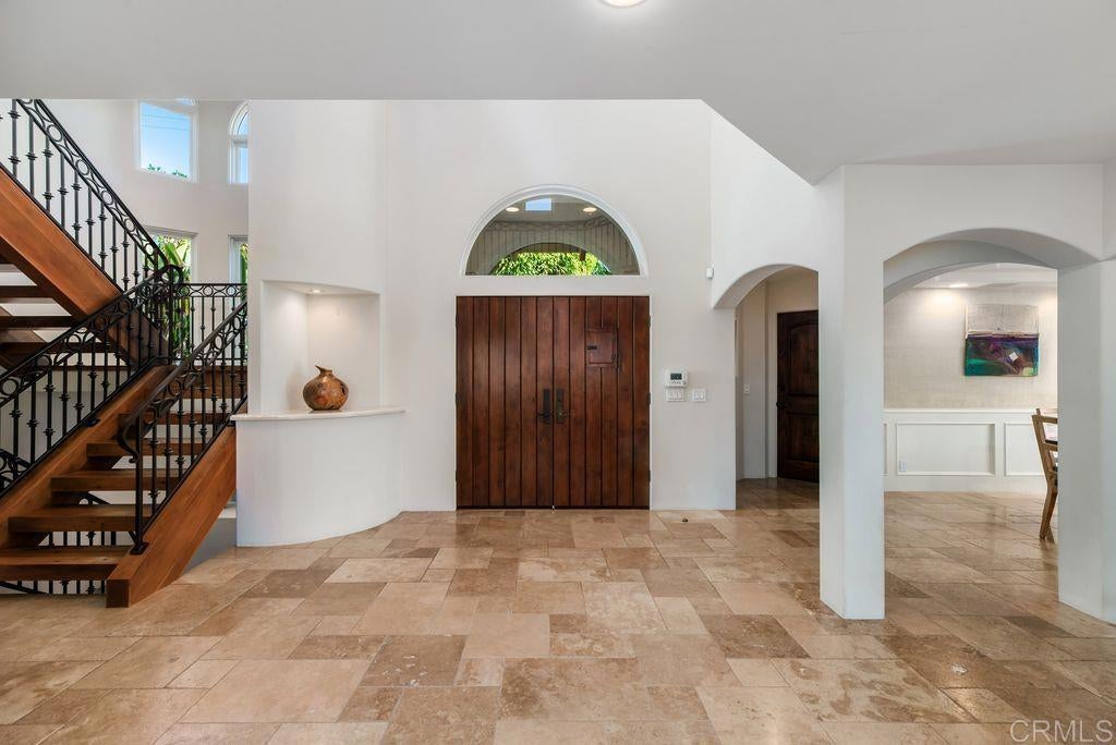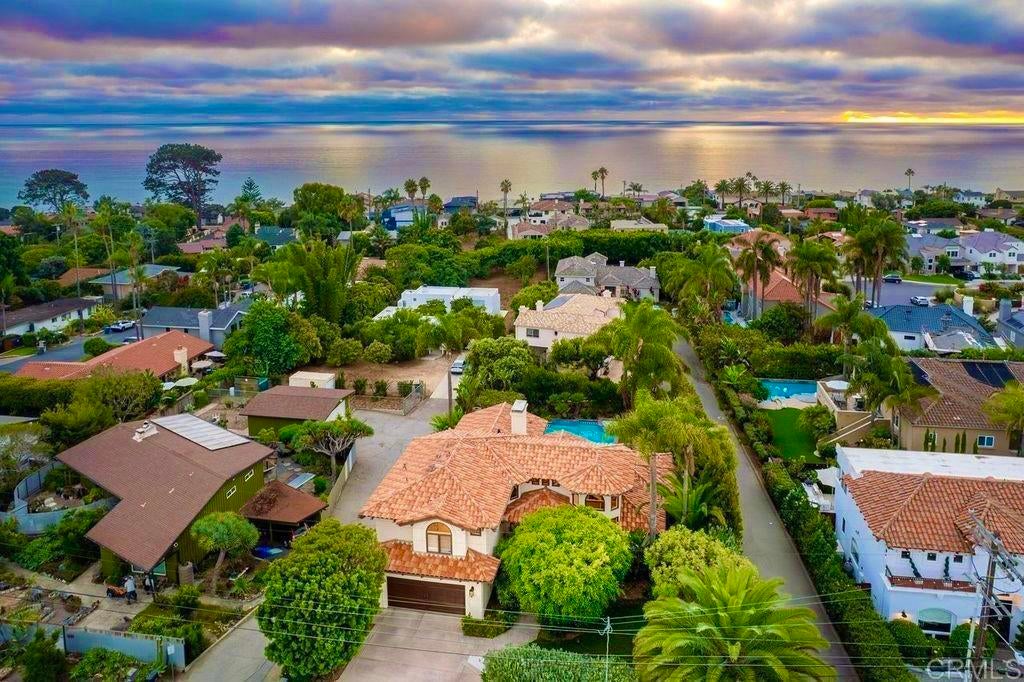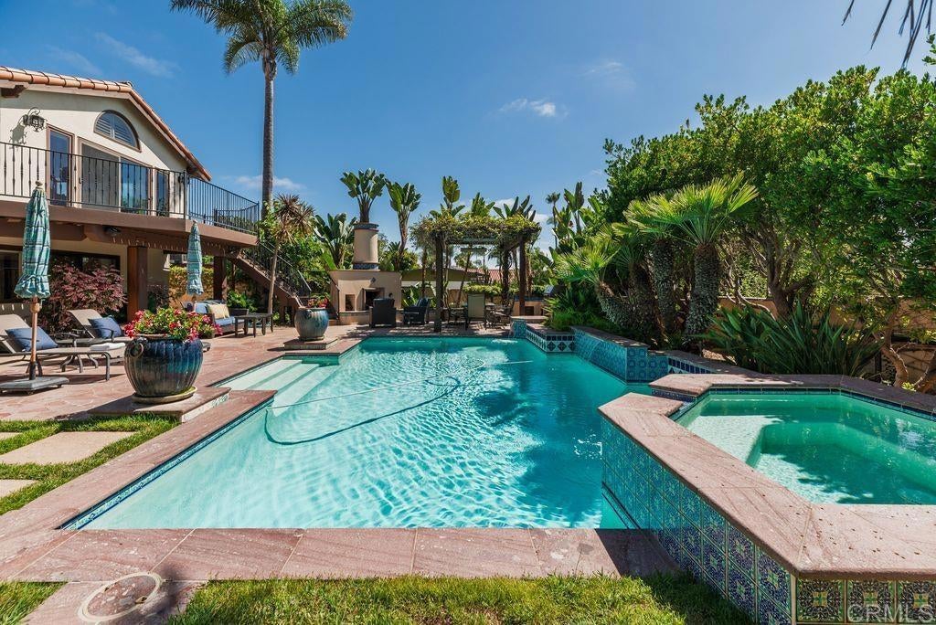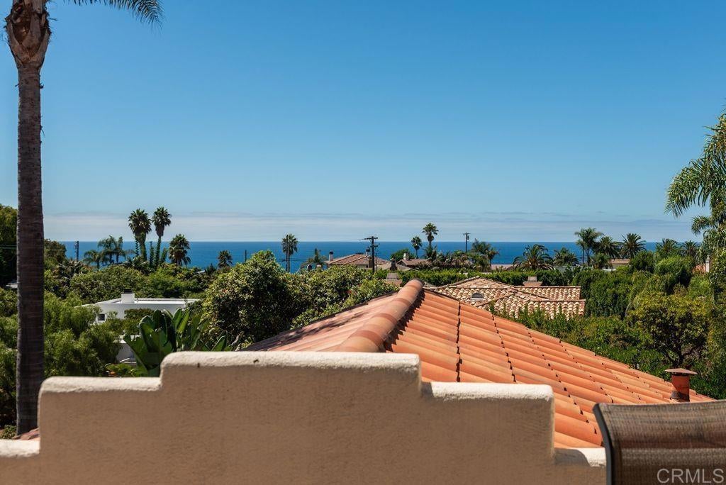 Elegant Mediterranean Villa with Riviera-Style Ambiance in Cardiff’s Coveted Composer District! This residence offers ocean views, lush gardens, pool/jacuzzi with waterfall features. Timeless Architectural Highlights: stone columns flank the double door entry that opens to soaring ceilings, oversized crown molding. Dramatic staircase with wrought iron railings & wood plank steps lead to the mezzanine with ocean views & the soaring entry area...other highlights include art niches and perfectly placed windows bringing in natural light. The rich wood plank floors and tumbled travertine stone offers warmth and elegance. Main floor living offers stone surround fireplaces, open beam ceiling, custom cabinetry and arched windows. The Formal Dining Room is next to the custom designed kitchen, with abundant granite countertop, glass front cabinetry w/ custom hardware and high end appliances. The heart of the home kitchen opens to the family room with open beam ceilings, built in entertainment wall (find the seahorse handles!) Sliding glass door leads to an entertainment deck perfect for indoor outdoor entertaining and a staircase to the pool and gardens. The main floor has a guest bedroom with a charming bay window seat near main level bathroom. Upstairs off the mezzanine is the spacious primary suite and deck with amazing ocean and coastline views. The suite includes a luxurious primary bath plus a large customized walk-in closet. Downstairs are two bedrooms with walk-in closets sharing a Hollywood Jack & Jill bath...Billiards/Game room w/fireplace, and a built-in office area, temperature controlled Wine Cellar plus a full bath & laundry room.... private resort backyard w/ fireplace, outdoor kitchen with BBQ, and a charming trellis covered dining area surrounded by mature palms and birds of paradise.