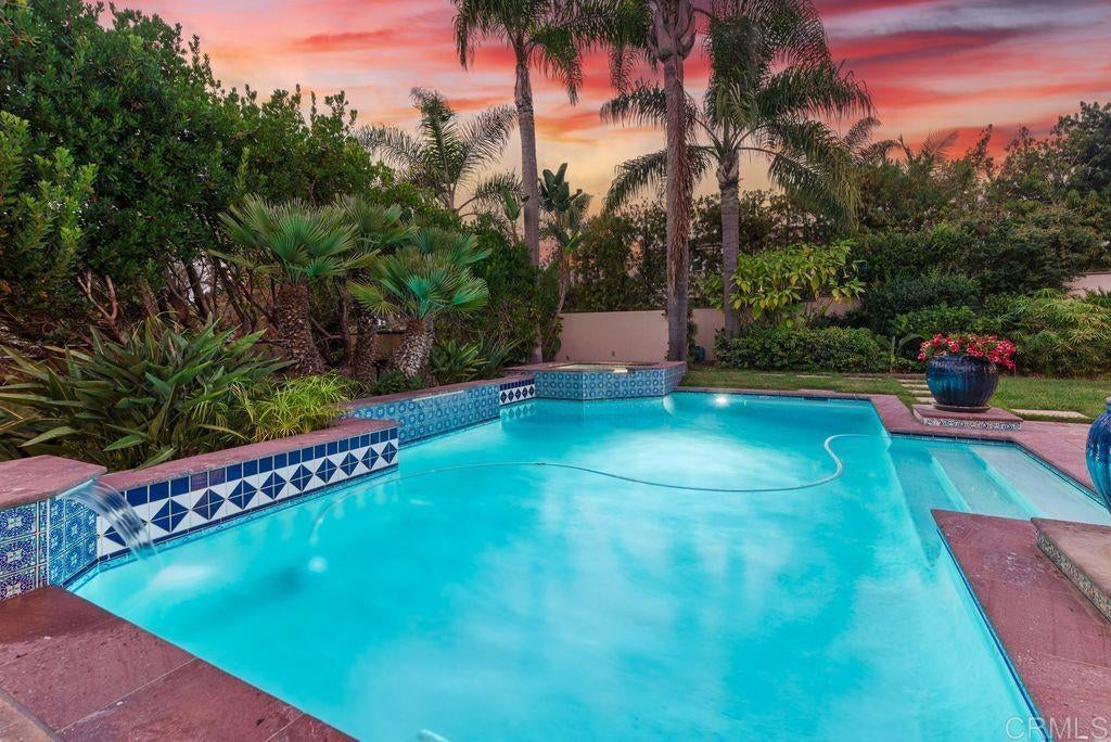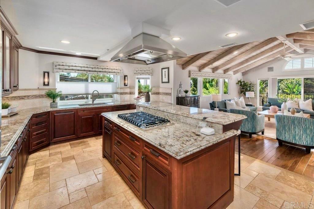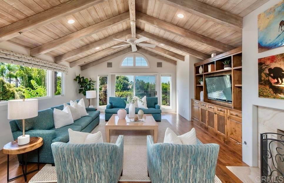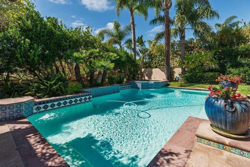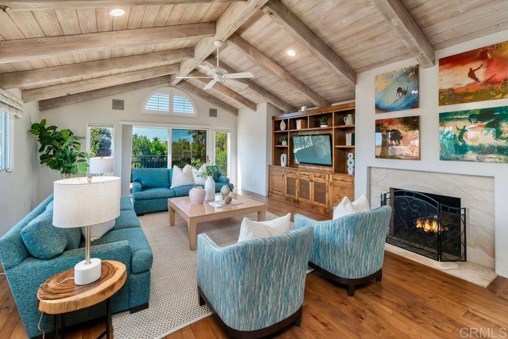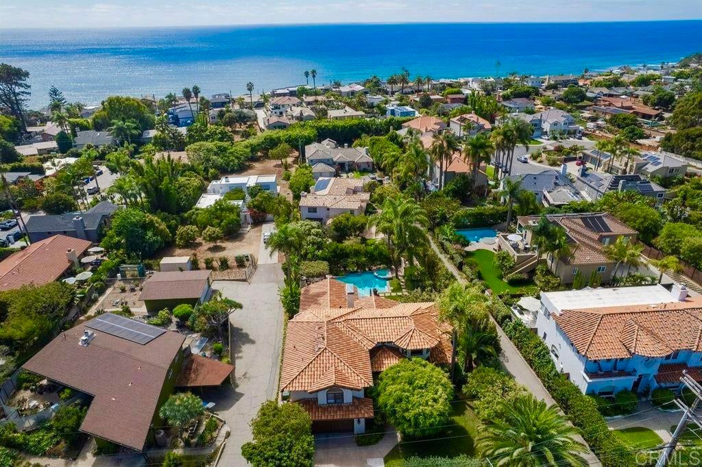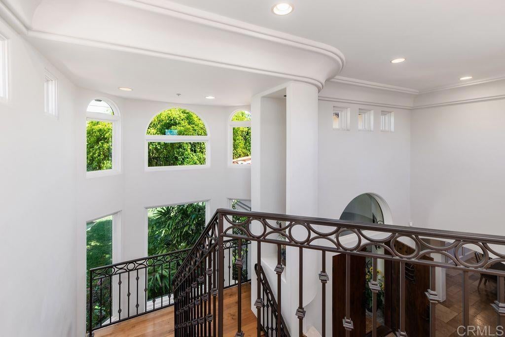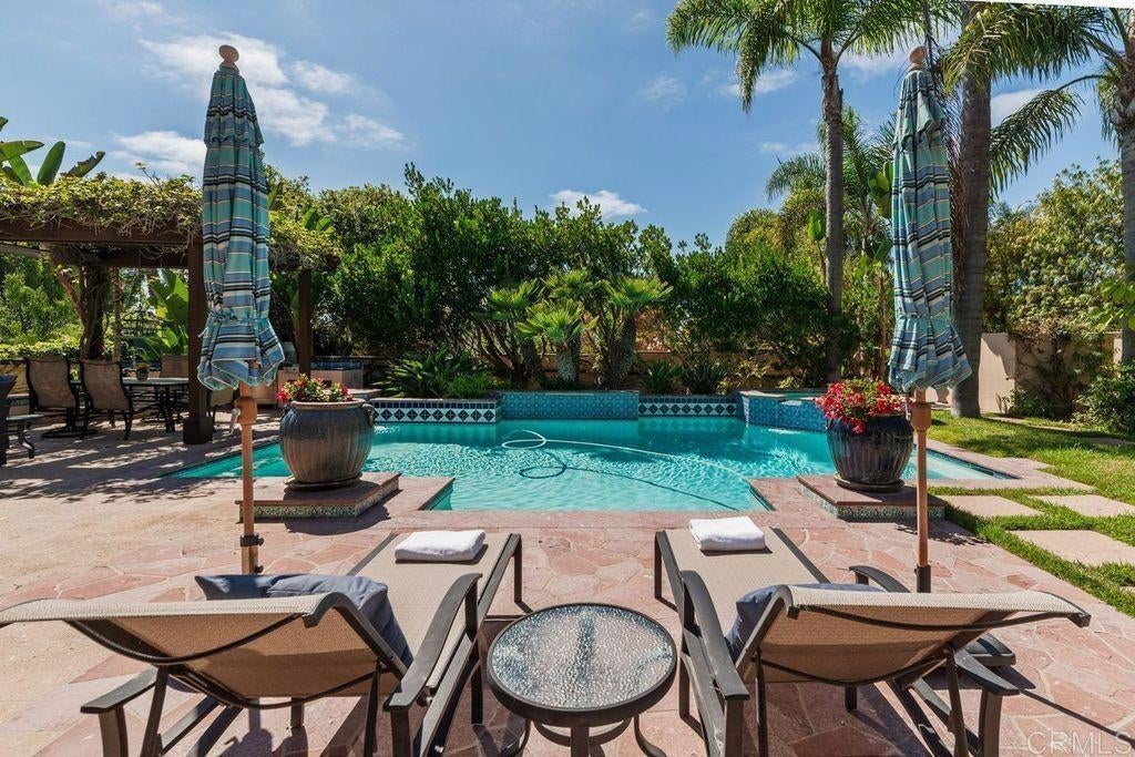 Elegant Mediterranean Villa with Riviera-Style Ambiance in Cardiff’s Coveted Composer District! This residence offers ocean views, lush gardens, pool/jacuzzi with waterfall features. Timeless Architectural Highlights: stone columns flank the double door entry that opens to soaring ceilings, oversized crown molding. Dramatic staircase with wrought iron railings & wood plank steps lead to the mezzanine with ocean views & the soaring entry area...other highlights include art niches and perfectly placed windows bringing in natural light. The rich wood plank floors and tumbled travertine stone offers warmth and elegance. Main floor living offers stone surround fireplaces, open beam ceiling, custom cabinetry and arched windows. The Formal Dining Room is next to the custom designed kitchen, with abundant granite countertop, glass front cabinetry w/ custom hardware and high end appliances. The heart of the home kitchen opens to the family room with open beam ceilings, built in entertainment wall (find the seahorse handles!) Sliding glass door leads to an entertainment deck perfect for indoor outdoor entertaining and a staircase to the pool and gardens. The main floor has a guest bedroom with a charming bay window seat near main level bathroom. Upstairs off the mezzanine is the spacious primary suite and deck with amazing ocean and coastline views. The suite includes a luxurious primary bath plus a large customized walk-in closet. Downstairs are two bedrooms with walk-in closets sharing a Hollywood Jack & Jill bath...Billiards/Game room w/fireplace, and a built-in office area, temperature controlled Wine Cellar plus a full bath & laundry room.... private resort backyard w/ fireplace, outdoor kitchen with BBQ, and a charming trellis covered dining area surrounded by mature palms and birds of paradise.
