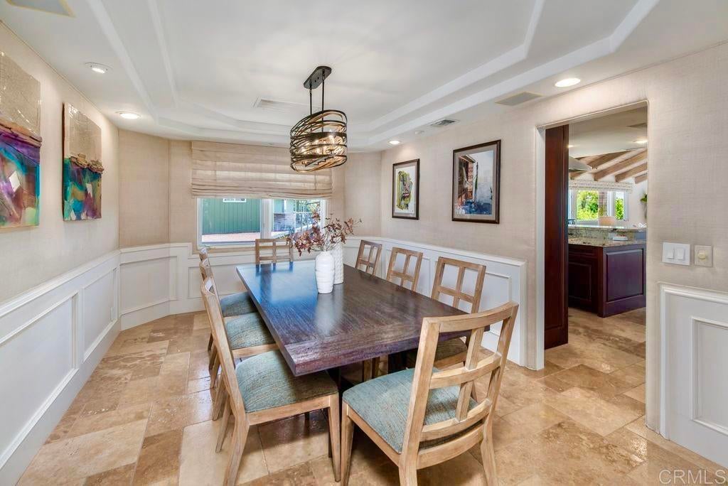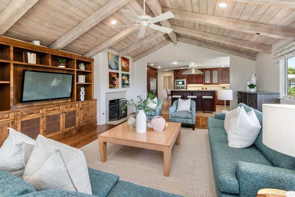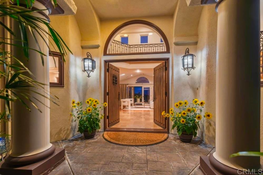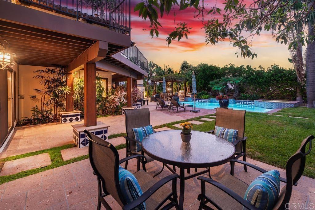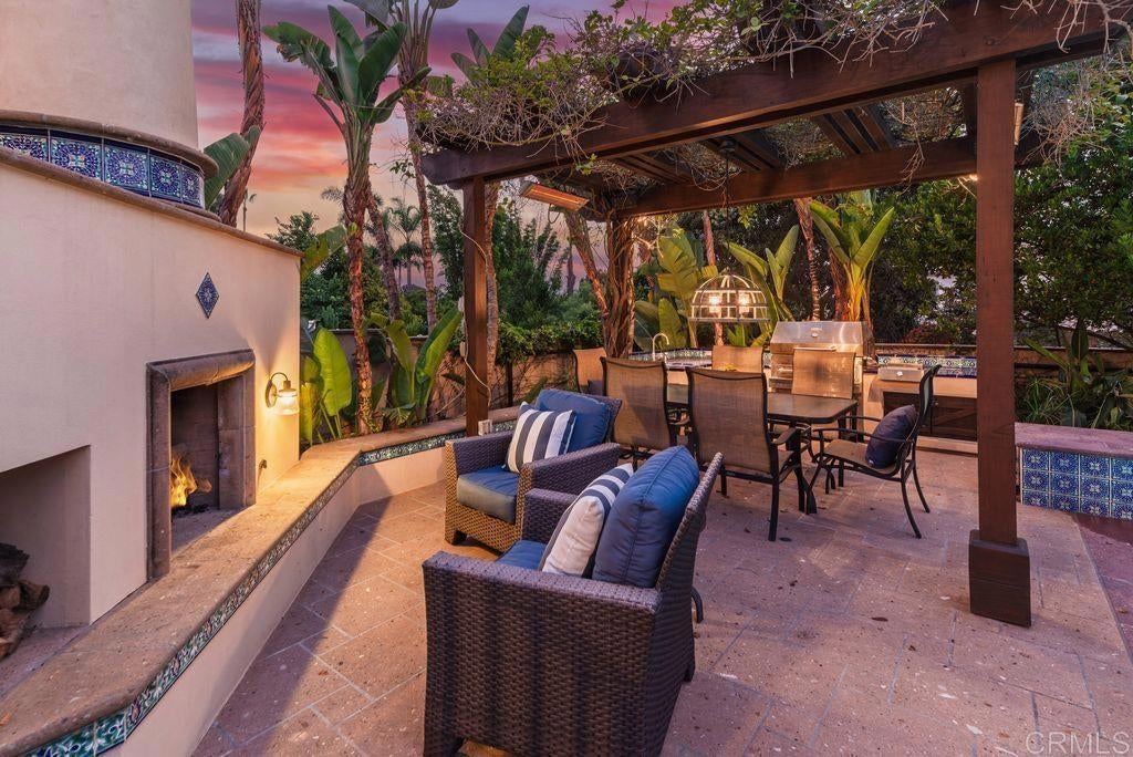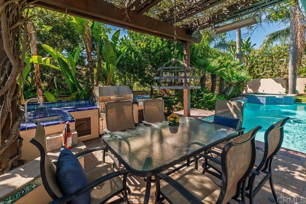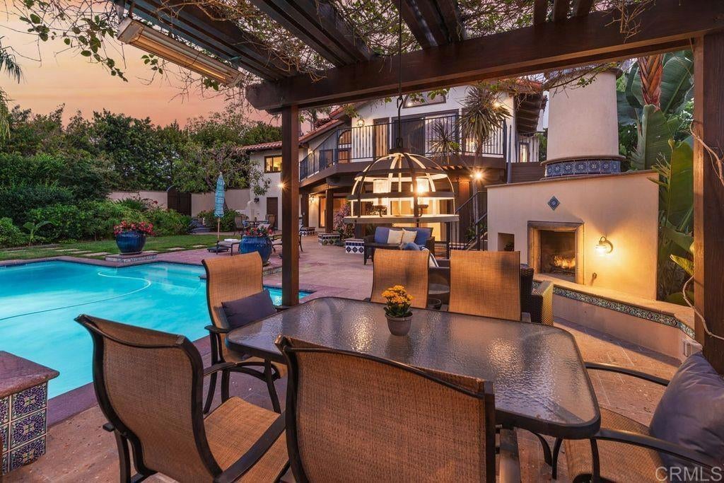 Elegant Mediterranean Villa with Riviera-Style Ambiance in Cardiff’s Coveted Composer District! This residence offers ocean views, lush gardens, pool/jacuzzi with waterfall features. Timeless Architectural Highlights: stone columns flank the double door entry that opens to soaring ceilings, oversized crown molding. Dramatic staircase with wrought iron railings & wood plank steps lead to the mezzanine with ocean views & the soaring entry area...other highlights include art niches and perfectly placed windows bringing in natural light. The rich wood plank floors and tumbled travertine stone offers warmth and elegance. Main floor living offers stone surround fireplaces, open beam ceiling, custom cabinetry and arched windows. The Formal Dining Room is next to the custom designed kitchen, with abundant granite countertop, glass front cabinetry w/ custom hardware and high end appliances. The heart of the home kitchen opens to the family room with open beam ceilings, built in entertainment wall (find the seahorse handles!) Sliding glass door leads to an entertainment deck perfect for indoor outdoor entertaining and a staircase to the pool and gardens. The main floor has a guest bedroom with a charming bay window seat near main level bathroom. Upstairs off the mezzanine is the spacious primary suite and deck with amazing ocean and coastline views. The suite includes a luxurious primary bath plus a large customized walk-in closet. Downstairs are two bedrooms with walk-in closets sharing a Hollywood Jack & Jill bath...Billiards/Game room w/fireplace, and a built-in office area, temperature controlled Wine Cellar plus a full bath & laundry room.... private resort backyard w/ fireplace, outdoor kitchen with BBQ, and a charming trellis covered dining area surrounded by mature palms and birds of paradise.