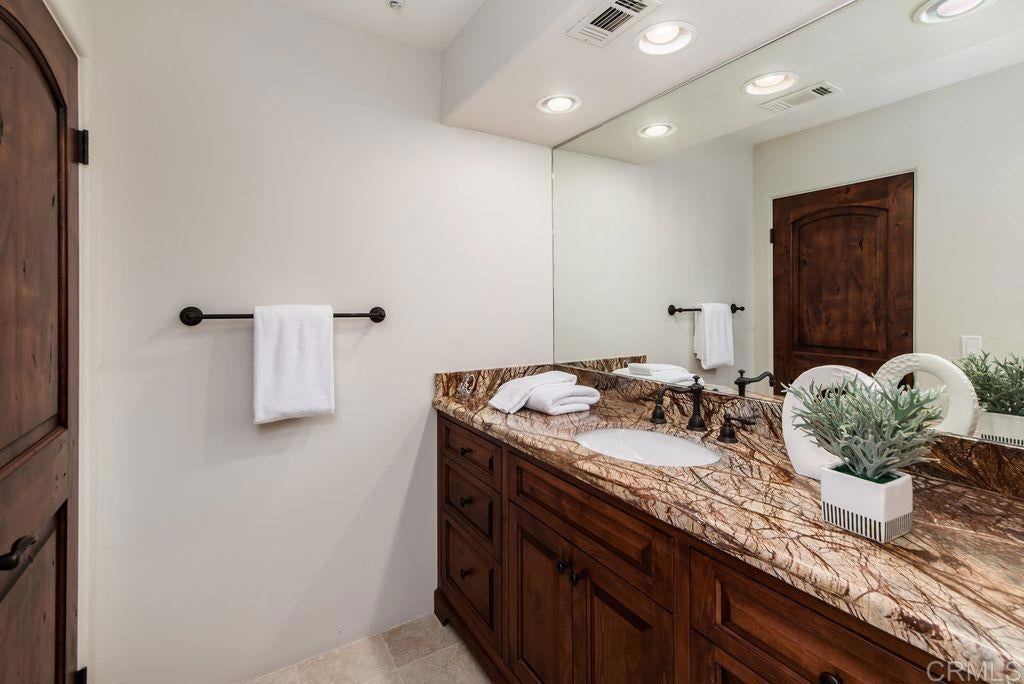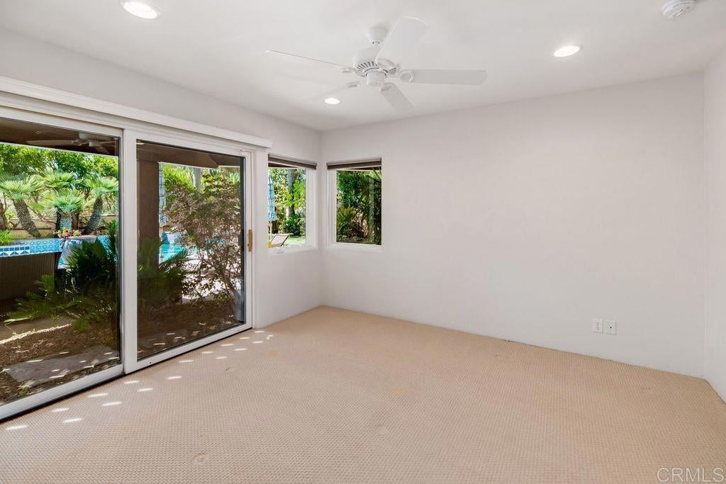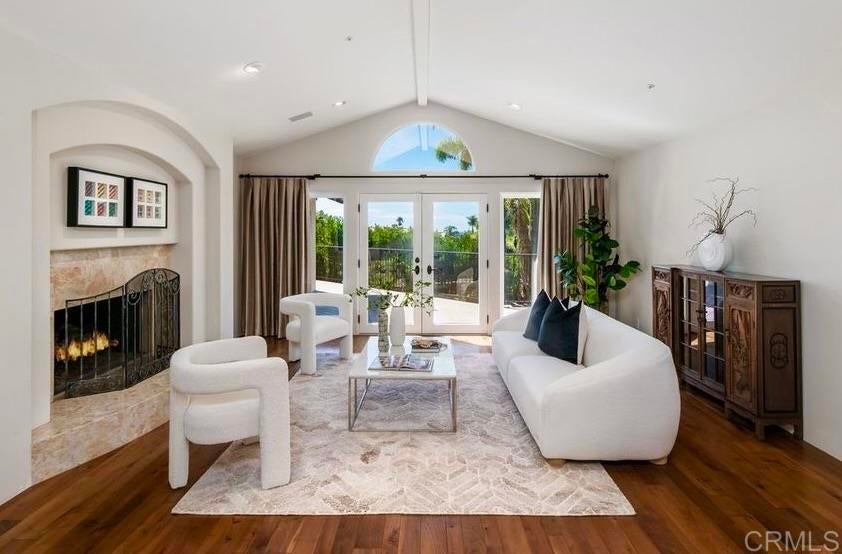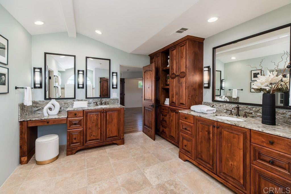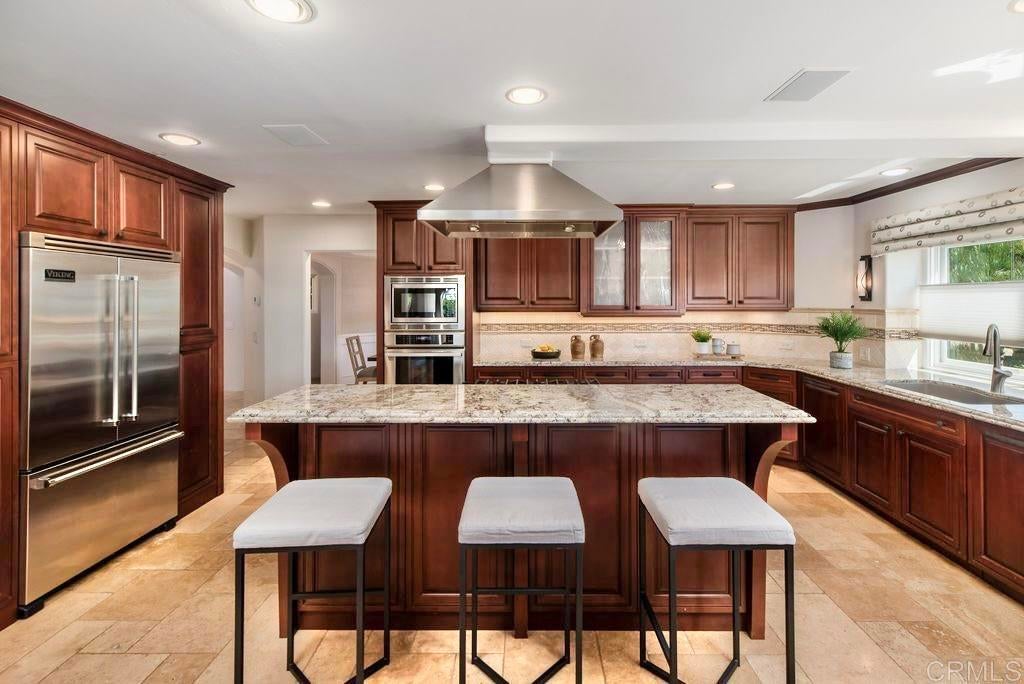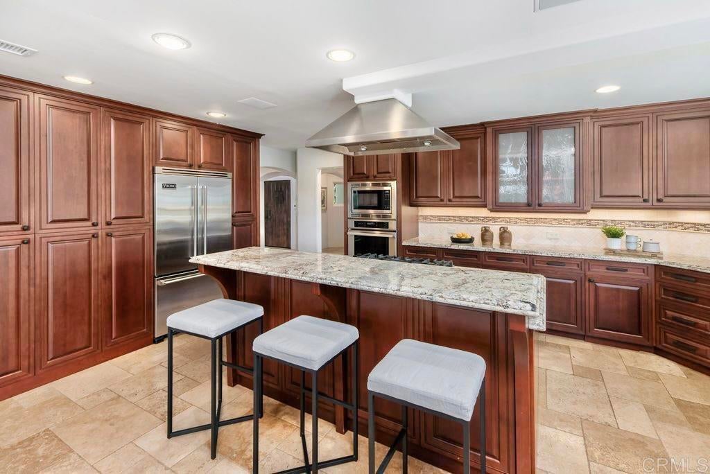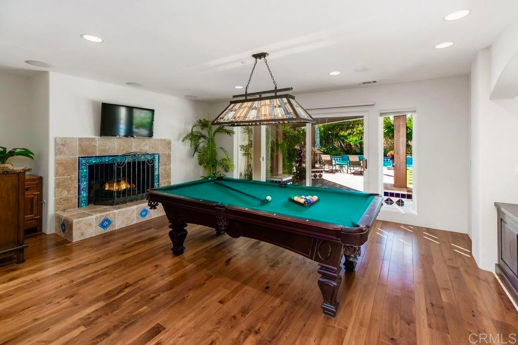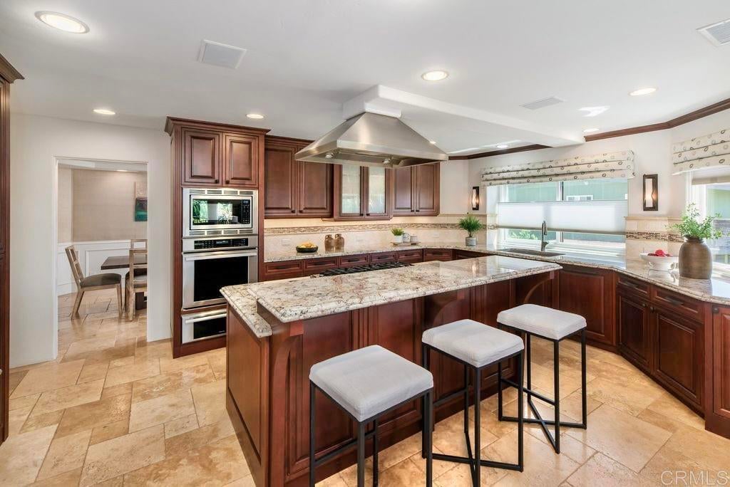 Elegant Mediterranean Villa with Riviera-Style Ambiance in Cardiff’s Coveted Composer District! This residence offers ocean views, lush gardens, pool/jacuzzi with waterfall features. Timeless Architectural Highlights: stone columns flank the double door entry that opens to soaring ceilings, oversized crown molding. Dramatic staircase with wrought iron railings & wood plank steps lead to the mezzanine with ocean views & the soaring entry area...other highlights include art niches and perfectly placed windows bringing in natural light. The rich wood plank floors and tumbled travertine stone offers warmth and elegance. Main floor living offers stone surround fireplaces, open beam ceiling, custom cabinetry and arched windows. The Formal Dining Room is next to the custom designed kitchen, with abundant granite countertop, glass front cabinetry w/ custom hardware and high end appliances. The heart of the home kitchen opens to the family room with open beam ceilings, built in entertainment wall (find the seahorse handles!) Sliding glass door leads to an entertainment deck perfect for indoor outdoor entertaining and a staircase to the pool and gardens. The main floor has a guest bedroom with a charming bay window seat near main level bathroom. Upstairs off the mezzanine is the spacious primary suite and deck with amazing ocean and coastline views. The suite includes a luxurious primary bath plus a large customized walk-in closet. Downstairs are two bedrooms with walk-in closets sharing a Hollywood Jack & Jill bath...Billiards/Game room w/fireplace, and a built-in office area, temperature controlled Wine Cellar plus a full bath & laundry room.... private resort backyard w/ fireplace, outdoor kitchen with BBQ, and a charming trellis covered dining area surrounded by mature palms and birds of paradise.