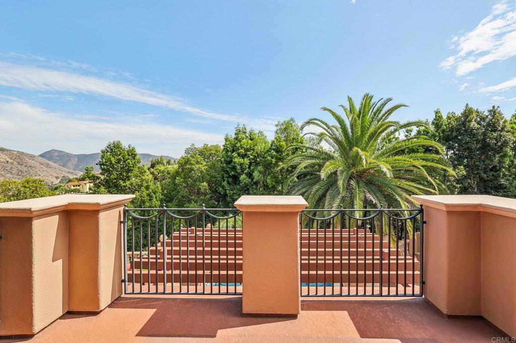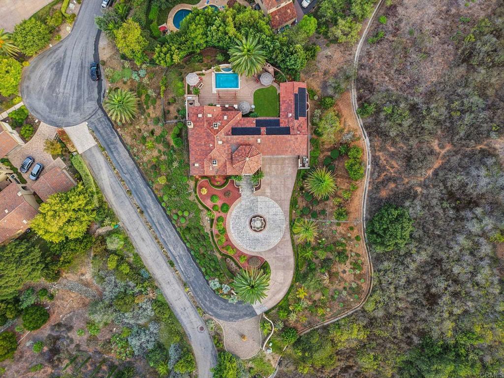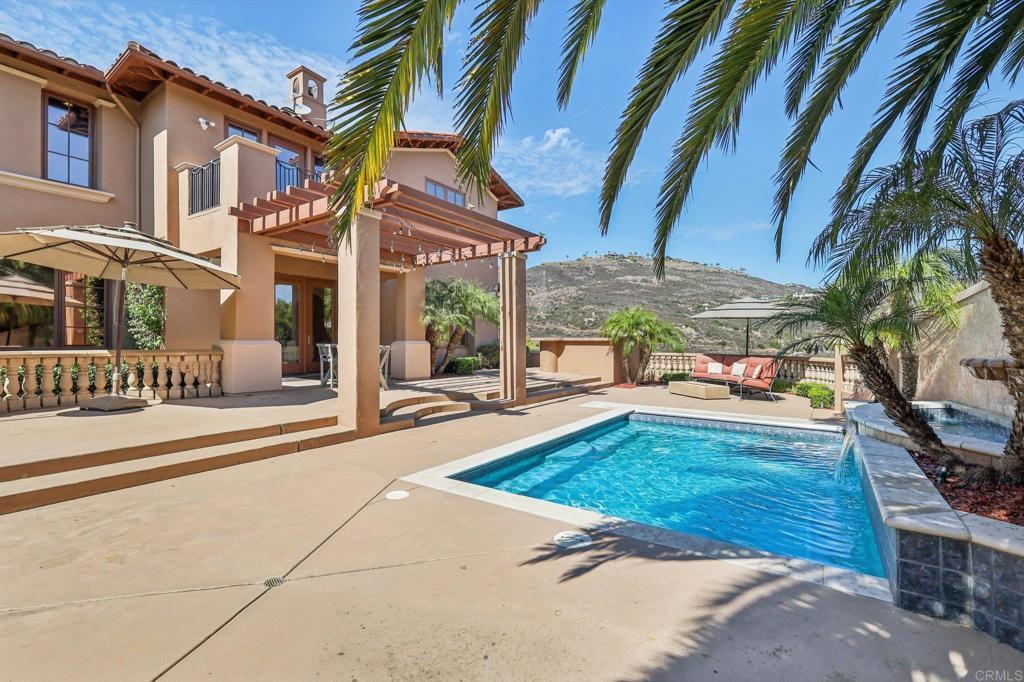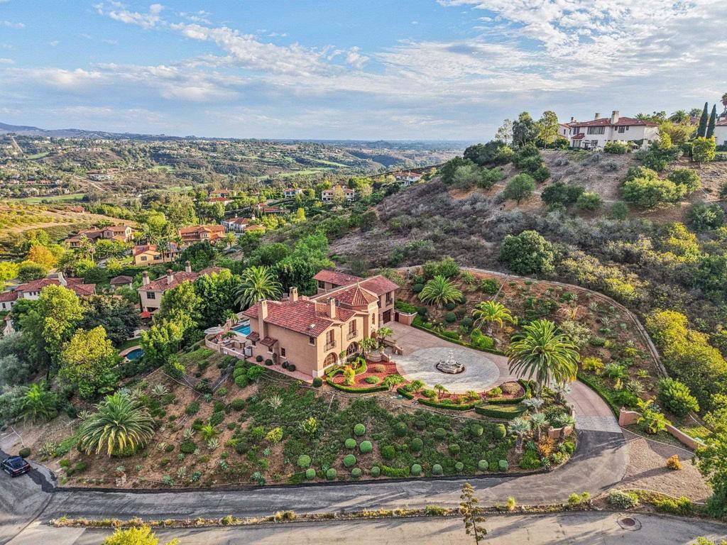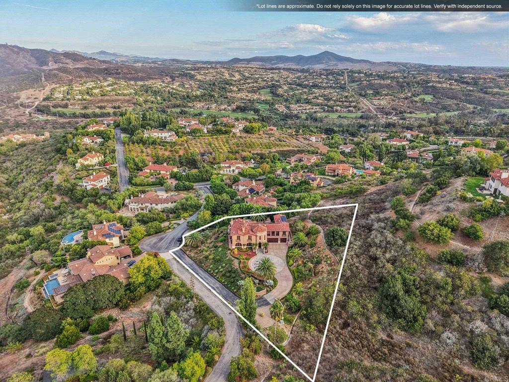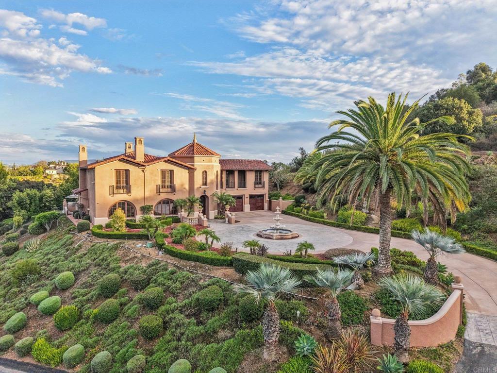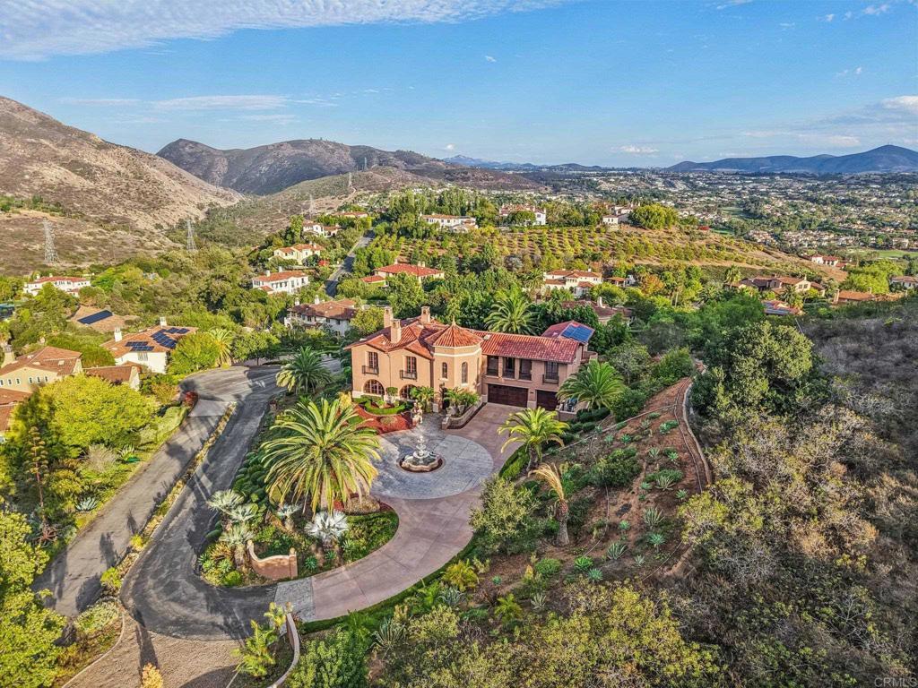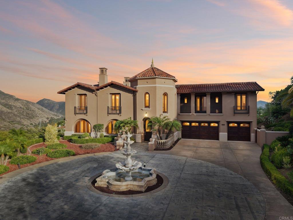 This private Mediterranean estate is set on an elevated 1.13-acre lot with sweeping mountain views at the end of a cul-de-sac in the prestigious guard-gated Cielo community within the highly sought-after R Roger Rowe School boundaries. Main residence offers 5 bedrooms, 3.5 baths, theater room, office, upstairs bonus room, along with an attached ADU that has a bedroom and bath. Grand driveway ascends to a circular motor court, where a meticulously landscaped yard and stunning fountain create a dramatic stage for arrival. Soaring two-story foyer with hardwood floors and a sweeping staircase welcome you. Formal living room has a fireplace framed by arched doorways, while the neighboring office is finished with custom built-ins. Kitchen features white cabinetry, a large center island, premium appliances, and daily dining that flows seamlessly into the family room with fireplace. Formal dining room and powder room complete the main level. Upstairs, primary suite offers a fireplace with raised hearth, private balcony, a spa-inspired bath with dual vanities, soaking tub, walk-in shower, and an expansive walk-in closet. Three additional bedrooms, 2-baths, laundry room, and bonus room complete the main residence. Attached ADU has a private entrance, full kitchen, living room, bedroom, and bath. Backyard is designed for entertaining with an oversized spa and cascading water feature, built-in BBQ island, fireplace, pergola, and multiple seating areas all surrounded by lush landscaping and mountain views. Entertainment continues with a private theater with separate exterior access. Additional highlights include 10KW owned solar system, 3-car garage, 2 tankless water heaters, EV charger, and wired for sound in select areas of the home with built-in speakers. Enjoy 24-hour guard-gated security, resort style amenities including a clubhouse, fitness center, pool, spa, tennis courts, pickleball, volleyball, basketball, & playgrounds.