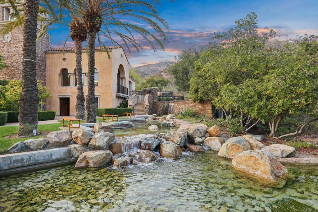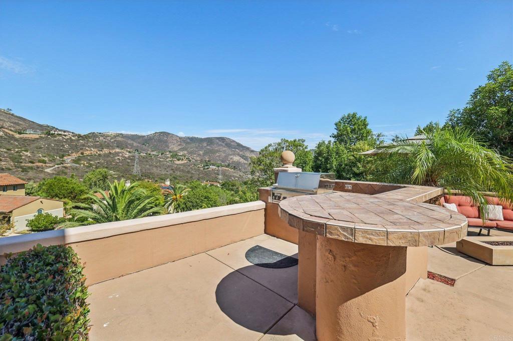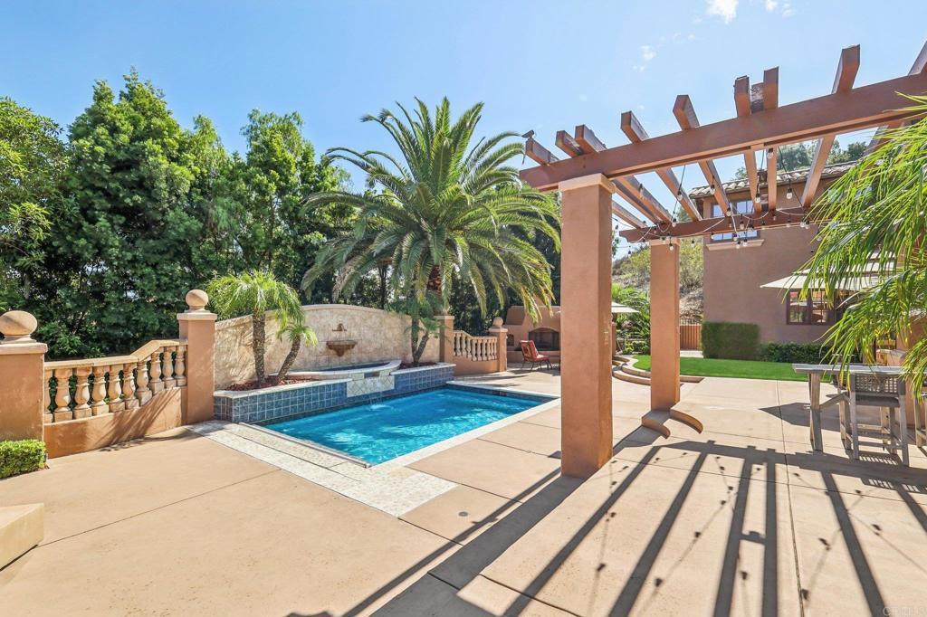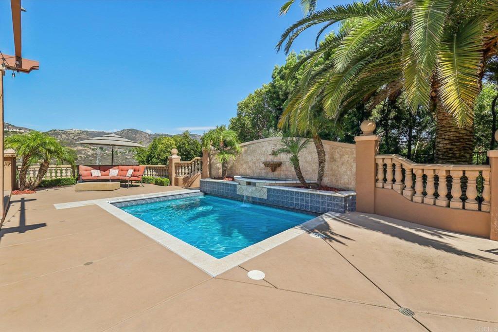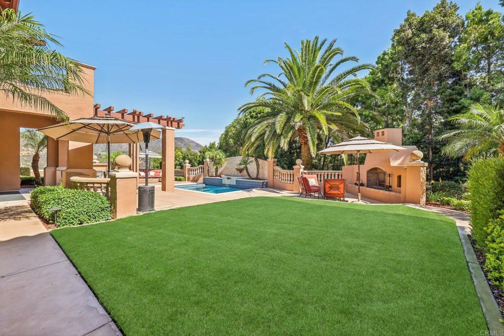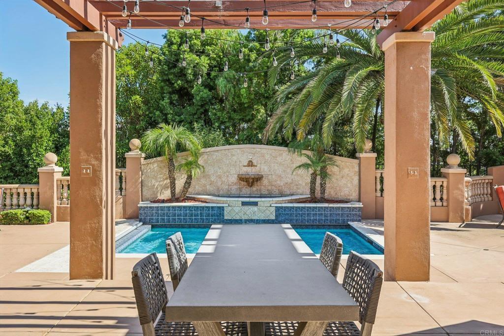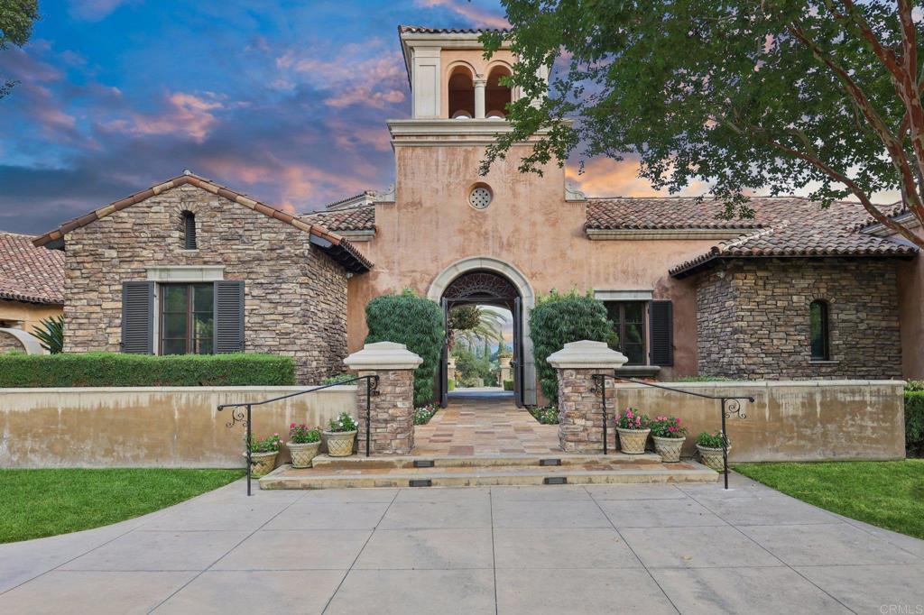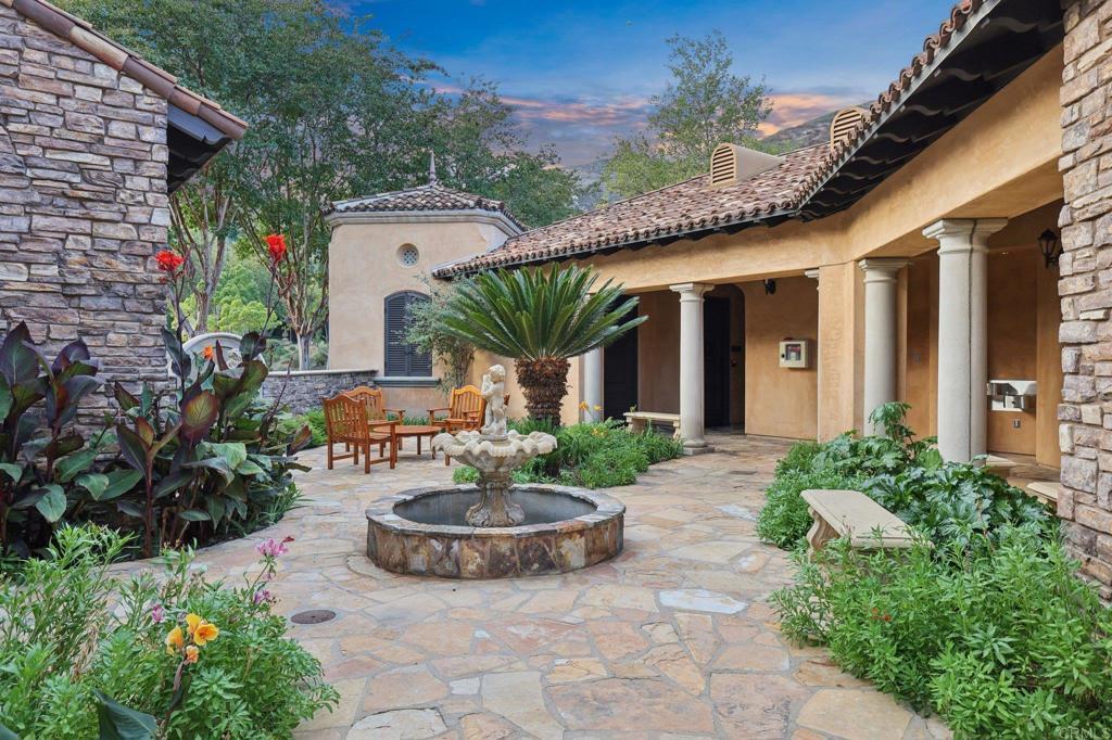 This private Mediterranean estate is set on an elevated 1.13-acre lot with sweeping mountain views at the end of a cul-de-sac in the prestigious guard-gated Cielo community within the highly sought-after R Roger Rowe School boundaries. Main residence offers 5 bedrooms, 3.5 baths, theater room, office, upstairs bonus room, along with an attached ADU that has a bedroom and bath. Grand driveway ascends to a circular motor court, where a meticulously landscaped yard and stunning fountain create a dramatic stage for arrival. Soaring two-story foyer with hardwood floors and a sweeping staircase welcome you. Formal living room has a fireplace framed by arched doorways, while the neighboring office is finished with custom built-ins. Kitchen features white cabinetry, a large center island, premium appliances, and daily dining that flows seamlessly into the family room with fireplace. Formal dining room and powder room complete the main level. Upstairs, primary suite offers a fireplace with raised hearth, private balcony, a spa-inspired bath with dual vanities, soaking tub, walk-in shower, and an expansive walk-in closet. Three additional bedrooms, 2-baths, laundry room, and bonus room complete the main residence. Attached ADU has a private entrance, full kitchen, living room, bedroom, and bath. Backyard is designed for entertaining with an oversized spa and cascading water feature, built-in BBQ island, fireplace, pergola, and multiple seating areas all surrounded by lush landscaping and mountain views. Entertainment continues with a private theater with separate exterior access. Additional highlights include 10KW owned solar system, 3-car garage, 2 tankless water heaters, EV charger, and wired for sound in select areas of the home with built-in speakers. Enjoy 24-hour guard-gated security, resort style amenities including a clubhouse, fitness center, pool, spa, tennis courts, pickleball, volleyball, basketball, & playgrounds.