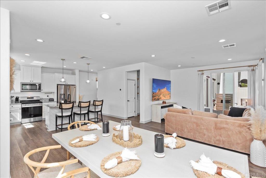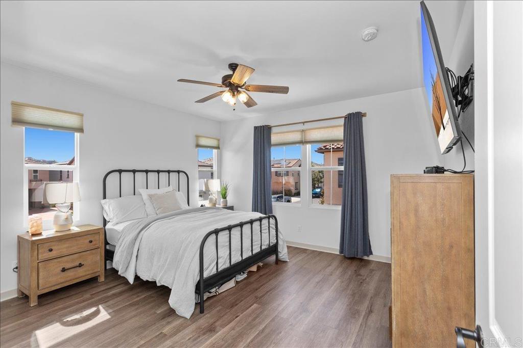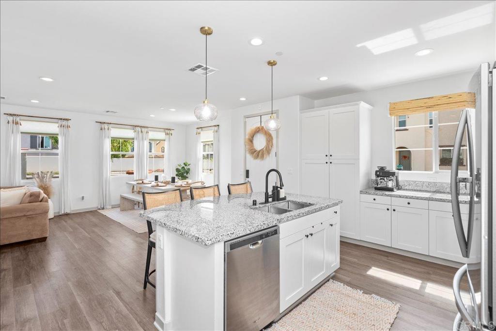 Welcome to this exceptional home in the sought-after Pepper Tree enclave of Mission Lane. Set on one of the best locations in the community, this true corner lot offers no neighbor on one side, creating rare privacy, abundant natural light, and mountain views. With 4 beds + loft, 2.5 baths, and approximately 1,962 sf, this residence combines thoughtful design, open concept living with extensive upgrades, and comes complete with OWNED SOLAR. The interior showcases upgraded flooring throughout, with luxury vinyl plank on both levels and custom tile in the bathrooms. You’ll love the main-level bath, finished with a stylish vanity, upgraded fixtures, decorative accent wall, and custom tile flooring. The kitchen is a showpiece, featuring an oversized island with custom chevron woodwork and soft-close cabinetry. Additional highlights include crown molding, a full electrical upgrade with designer light fixtures, a custom staircase railing, and ceiling fans in every room. Loaded with modern features for convenience and efficiency, the home includes owned solar, Nest Pro thermostats on both levels, Ring security, Eufy smart lock, smart garage opener, and video doorbell. Outdoors, enjoy a fully landscaped yard with elegant pavers and a professionally installed Govee Pro LED lighting system—perfect for year-round curb appeal and customizable holiday displays for Christmas, Halloween, the Fourth of July, and more! Residents of Mission Lane enjoy resort-style amenities including a pool and spa, BBQ and gathering areas, multiple parks, greenbelt spaces, and HOA-maintained front yards. This is a rare opportunity to own one of the community’s most desirable homes, offering superior location, privacy, and upgrades.