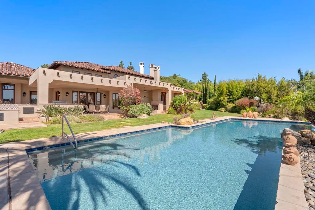 Luxury Estate in Wildflower Estates – Olivenhain Property Overview Welcome to an extraordinary custom estate in the prestigious, manned-gated community of Wildflower Estates, where timeless architecture meets resort-style living. Situated on 2.1 private acres, this residence offers approximately 7,400 square feet of refined interiors, a detached guest house, and breathtaking panoramic views of Rancho Santa Fe and the Olivenhain valley. Designed for those who value both elegance and comfort, this property provides the ultimate Southern California lifestyle. Main Residence • Expansive floorplan designed with a primarily single-level layout, offering seamless living and accessibility. • A private upstairs studio, perfect as a creative space, office, or gym. • Soaring ceilings, oversized windows, and open living areas that maximize natural light and highlight the spectacular valley views. • Chef’s kitchen with professional-grade appliances, center island, and custom cabinetry designed for both functionality and entertaining. • Formal and informal living rooms, each with fireplaces, creating multiple spaces for hosting and relaxation. • Luxurious primary suite featuring spa-inspired bathroom, walk-in closets, and private retreat area. Detached Guest House • A fully independent 2-bedroom, single-level guest residence. • Ideal for extended family, guests, or private staff quarters. • Designed with the same level of finish and detail as the main residence, ensuring comfort and elegance. Resort-Style Outdoor Living • Sparkling pool surrounded by sun-drenched patios. • A fully equipped outdoor kitchen with pizza oven and built-in BBQ, perfect for entertaining year-round. • Expansive backyard designed for resort-like living, offering multiple lounging areas and lush landscaping. • Panoramic sunset and valley views provide a serene backdrop for both intimate evenings and large gatherings. Additional Features • 5-car garages with ample storage and motor court. • Located within one of North County San Diego’s premier gated neighborhoods, known for its exclusivity, equestrian charm, and proximity to top-rated schools, shopping, dining, and coastal beaches. • Gated privacy and security within Wildflower Estates, one of the region’s most desirable enclaves.