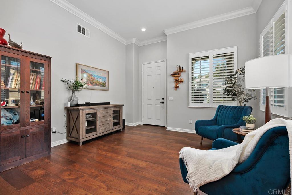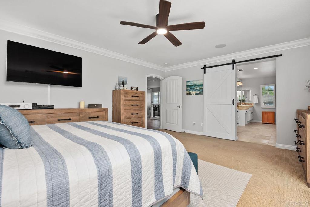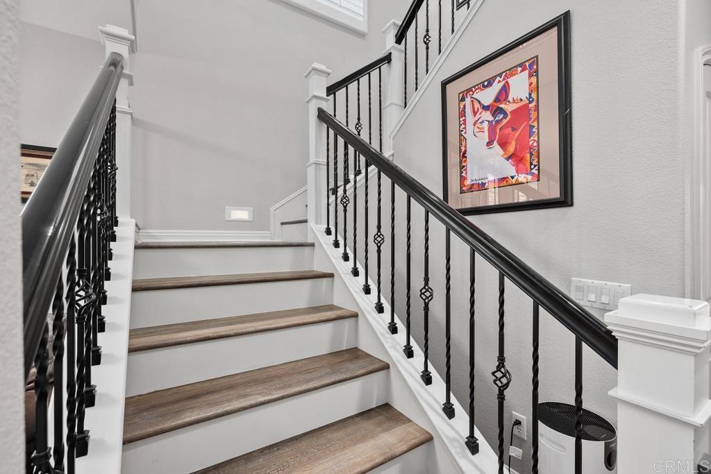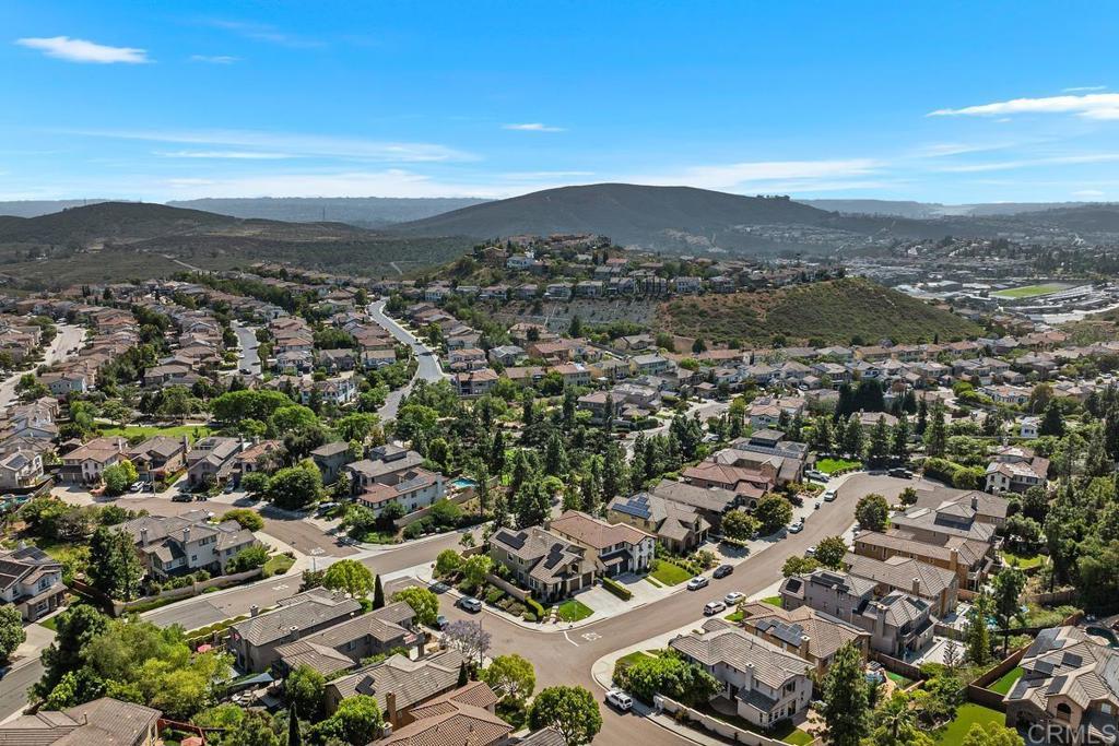 Beautifully upgraded 5-bedroom + loft, 2.5-bath home on a corner lot in the highly desirable community of San Elijo Hills. Situated on a peaceful cul-de-sac, this property offers owned solar, designer finishes, and incredible versatility for modern living. Step into an open-concept layout filled with natural light and high-end touches including reclaimed barn wood and luxury vinyl plank flooring, crown molding, recessed lighting, and fresh paint throughout. The recently renovated kitchen features white cabinetry, granite countertops, a full-height backsplash, stainless steel appliances, a center island, and a five-burner gas cooktop—opening seamlessly to the warm, inviting family room with a cozy fireplace. Upstairs, the spacious loft offers flexibility as a potential sixth bedroom, office, game room, or media space. One of the secondary bedrooms opens via French doors to a private covered deck, while the luxurious primary suite includes a walk-in closet, a balcony with hillside views, and a spa-like ensuite with Italian travertine tile. Downstairs, a fifth bedroom currently functions as a professional music studio with its own mini split system—ideal as a guest suite, home gym, or creative workspace. The backyard is a peaceful sanctuary with lush English garden-style landscaping, river rock pathways, curated plantings, a built-in BBQ island, custom fire pit, and a drip/sprinkler system for low-maintenance upkeep. This home is packed with thoughtful upgrades, including an owned solar system and two EV charging stations to support sustainable living. Enjoy enhanced comfort and convenience with a surround sound system, ceiling fans throughout, central vacuum, a zero-maintenance HALO 5 whole-house water filtration system, and epoxy-coated garage floors.