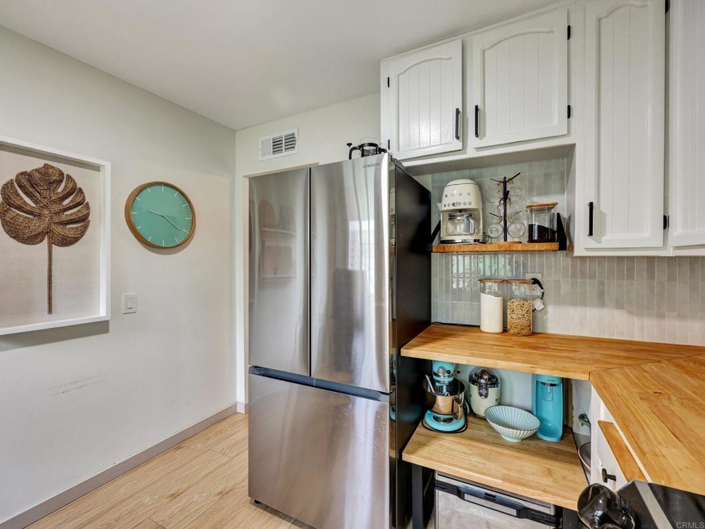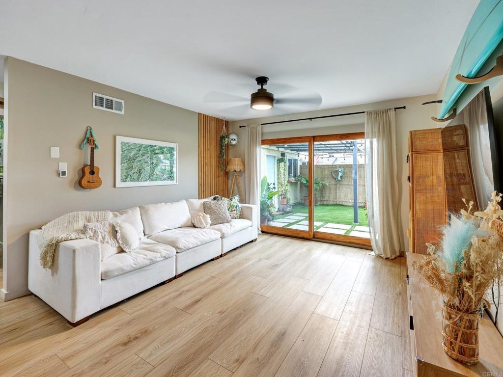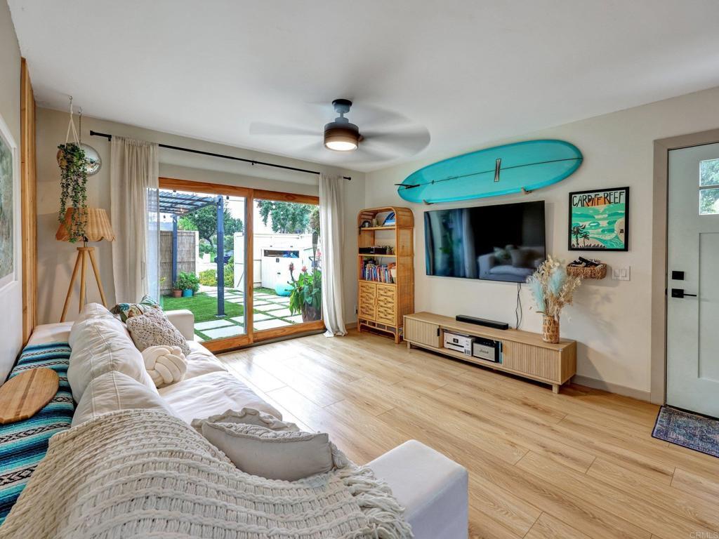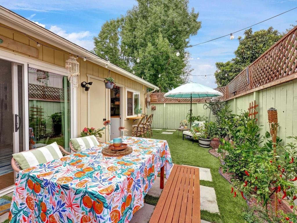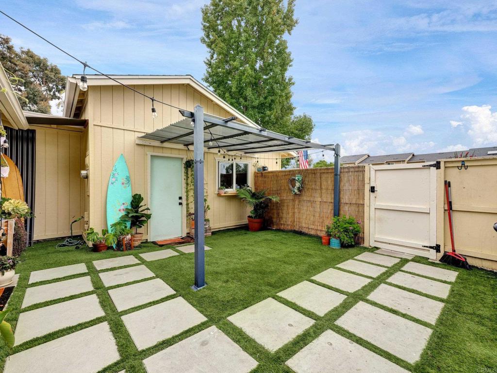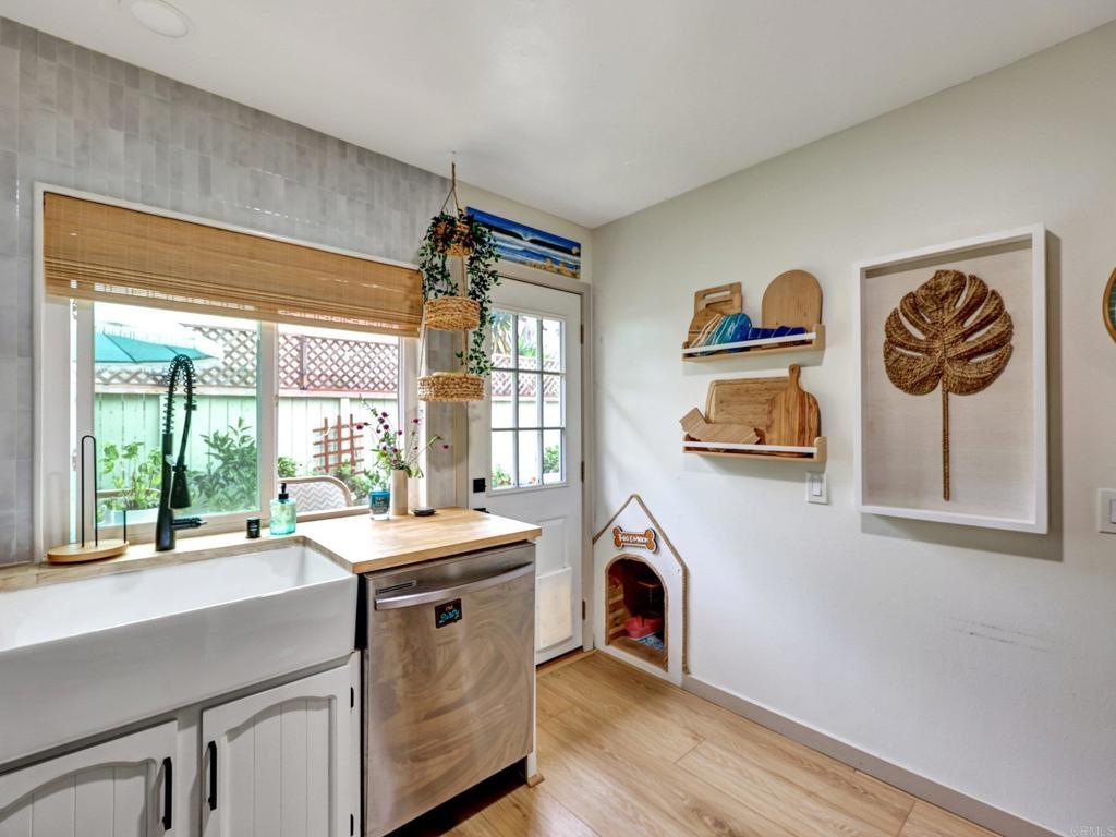 Lives like a single-family home! Single-story end unit at the end of a quiet cul-de-sac with only one shared wall and a spacious private yard. Experience coastal living just 3.5 miles from Moonlight Beach in this beautifully updated 2-bedroom, 2-bath home. Stylishly designed with a beachy boho vibe, this light-filled retreat features new seamless luxury vinyl flooring, butcher block countertops, a ceramic farm sink, and brand-new Samsung appliances. Thoughtful details include solid wood barn doors, designer lighting, and custom closet systems. Both bathrooms have been tastefully renovated with modern finishes. Outside, relax or entertain in the largest private yard in the neighborhood—complete with turf, concrete pavers, a built-in pergola, and lush landscaping. A new farmhouse-style garage door, extended driveway, and keypad entry gate enhance both curb appeal and privacy. The community offers pools, tennis/pickleball courts, playgrounds, and greenbelts—all within walking distance of top schools, shops, and freeway access.
