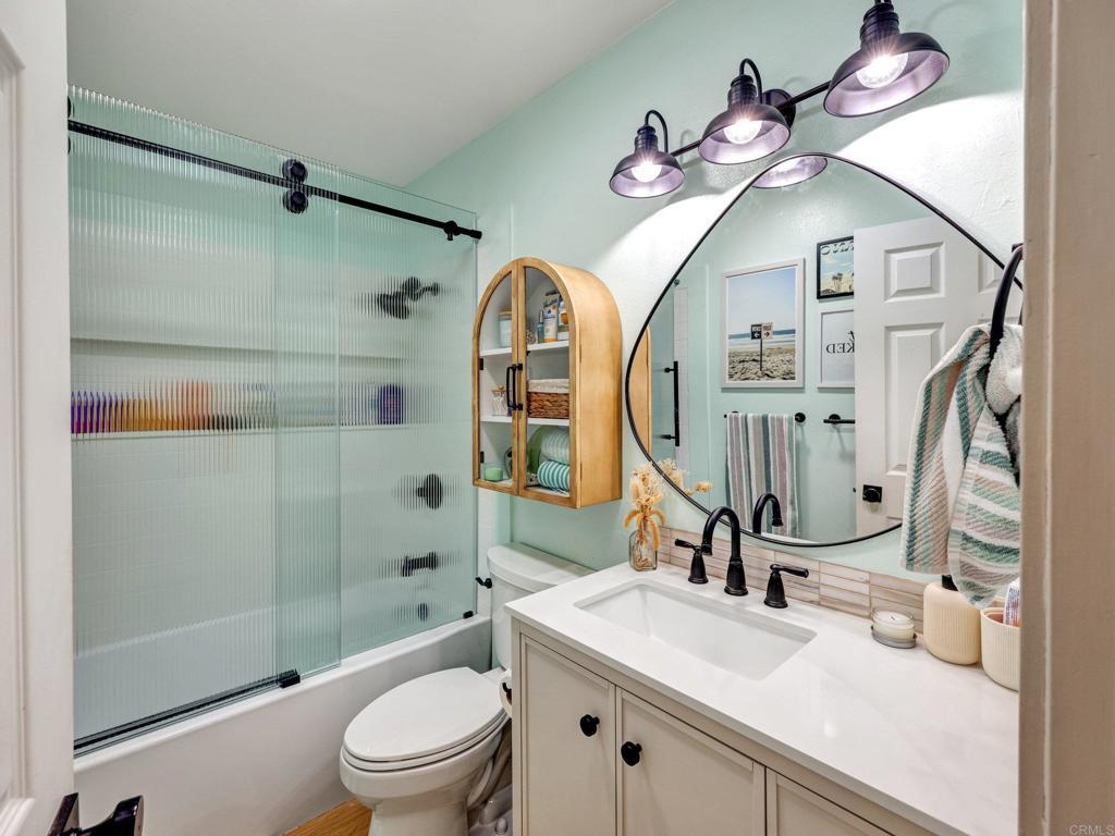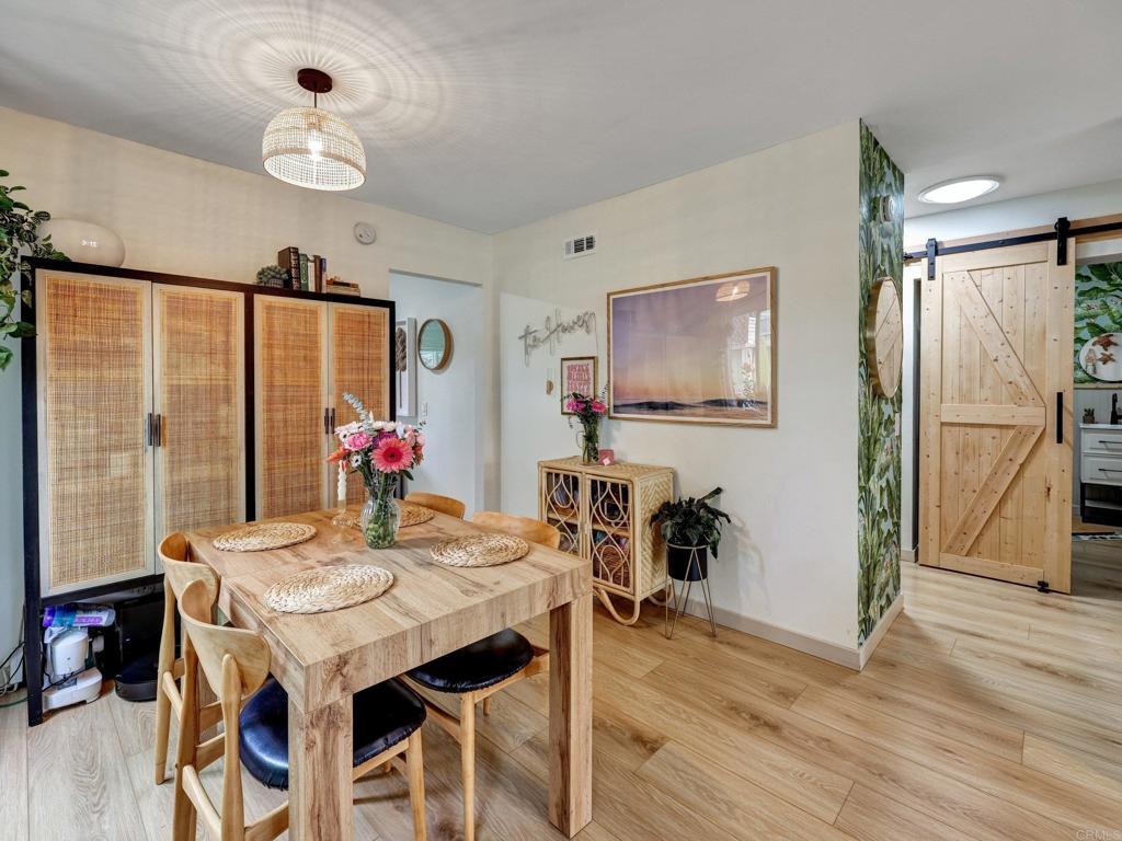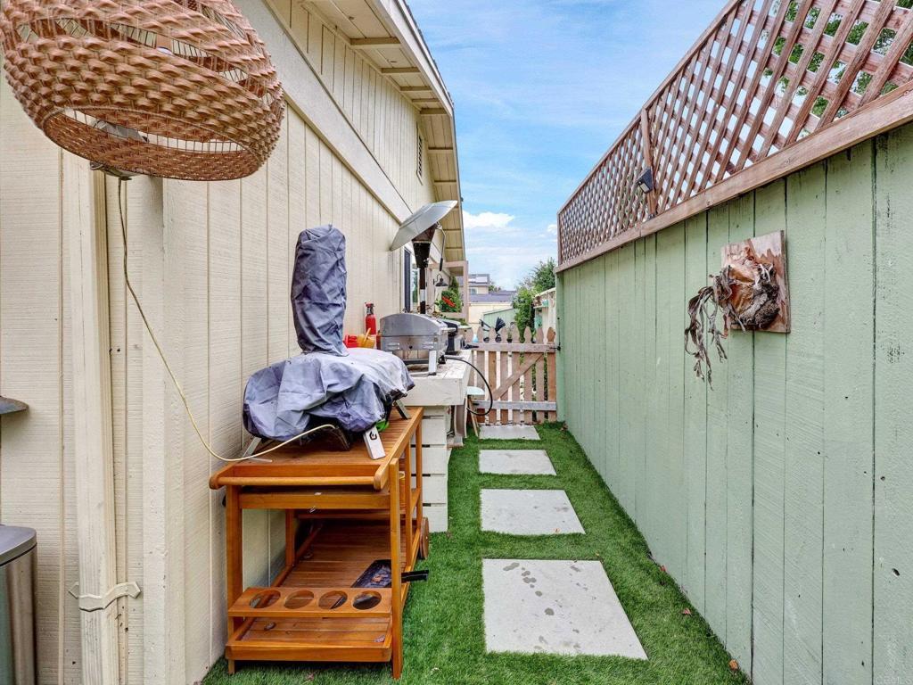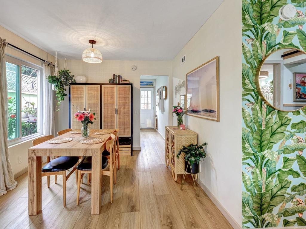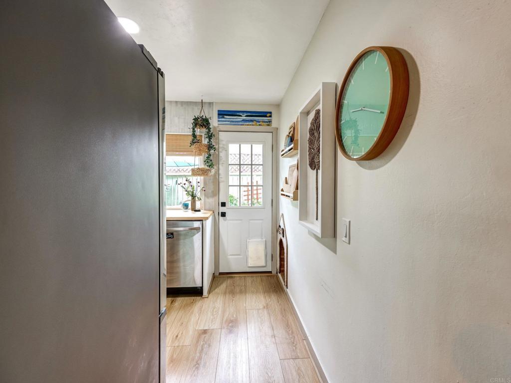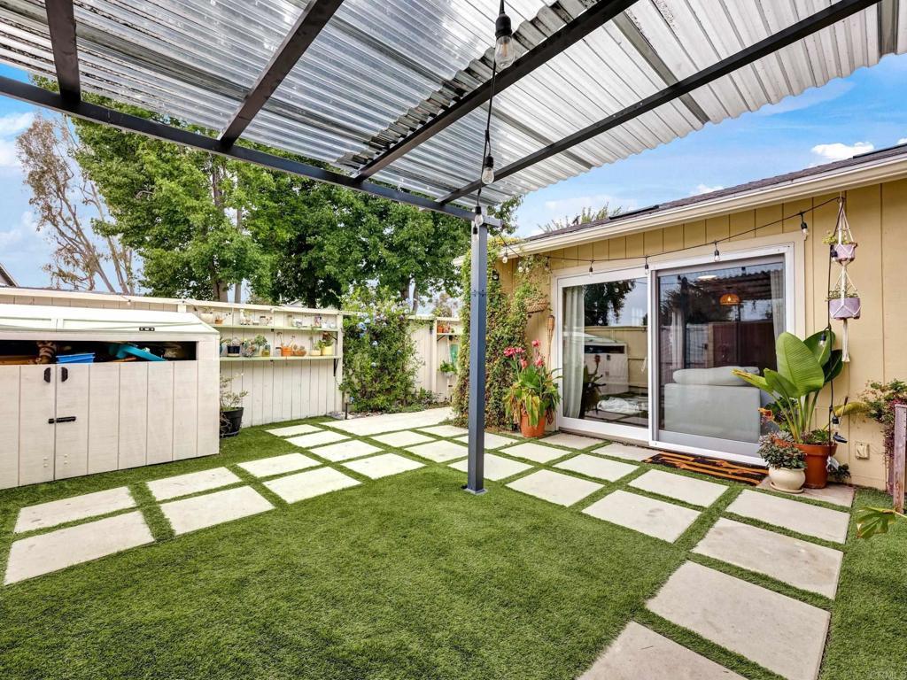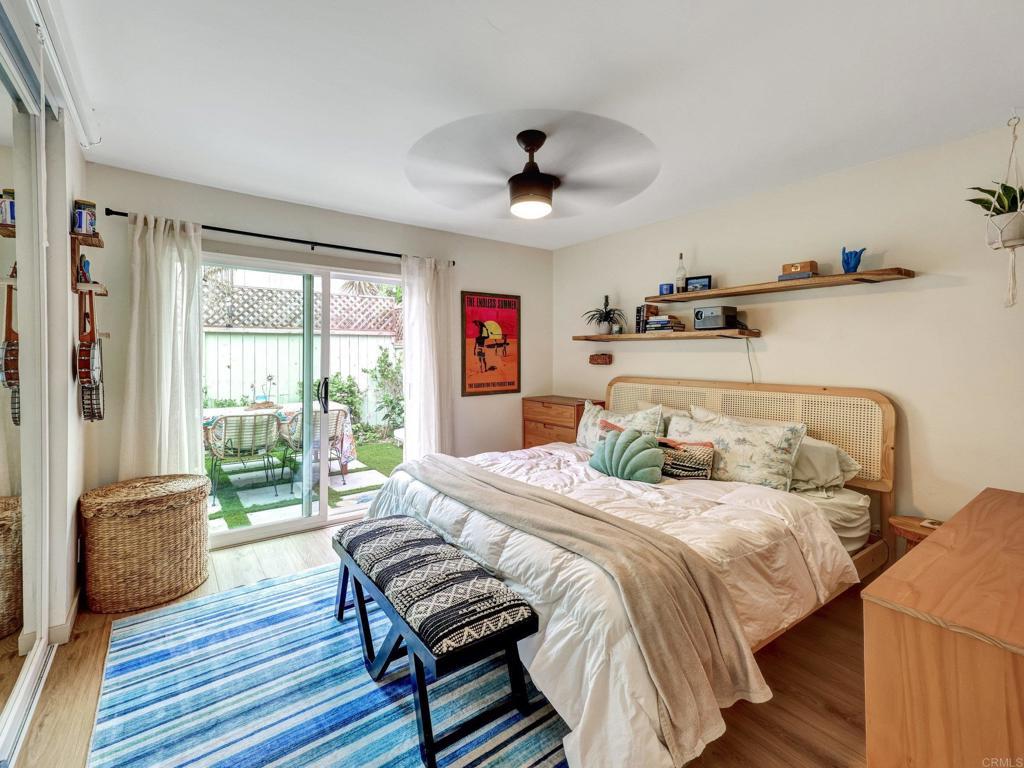 Lives like a single-family home! Single-story end unit at the end of a quiet cul-de-sac with only one shared wall and a spacious private yard. Experience coastal living just 3.5 miles from Moonlight Beach in this beautifully updated 2-bedroom, 2-bath home. Stylishly designed with a beachy boho vibe, this light-filled retreat features new seamless luxury vinyl flooring, butcher block countertops, a ceramic farm sink, and brand-new Samsung appliances. Thoughtful details include solid wood barn doors, designer lighting, and custom closet systems. Both bathrooms have been tastefully renovated with modern finishes. Outside, relax or entertain in the largest private yard in the neighborhood—complete with turf, concrete pavers, a built-in pergola, and lush landscaping. A new farmhouse-style garage door, extended driveway, and keypad entry gate enhance both curb appeal and privacy. The community offers pools, tennis/pickleball courts, playgrounds, and greenbelts—all within walking distance of top schools, shops, and freeway access.