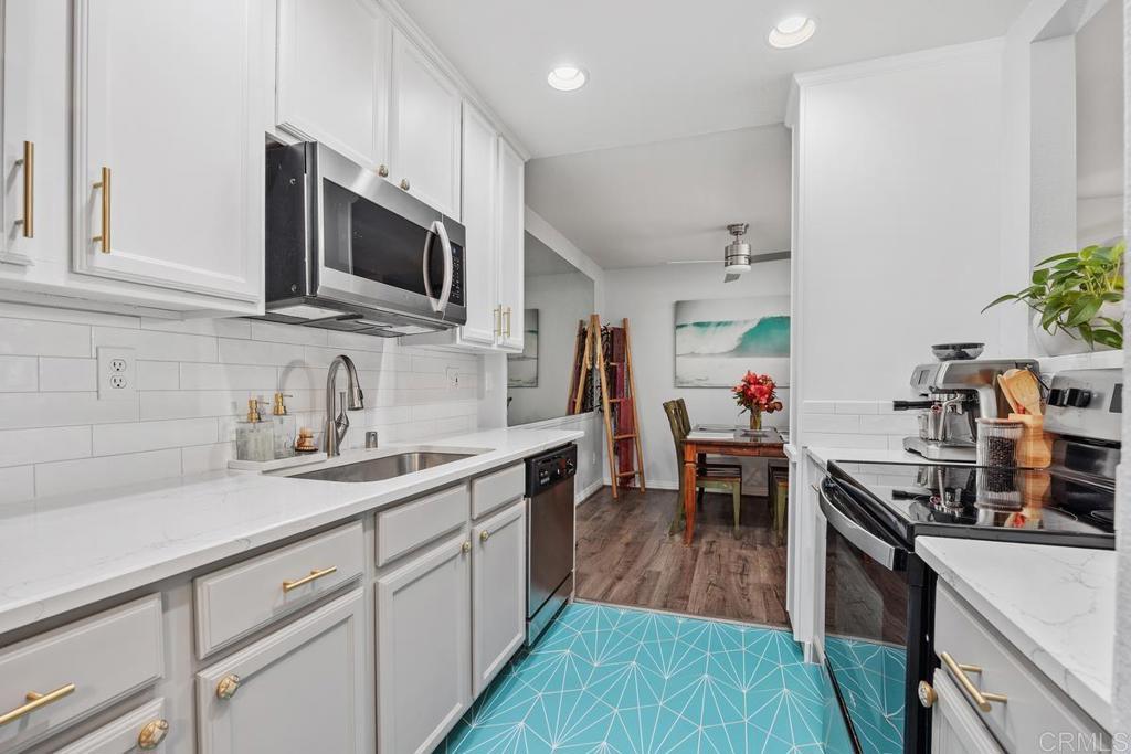 This charming, remodeled townhome is in the gated Pacific Pines Community in Encinitas, where nature's beauty meets coastal convenience. This rarely available 2-bedroom 1 bathroom unit is located on the first floor, boasting an outdoor patio with convenient storage that looks out onto lush landscaping. The home has gone through a full remodel with luxury vinyl flooring, stainless steel appliances, modern tile, quartz kitchen countertops, and a fully remodeled bathroom. The layout offers practical functionality, featuring a dedicated dining area adjacent to the kitchen, which overlooks the family room. Additional amenities include an in-unit stackable washer and dryer, as well as two generously sized bedrooms, one of which includes a walk-in closet. Just a short stroll away under beautiful mature trees is the community center with pool, spa, recreation room, and gym. Throughout the community, there are areas to BBQ, walking trails, 2 tennis courts, and electric car charging stations. The location can’t be beaten, .5 miles from MiraCosta College, 1 mile from the I-5 freeway, 2 miles from Annie’s Canyon Trail, 4 miles to all the bars and eateries that Solano Beach and Cardiff offer, while only being 5 miles to all the entertainment of Del Mar Racetrack and its events. This is the most affordable 2-bedroom coastal unit in Encinitas and the only one in the complex. Your new lifestyle awaits!!!
