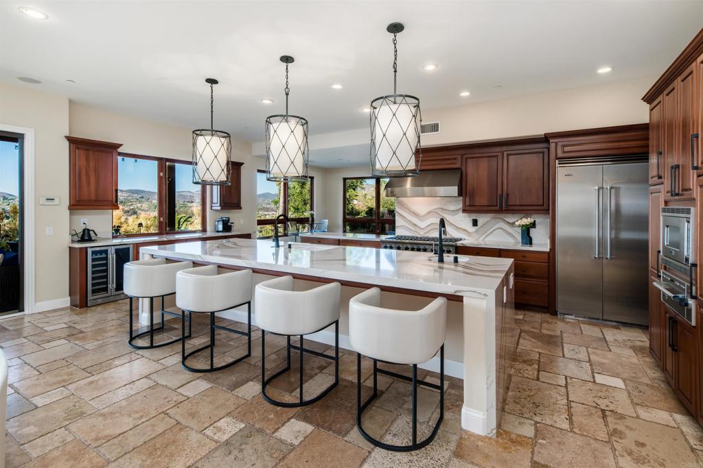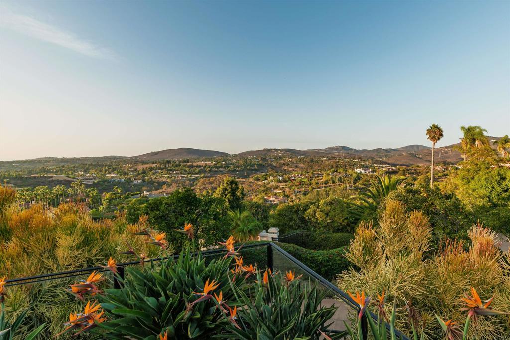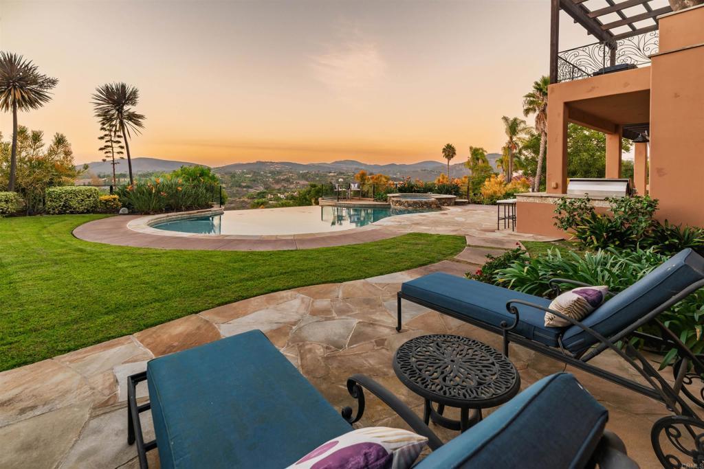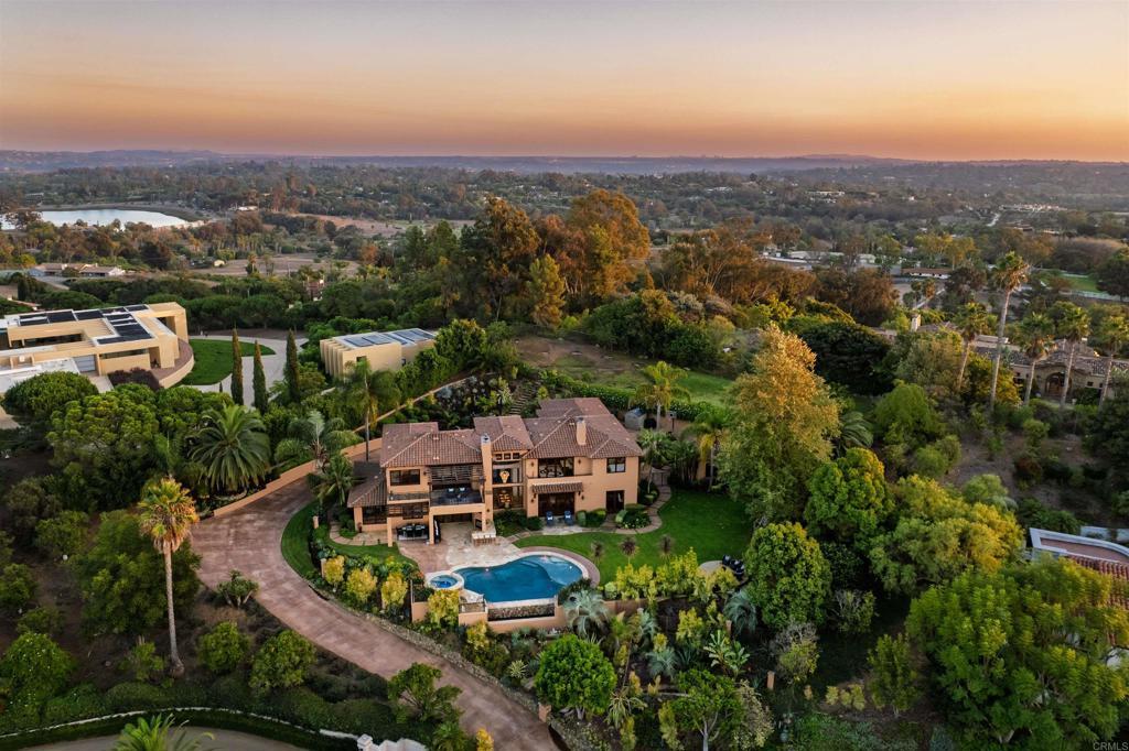 Perched to capture breathtaking views of Rancho Santa Fe, this remarkable estate in the prestigious gated community of The Groves is the epitome of refined luxury living. With only 39 residences in the community, exclusivity and privacy are unmatched. The main residence features five bedrooms and six bathrooms, with all upstairs bedrooms offering en suite baths, plus a spacious bonus room and a gorgeous office with custom cabinetry. A separate 1BR/1BA guest home is a fully functioning unit complete with a kitchenette—ample storage, microwave, a two-burner stovetop, and even a compact dishwasher—offering comfort and independence for visitors. The open floor plan is ideal for modern living and entertaining. The kitchen is a chef’s dream, outfitted with premium Viking appliances, including a built-in refrigerator, an 8-burner commercial-style stove, dual dishwashers, and a warming drawer. From there, the flow continues through elegant living and dining spaces to patios and terraces that frame wide-open views. Upstairs, the primary suite opens to an expansive private terrace through dramatic bi-fold doors. Step outside and experience your own retreat, where sweeping panoramic vistas of the Rancho Santa Fe hills create a setting as tranquil as it is majestic. Set on 1.23 acres of lush grounds, the property includes mature landscaping, an orchard with abundant fruit trees, a lush lawn, and resort-style amenities. An infinity-edge pool and spa, built-in BBQ, outdoor fireplace, and fire pit provide endless opportunities to relax or entertain beneath the California sun. The home also features an oversized four-car garage with a convenient drive-through design—perfect for a car collection, additional storage, or flexible workshop space. The views are truly remarkable. From the backyard to the pool to the terraces above, the estate was designed to embrace the natural beauty of Rancho Santa Fe’s rolling hills from every vantage point. Located just minutes from multiple highly regarded golf courses, fine dining, boutique shopping, and pristine coastal beaches, this estate blends tranquility with accessibility. It also falls within the boundaries of the highly acclaimed Roger Rowe Elementary and Middle schools, consistently top-ranked for academic performance. This home is truly one-of-a-kind—an exclusive retreat that balances timeless elegance with the very best of Rancho Santa Fe living. For those who expect nothing less than extraordinary, this estate delivers.