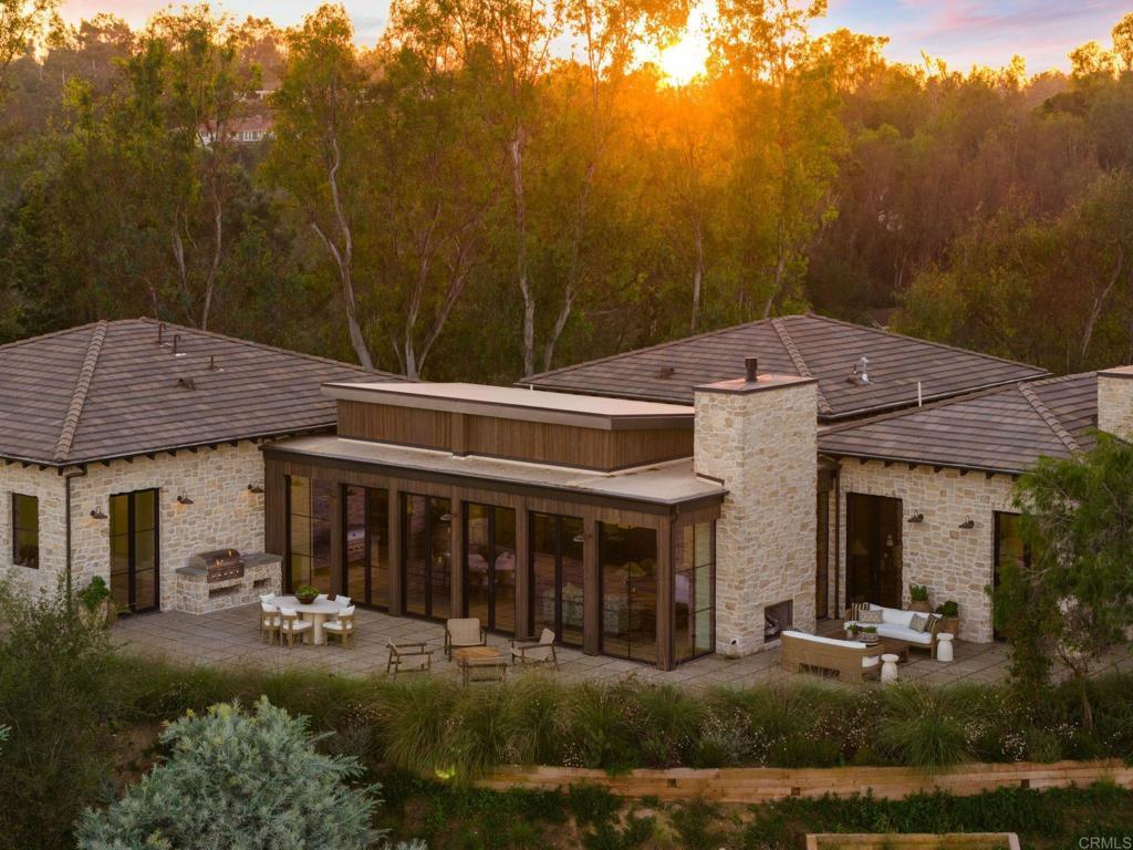 A New Construction Masterpiece Above the Clouds in the West Side Covenant of Rancho Santa Fe. Perched upon a desirable hilltop in Rancho Santa Fe, this spectacular new construction ranch estate with a modern twist was completed in 2025 and offers a top-of-the-world location, granting rare sweeping views from East to West that allow you to live in serenity among the treetops. It is a private sanctuary, a genuine West Side Covenant home, that flawlessly merges timeless craftsmanship with contemporary luxury. The 4,359 SF, single-level residence is set on 1.54 meticulously maintained acres. It delivers 4 bedrooms, 3.5 spa-inspired bathrooms, a dedicated office, and a media room, all unified by an effortless, transparent indoor-outdoor flow. The architecture masterfully blends warm natural stone, rich wood accents, and expansive walls of glass that act as art, flooding the interiors with curated light. Inside, vaulted ceilings with exposed beams soar above the open living and dining spaces. The chef’s kitchen, a study in functional elegance, pairs bespoke custom cabinetry with high-performance stone surfaces, a commanding center island, and professional-grade appliances. Thoughtful design details, including wide-plank oak flooring and meticulously curated lighting, ensure every corner of the home feels both refined and utterly comfortable. The private primary suite is a true retreat, opening directly onto the patio with restorative views across the rolling hills. Outside, the property is framed by multiple entertaining terraces and lounging areas, complete with an outdoor fireplace, the perfect settings for taking in the daily, vibrant sunsets. Beyond the main residence, amenities include an 827 SF 3-car garage and meticulously landscaped grounds designed for low-maintenance beauty. This newly built estate offers a rare combination of contemporary design, single-level ease, and an unmatched location that is just minutes from the beach, the iconic Racetrack, polo fields, world-class golf, top-rated schools, and the charming Village of Rancho Santa Fe.
