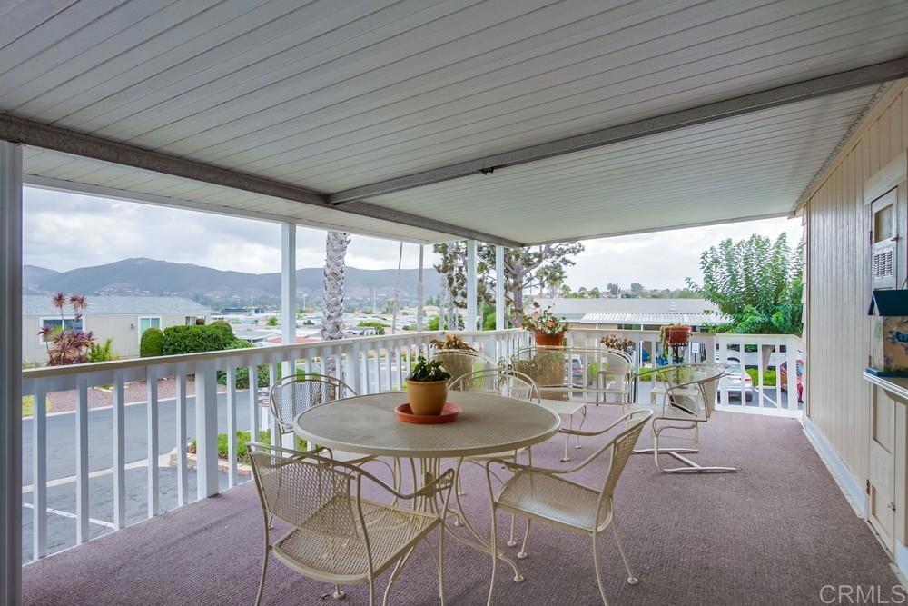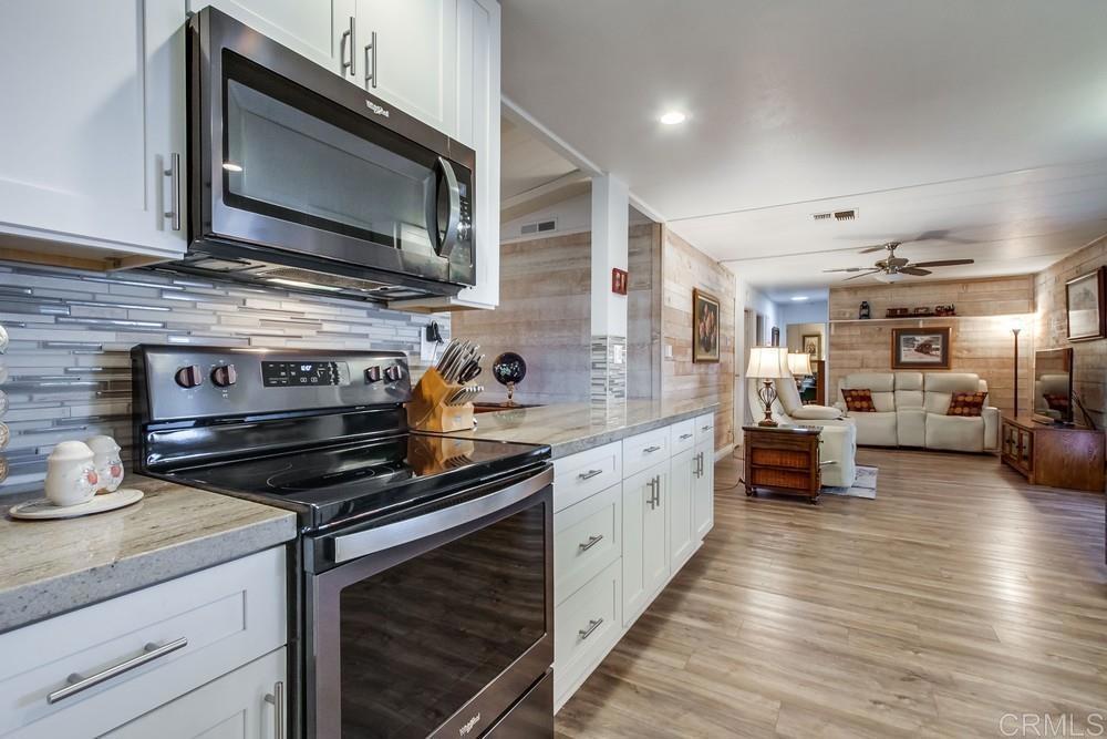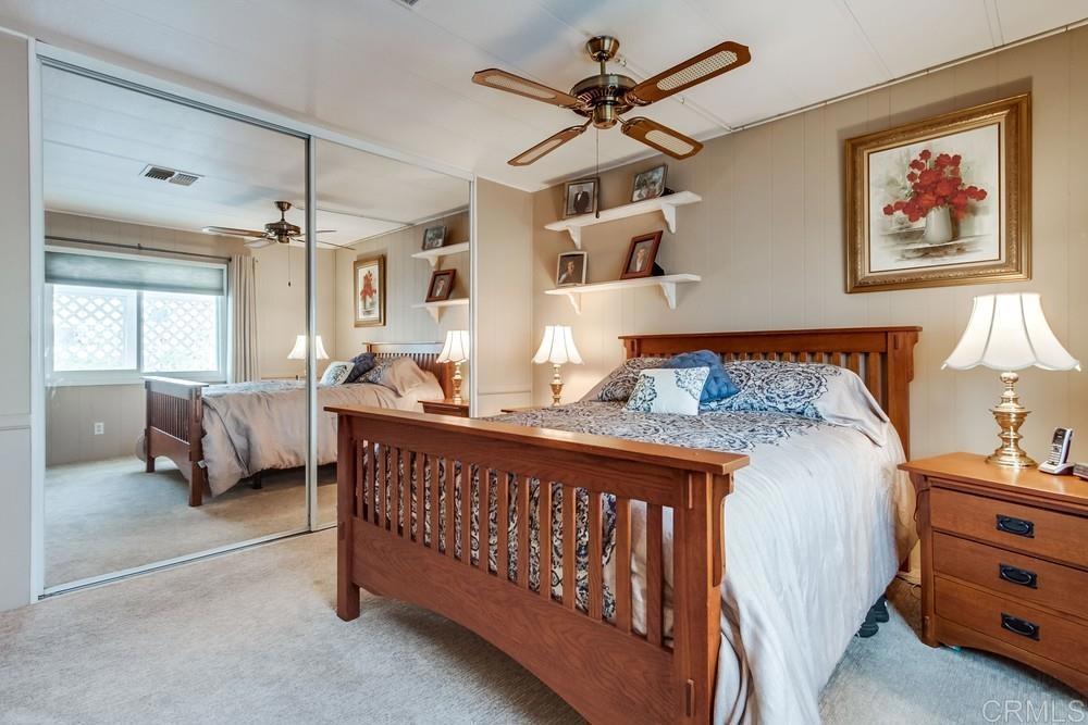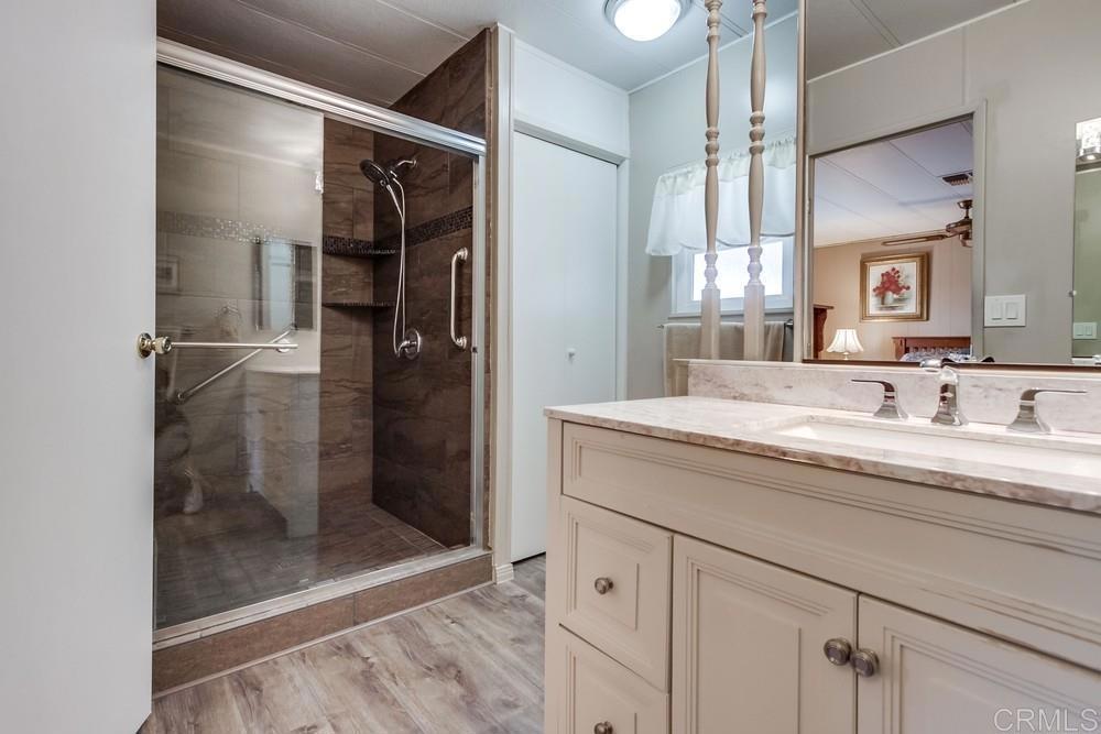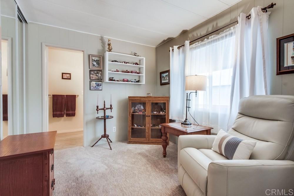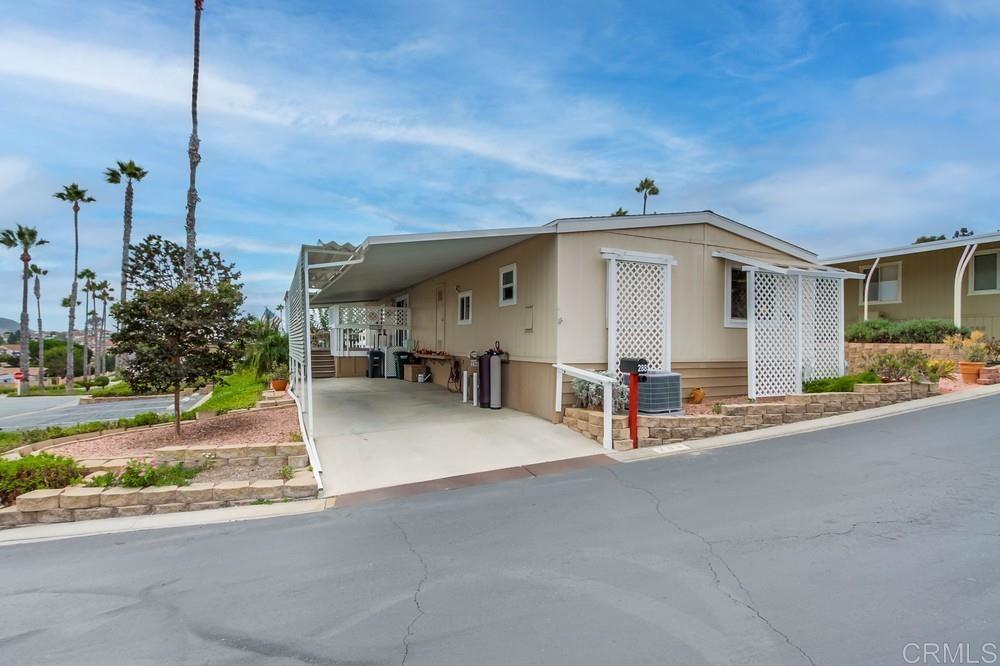 Beautifully updated home in highly desired Palomar Estates West. The open floor plan and vaulted ceiling in the living room make this home feel very spacious. The stunning kitchen has been remodeled with white shaker cabinets and natural stone countertops. The primary bedroom has an on-suite bathroom with a gorgeous tiled shower. The second bedroom has a large sitting area that can be used as an office. The home has dual pane vinyl windows throughout that will keep the home very comfortable in the wonderful San Marcos weather. Plank vinyl flooring is located throughout the main living areas. From the back porch you can enjoy beautiful sunrises and views of the surrounding hills. There is a large shed to store your extra items and lots of guest parking right next to the house for your guests. The home is on registration which means NO PROPERTY TAX. Palomar Estates West is a 5 star 55+/35+ senior rent controlled park with many activities and amenities including a beautiful clubhouse, pool, spa, gym, putting green, pickleball courts, and tennis courts. This home is located minutes to Lake San Marcos dining and golf as well as local Carlsbad beaches, shopping, and restaurants.