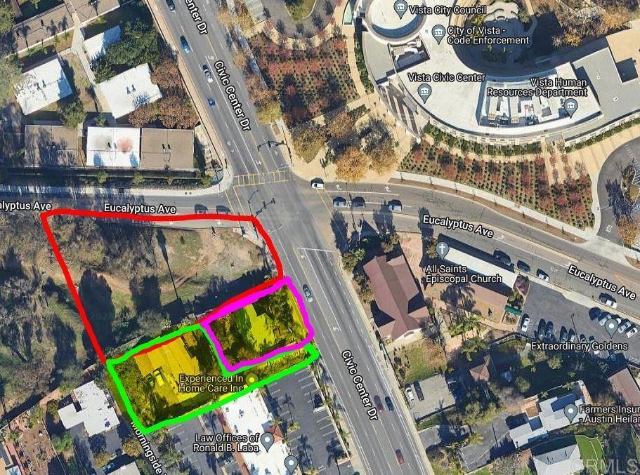Fixer 3 bed/2 bath house needing your TLC to make it your home. SOLD AS IS. Deferred maintenance-repairs needed with 1 of the 2 bathrooms needing fixtures. Great location right across the street from City of Vista Civic Center complex. Walking distance to restaurants, shops, light rail train and many Vista City services. 211 Civic Center Dr home directly behind and adjoining corner lot at Eucalyptus Ave & Civic Center Dr are also listed for sale separately. Buy all 3 properties and develop all together as an 1 acre lot development. Mixed Use Zoning-Downtown Specific Plan w/lots of permitted options. See attached Vista plan doc.