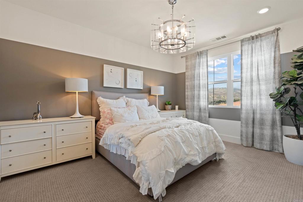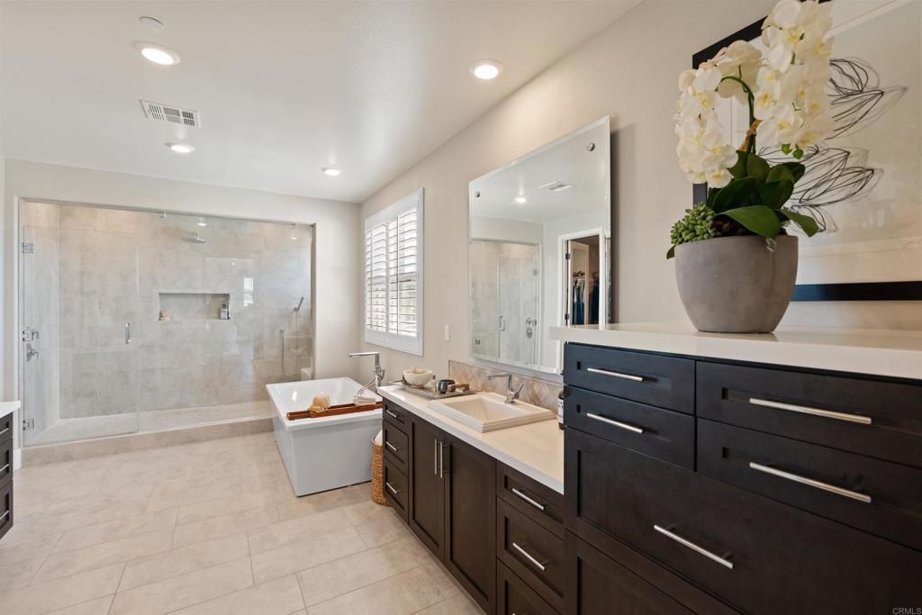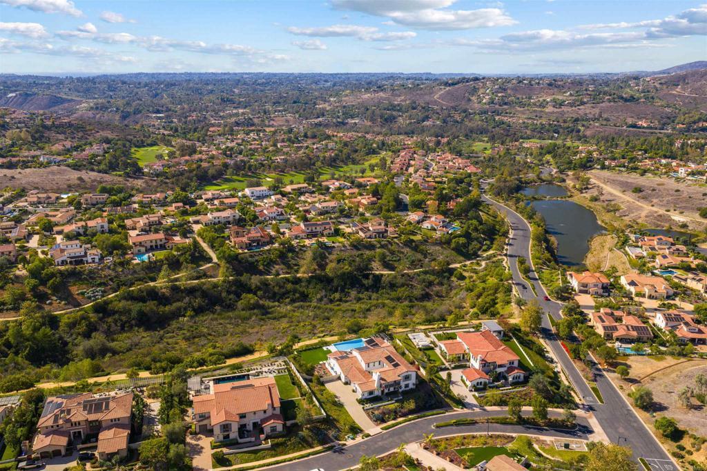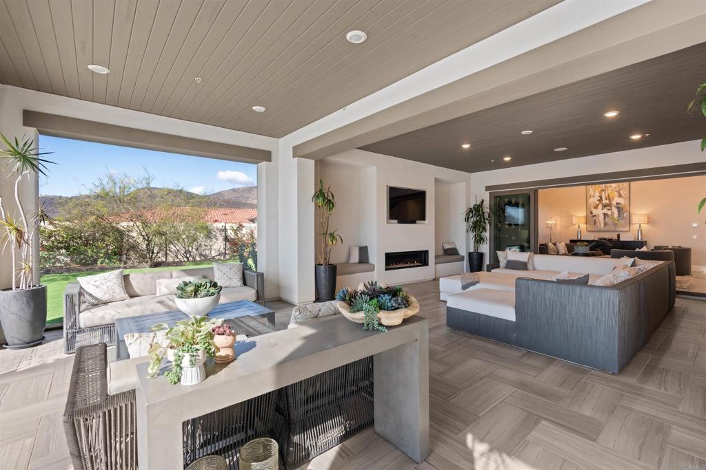 Perched above the hills in the prestigious guard-gated enclave of Sterling Heights at The Lakes above Rancho Santa Fe, this remarkable 6,063-square-foot, five-bedroom, six-bathroom estate embodies modern California luxury with breathtaking panoramic views that stretch endlessly to the horizon. As the sun sets, the sky transforms into a canvas of gold and rose tones, reflected across the striking infinity-edge pool—an unforgettable backdrop for evenings spent fireside or entertaining under the stars. This residence that served as the model home when the community was being developed, blends architectural sophistication with effortless livability. The open-concept layout flows gracefully through expansive living and dining areas designed for both grand entertaining and relaxed everyday living. The chef’s kitchen is a true showpiece, outfitted with Monogram appliances, including a six-burner dual range with griddle, built-in refrigerator and butler's pantry, all framed by elegant designer finishes that elevate both form and function. Designed for true Southern California living, the home’s multi-panel panoramic sliding glass doors open wide to a spectacular extended indoor/outdoor living space. A spacious covered patio with fireplace becomes a seamless extension of the interior, enclosed with custom motorized Neo smart blinds that transform the area into an all-season retreat. This remarkable integration allows light, air, and ambiance to flow effortlessly between spaces, creating a lifestyle defined by openness and connection. A highlight of the floor plan is the Next Gen “Home Within a Home” suite, offering the perfect solution for multigenerational living, guest privacy, or older children seeking independence. It includes a private entrance, living area, kitchenette, laundry, bedroom, and bathroom—providing comfort and autonomy while remaining connected to the main residence. The primary suite is a tranquil haven featuring a spa-like bath with an oversized shower, freestanding soaking tub, and luxurious finishes that evoke a sense of calm and rejuvenation. The outdoor spaces rival any five-star resort. The infinity-edge pool has been completely reimagined to highlight the home’s commanding views, with solar heating, LED multicolor smart lighting, and beautifully designed lounging areas ideal for both day and night. Every detail reflects thoughtful luxury, from the Sonos full-home audio system—including the courtyard—to the epoxy-coated four-car garage with built-in cabinetry and fixed overhead storage. Set within The Lakes, one of North County’s most desirable gated communities, residents enjoy the security of a 24-hour guard gate and the serenity of scenic streets surrounded by open space and mountain vistas. Just steps from the home, miles of picturesque walking, running, and cycling trails wind through the community, offering a peaceful connection to nature and an active outdoor lifestyle. Homeowners also enjoy the proximity to The Crosby Club, featuring a championship golf course, clubhouse dining, fitness center, and racquet courts. Located within the highly acclaimed Poway Unified School District, this address offers prestige, comfort, and an unparalleled lifestyle. This is more than a home—it’s a statement of refined design, natural beauty, and effortless luxury, where every sunset feels like a personal masterpiece.