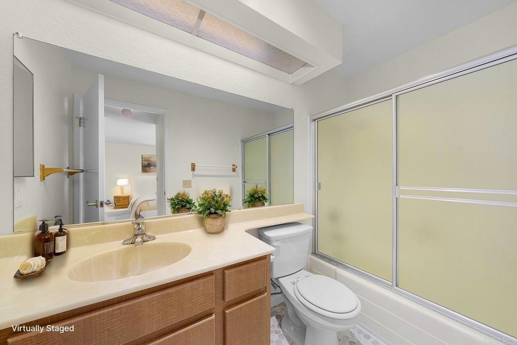 Welcome home to this rarely available upstairs corner unit in highly coveted Woodbridge Estates! This bright and beautifully refreshed 1-bedroom, 1-bath condo in the heart of Serra Mesa offers the perfect blend of comfort, convenience, and modern charm. Step inside to discover brand new interior paint, plush new carpeting, and an inviting open floor plan filled with natural light. The living room features a cozy fireplace and seamless flow to your private balcony, ideal for enjoying your morning coffee or winding down at sunset. The thoughtfully designed layout includes a spacious walk-in closet, in-unit stackable laundry, and additional hall & balcony storage for year-round comfort. The Woodbridge Estates community elevates everyday living with two sparkling pools, relaxing spas, and BBQ areas—perfect for unwinding or entertaining friends. Enjoy two assigned parking spaces, a rare convenience in this area, plus a central location just minutes to Downtown, Mission Valley, shopping, dining, and major freeways—everything locals love right at your fingertips. And with the beach less than 20 minutes away, this home captures the best of coastal urban living! Whether you’re seeking a low-maintenance primary home or an excellent investment opportunity, this condo offers unmatched value in one of San Diego’s most desirable neighborhoods. Don’t miss your chance to call Woodbridge Estates home—schedule your private showing today! (Some photos have been virtually staged to illustrate the potential of the space.)