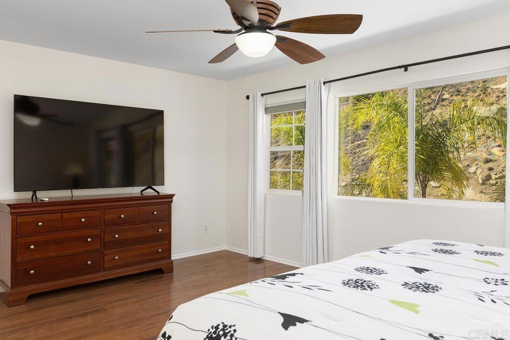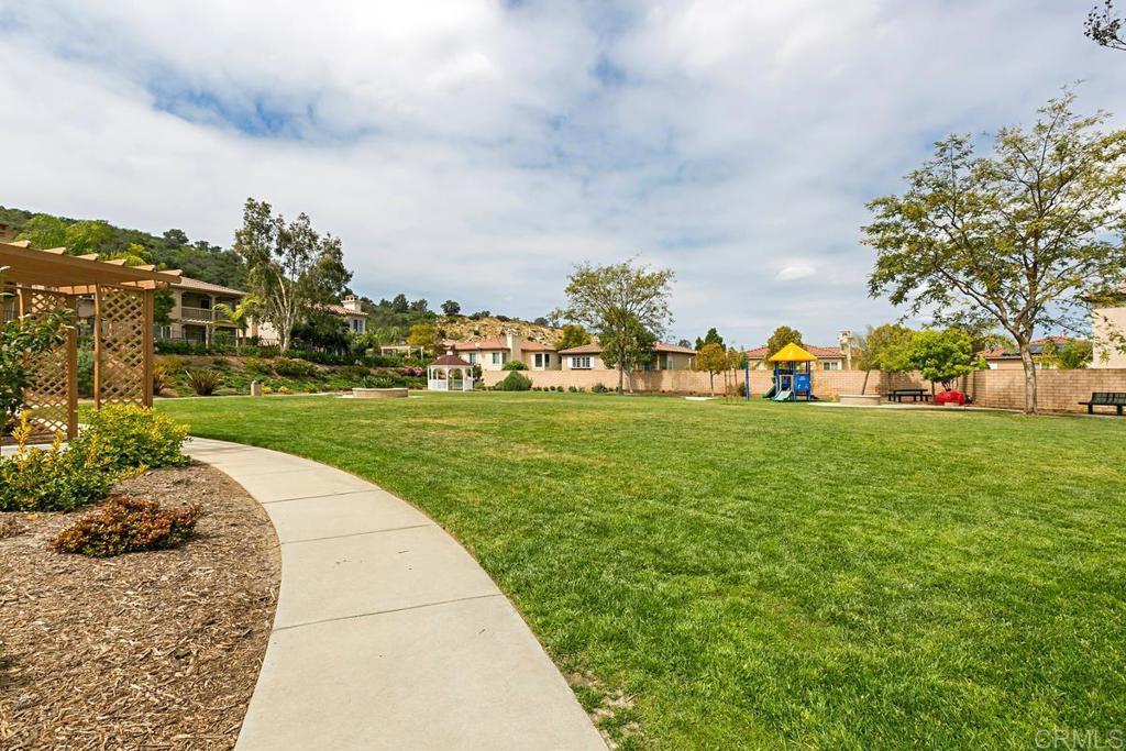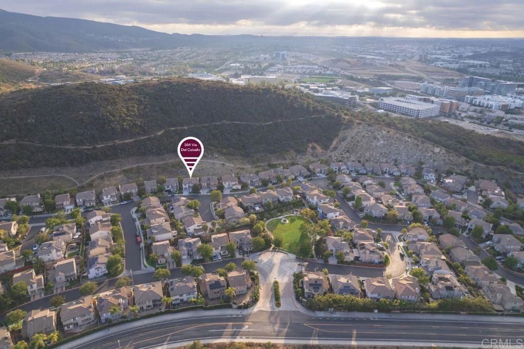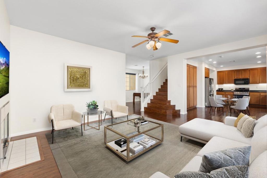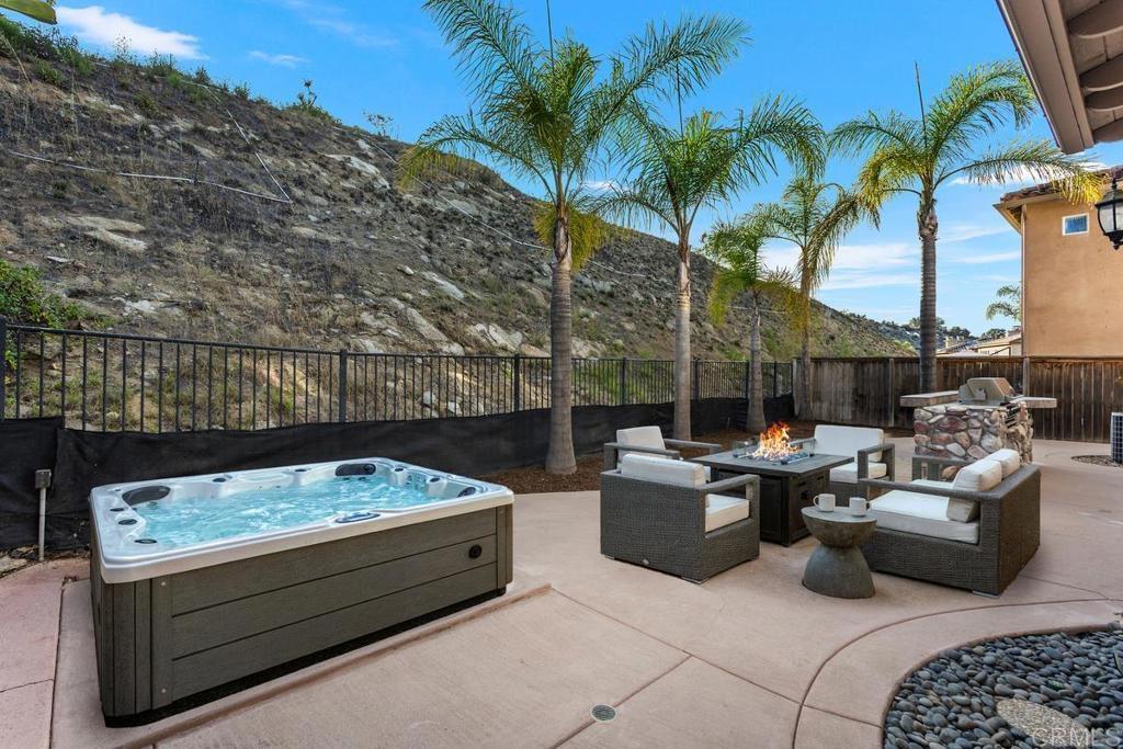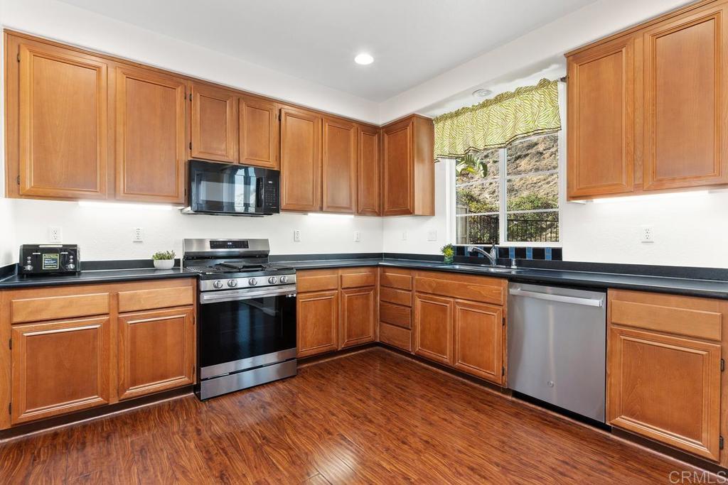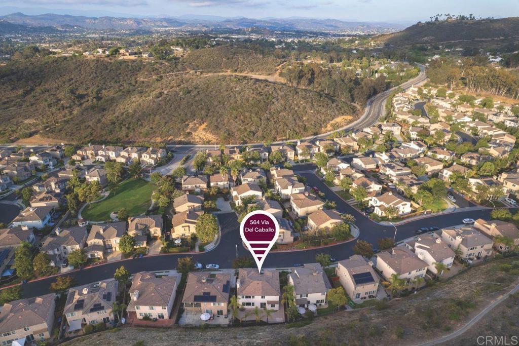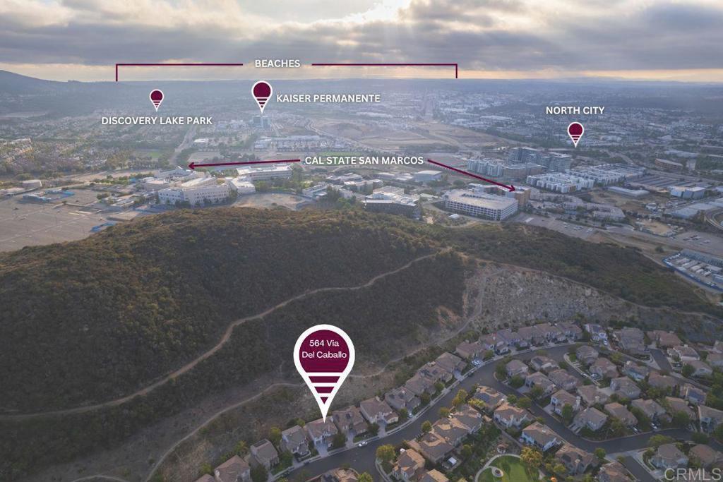 Tucked within the peaceful gated community of Belleza, this freshly painted, spacious home offers comfort, privacy, and flexibility. Positioned near the back of the neighborhood with no rear neighbors, it enjoys a quiet setting and scenic foothill backdrop. High ceilings and large windows fill the interiors with natural light and views of palm trees and nearby hills. Recent upgrades include engineered hardwood flooring, new roof underlayment, stainless steel appliances, updated lighting, and window treatments—creating a move-in-ready foundation for the next owner. The main level includes a bedroom and full bath—ideal for guests, office, or potential junior ADU. Kitchen and casual dining area offer generous storage plus garden and mountain views. The adjoining family room features gas fireplace and large windows that frame the private outdoor space; formal dining room adds a welcoming touch for gatherings. Upstairs, a flexible alcove and primary suite retreat provide spaces for reading nook, nursery, gym, or workspace. The primary suite features a wall of windows with nature views and ensuite bath with double vanity, soaking tub, separate shower, private water closet, and spacious walk-in closet. Two additional bedrooms, a hall bath, and large laundry room complete the upper level. Low-maintenance backyard features BBQ island, space for gardening and dining al fresco, and spa-ready pad with 220V hookup. Other highlights: 2 direct-access single-car garages and whole-house fan. HOA-maintained front yard and private community park. Close to Cal State San Marcos, Sprinter station, Kaiser and Palomar medical centers, vibrant dining, shopping, and abundant parks and reserves—enjoy the ease and vibrance of San Marcos living!