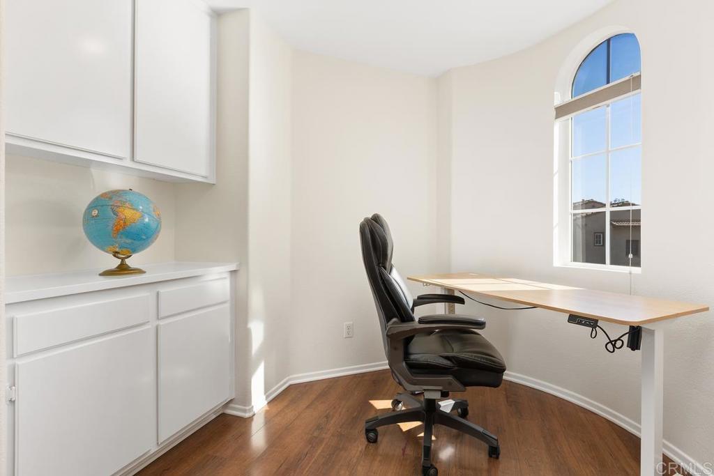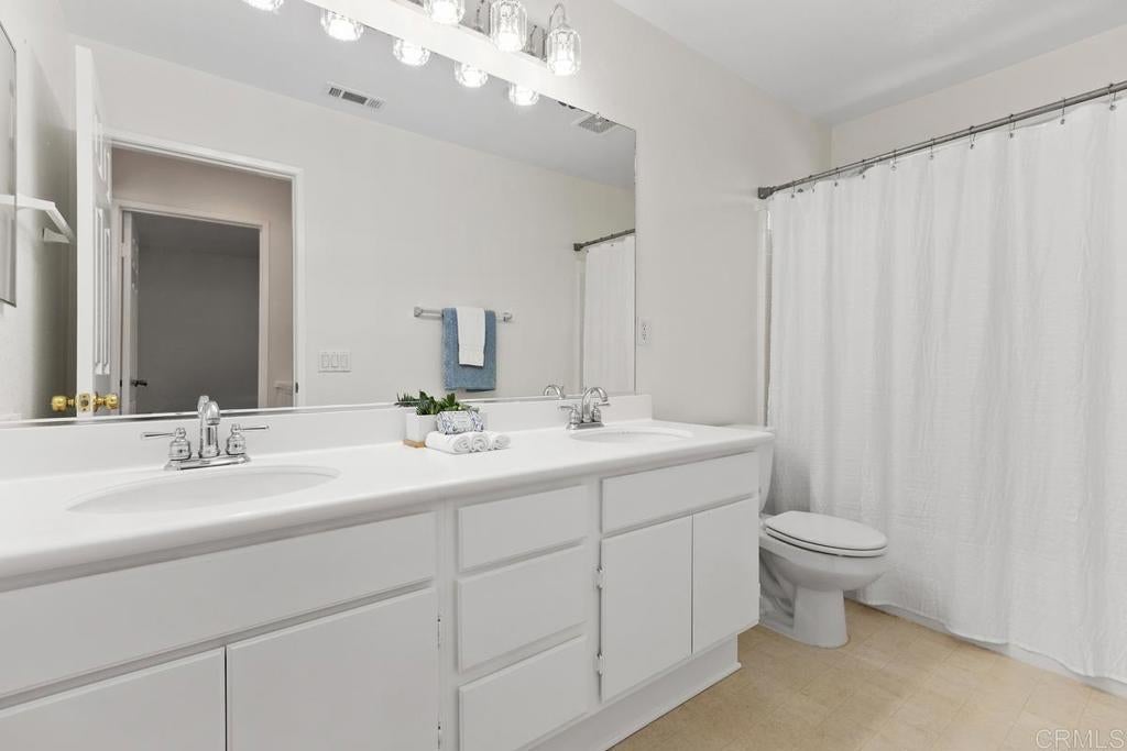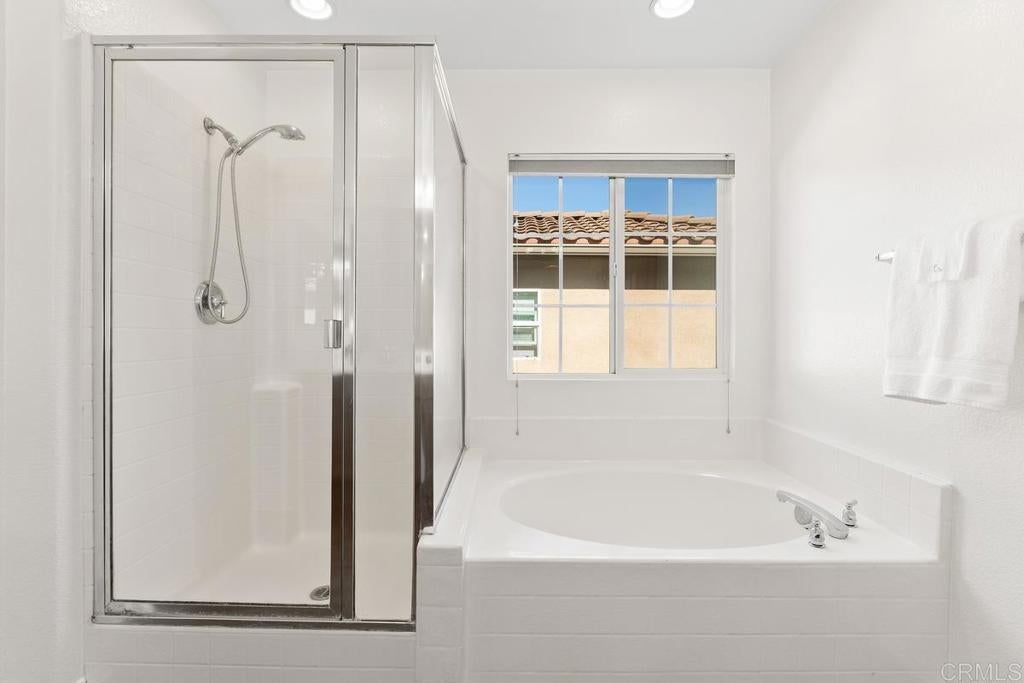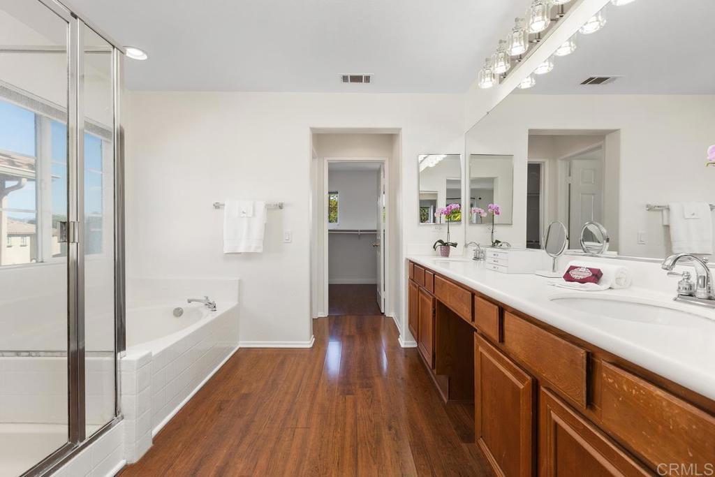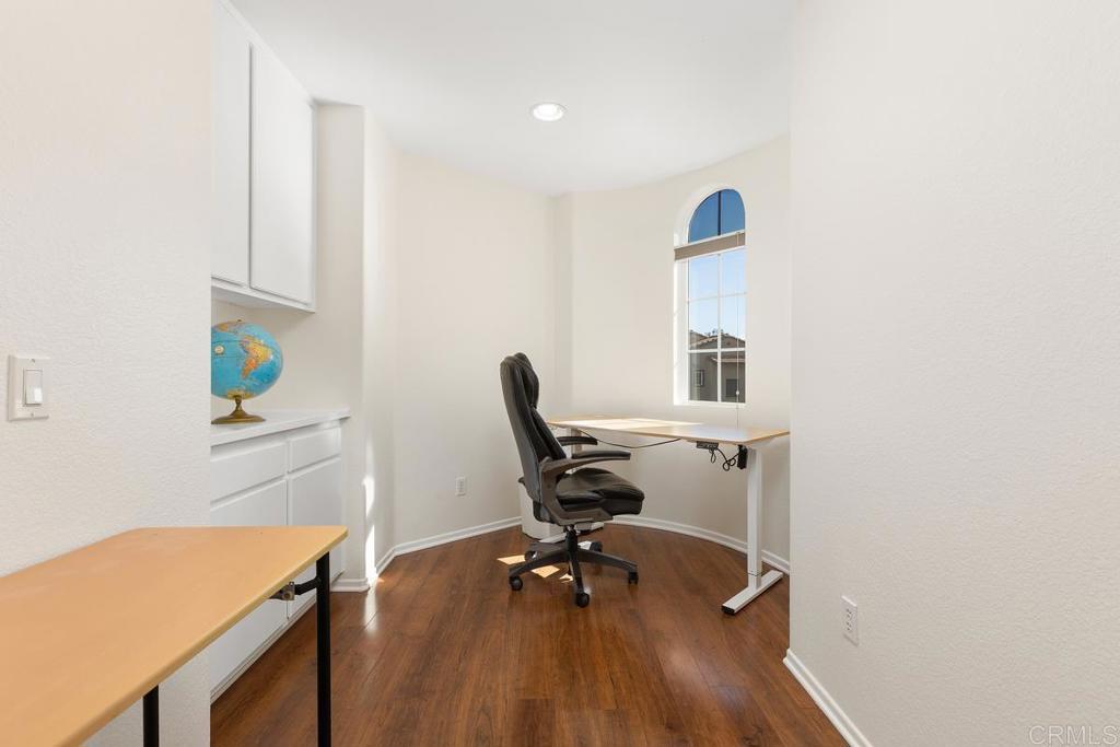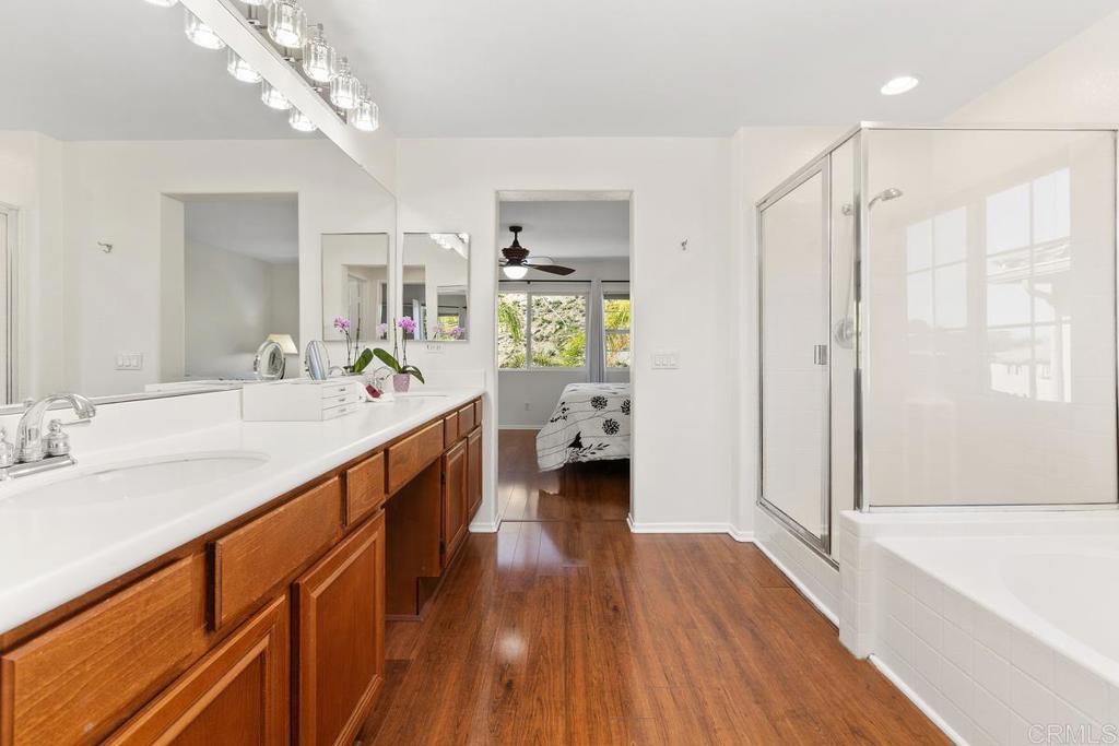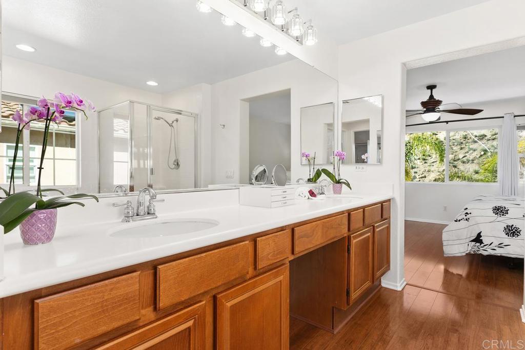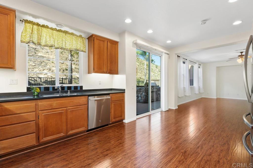 Tucked within the peaceful gated community of Belleza, this freshly painted, spacious home offers comfort, privacy, and flexibility. Positioned near the back of the neighborhood with no rear neighbors, it enjoys a quiet setting and scenic foothill backdrop. High ceilings and large windows fill the interiors with natural light and views of palm trees and nearby hills. Recent upgrades include engineered hardwood flooring, new roof underlayment, stainless steel appliances, updated lighting, and window treatments—creating a move-in-ready foundation for the next owner. The main level includes a bedroom and full bath—ideal for guests, office, or potential junior ADU. Kitchen and casual dining area offer generous storage plus garden and mountain views. The adjoining family room features gas fireplace and large windows that frame the private outdoor space; formal dining room adds a welcoming touch for gatherings. Upstairs, a flexible alcove and primary suite retreat provide spaces for reading nook, nursery, gym, or workspace. The primary suite features a wall of windows with nature views and ensuite bath with double vanity, soaking tub, separate shower, private water closet, and spacious walk-in closet. Two additional bedrooms, a hall bath, and large laundry room complete the upper level. Low-maintenance backyard features BBQ island, space for gardening and dining al fresco, and spa-ready pad with 220V hookup. Other highlights: 2 direct-access single-car garages and whole-house fan. HOA-maintained front yard and private community park. Close to Cal State San Marcos, Sprinter station, Kaiser and Palomar medical centers, vibrant dining, shopping, and abundant parks and reserves—enjoy the ease and vibrance of San Marcos living!