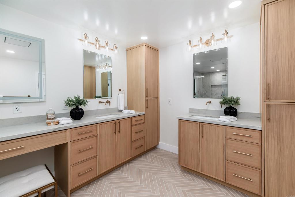 Step into this stunning, fully remodeled 4-bedroom, 3.5-bath home, where every detail has been thoughtfully crafted with high-end finishes and timeless modern style. From the brand-new interior to the lush new landscaping, this home offers the perfect blend of luxury, comfort, and sophistication. Inside, you’ll find custom cabinetry throughout the main living areas, engineered hardwood flooring, and quartzite countertops that add both beauty and durability. The kitchen is a true showpiece—featuring luxury appliances, a farmhouse sink, and an 8-burner Forno range with duel ovens that will delight any home chef. Designer touches elevate every corner, from the parquet onlay on the back of the kitchen island to the fluted accent wall in the primary bedroom. There’s abundant storage and beautifully crafted built-ins throughout. A convenient pass-through window connects the kitchen to the backyard deck, perfect for entertaining and al fresco dining. The extra-wide staircase leads to a spacious primary suite, complete with a large walk-in closet with custom built-ins and a private view deck overlooking the rolling hills and canyon views—the ideal spot to enjoy peaceful mornings or sunset evenings. The luxurious ensuite bath offers a spa-like retreat, showcasing an oversized wet-room style shower with a soaking tub inset, and exquisite modern brushed bronze fixtures and finishes. One of the additional bedrooms also features its own private ensuite bathroom, offering wonderful privacy for guests or multigenerational living. Every bathroom includes custom vanities, designer tile work, and brushed bronze faucets that tie the home’s modern aesthetic together. The den provides a warm, inviting space with a cozy fireplace and wet bar, perfect for relaxing or entertaining. A set of three-panel shaker doors opens from the living room to the backyard, creating a seamless indoor-outdoor flow. The front and backyards have been refreshed with all-new landscaping, new lawns, and a brand-new deck for easy outdoor living. The epoxy-coated garage floor adds both style and function, complementing the home’s long list of upgrades including a new roof, new windows, new HVAC system, and meticulous attention to craftsmanship in every finish. Located in one of Carlsbad’s most desirable neighborhoods, this home is close to top-rated schools, scenic parks, shopping, dining, and miles of nearby trails—just minutes from the coast. 2568 Abedul St is the definition of move-in ready—brand-new, beautifully designed, and ready to welcome you home.