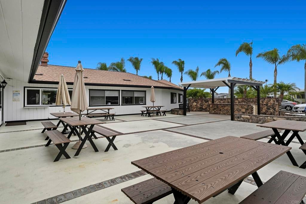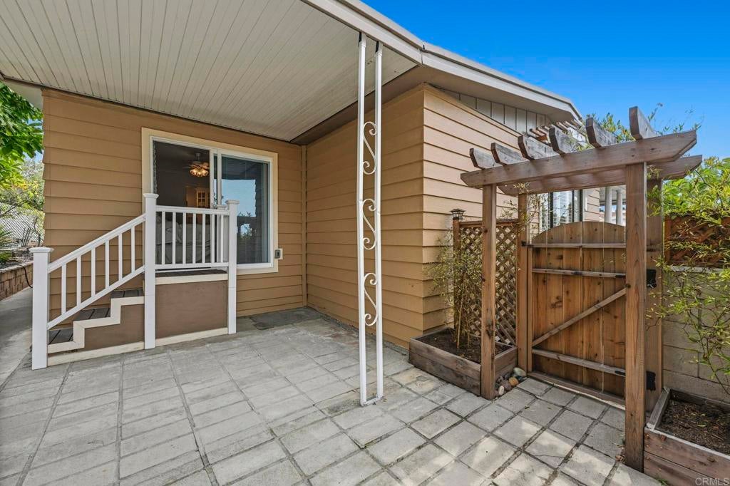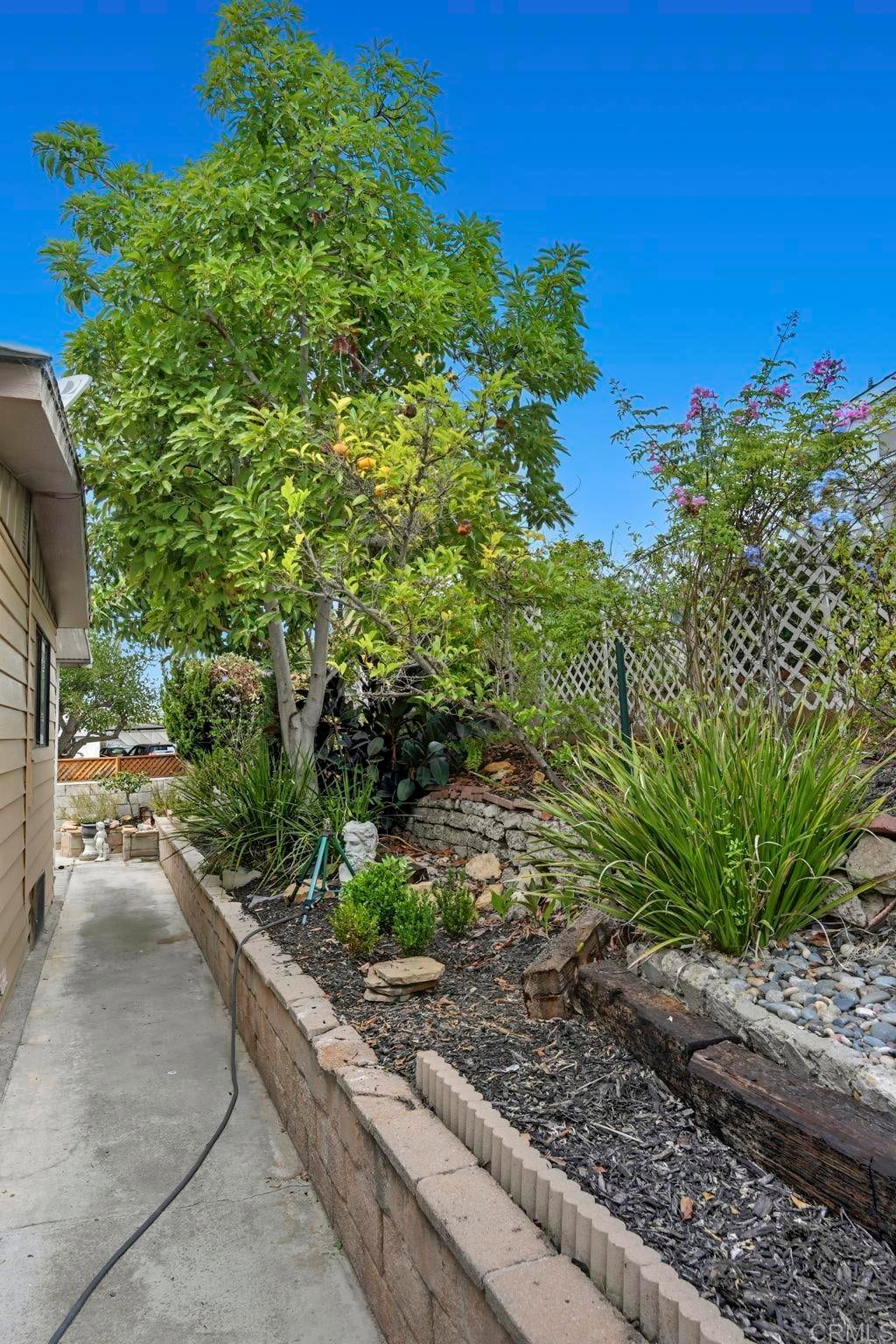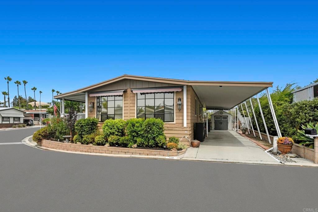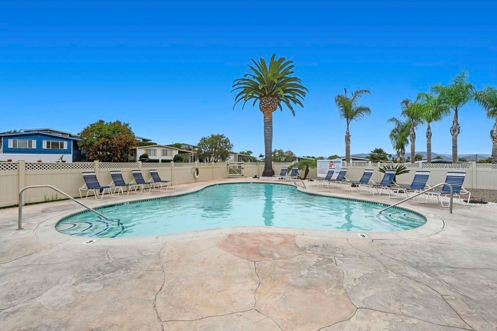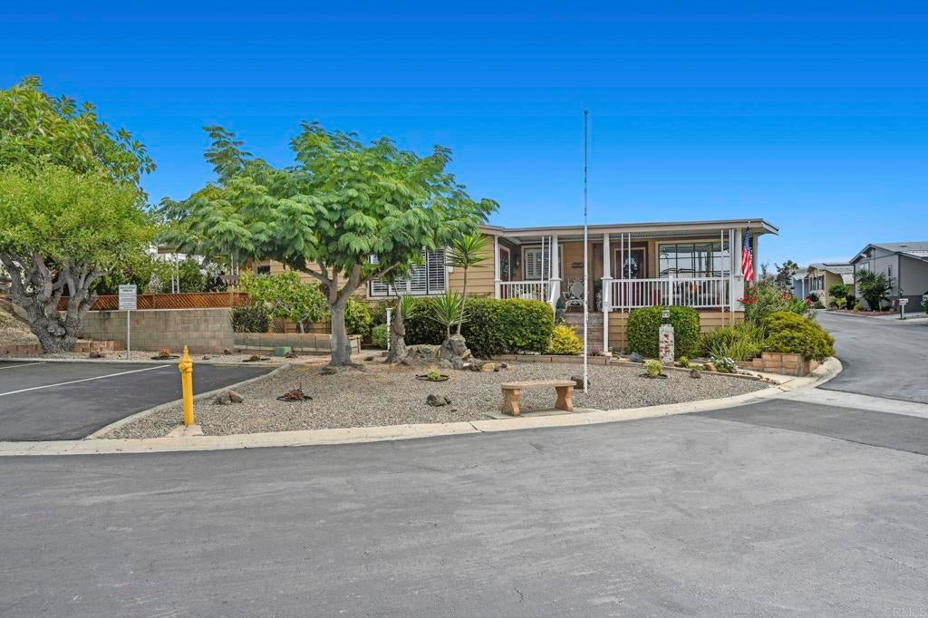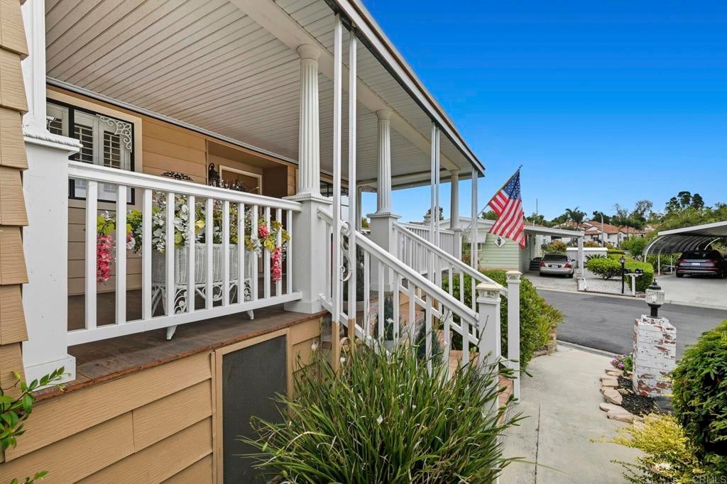 Sip your margarita while you enjoy your peek-a-boo ocean view sunset from your large custom porch in the beautiful and spacious 2 bedroom 2 bath located on a gently sloping corner lot surrounded by gardens, porches, patios, and views! Uniquely private and useable lot is completely landscaped front, back, and side yards. Low water succulents and plumeria in front, lime, lemon, and avocado in back and delicious fig on the side yard. The large home has been wonderfully updated with space for formal living area, family area, and a den/office. The large open kitchen with views to the west is perfect for the chef of the house. Enjoy a large master bedroom with over sized closet and slider to a private patio. Get ready for fun community activities or just unwind in your remodeled bathroom with quartz counters, lots of cabinet space and a claw foot tub. Large lot is one of the most spacious in the Community and adjacent to 3 guest parking spaces and shady tree on the West side of home. Walking distance to putting green, lawn bowling, and picnic area. The community has a pickleball, pool, tennis courts, club house and community events! Walk to shopping, bank and restaurants. Located just a short drive from Carlsbad, Encinitas, Vista, or Escondido, this freshly extensively renovated home is Move-In Ready! No property tax. Space fee is $584 per month and includes water/trash /sewer