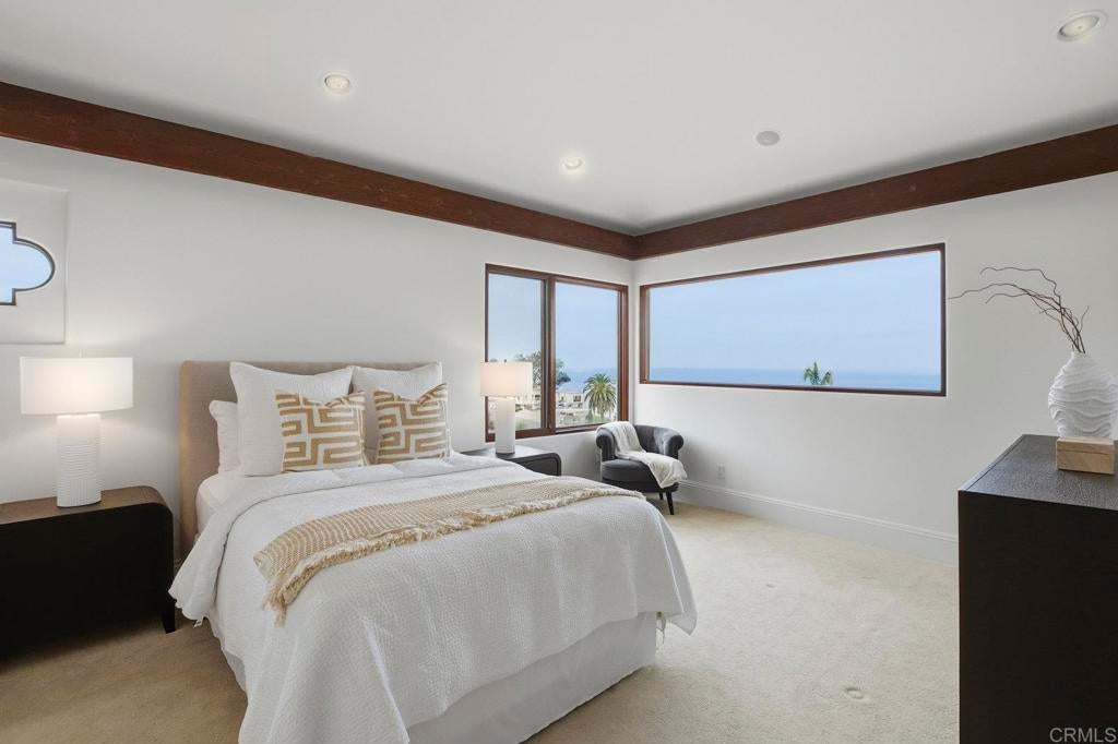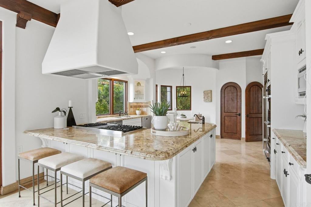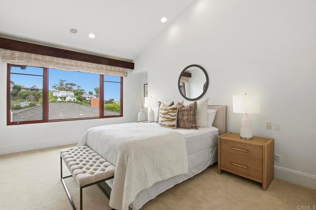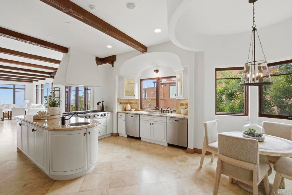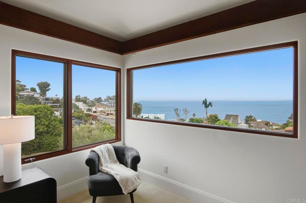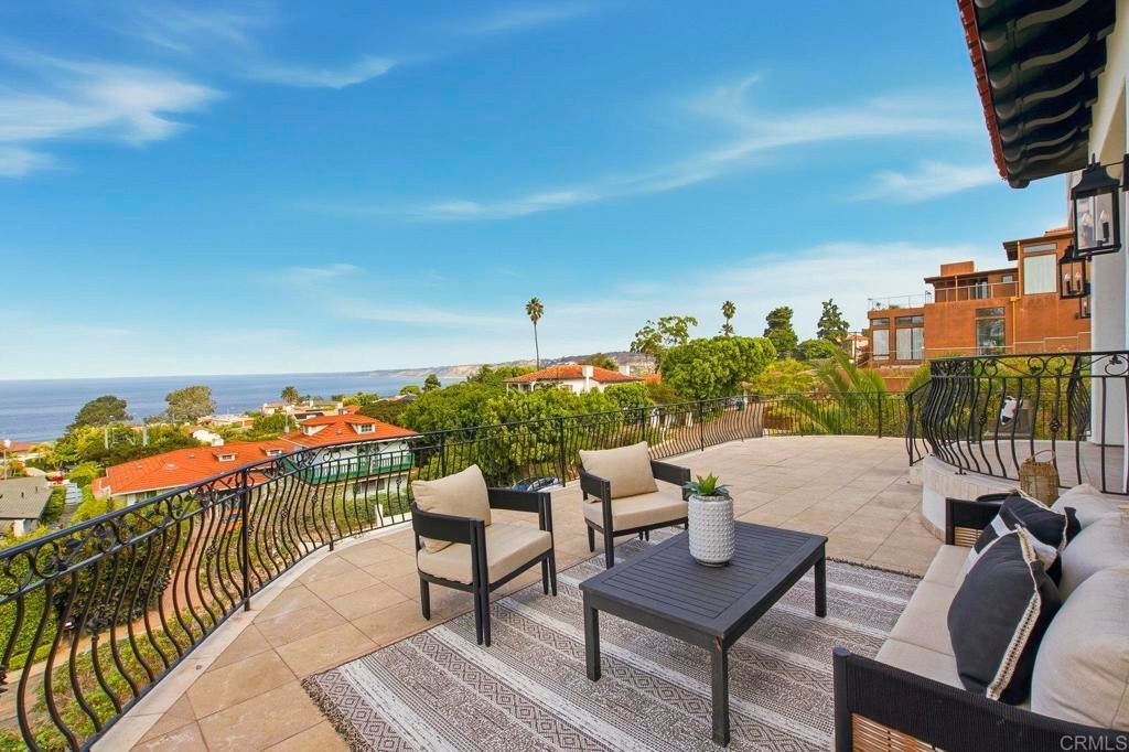Perched above La Jolla Village with commanding Pacific and coastline views, this timeless Santa Barbara–inspired villa blends classic architecture with modern coastal luxury. Nearly 5,000 sq ft of light-filled interiors capture beautiful ocean views from every room, highlighted by vaulted and exposed-beam ceilings, Limestone floors, French doors, and elegant custom finishes. The open chef’s kitchen features a large stone-topped island, sleek white cabinetry, and top-of-the-line stainless-steel appliances, opening to the great room and expansive outdoor living areas. A spacious ocean-view patio invites al-fresco dining, sunset gatherings, and relaxed coastal entertaining. The private primary suite enjoys its own balcony overlooking La Jolla Shores and Scripps Pier, a spa-inspired bath, and generous walk-in closet. Three additional bedrooms also offer sweeping views. The spectacular home theater with eight plush reclining chairs delivers an authentic cinematic experience. Additional features include 4.5 baths, a newly refreshed interior and exterior, and an oversized 2½-car attached garage with ample storage. Light, bright, and meticulously maintained, this exceptional home captures the essence of La Jolla living—panoramic ocean vistas, timeless design, and an easy stroll to the Village’s boutiques, cafés, and beaches.