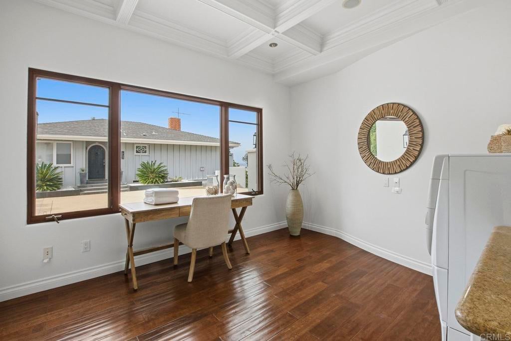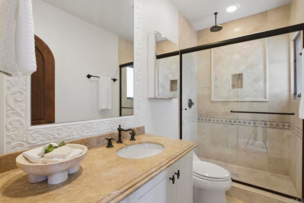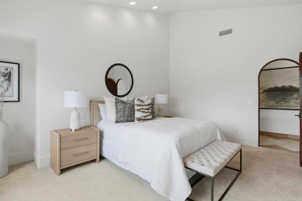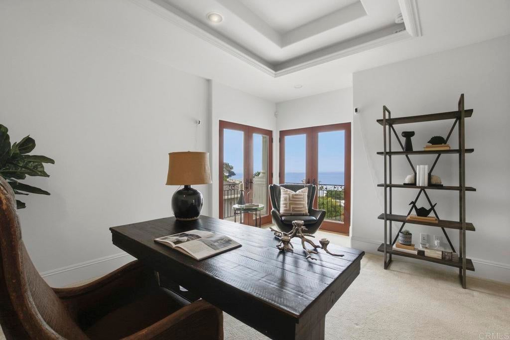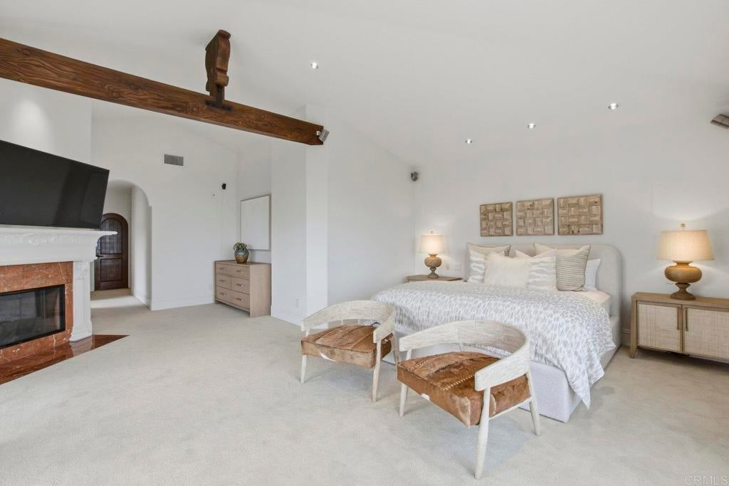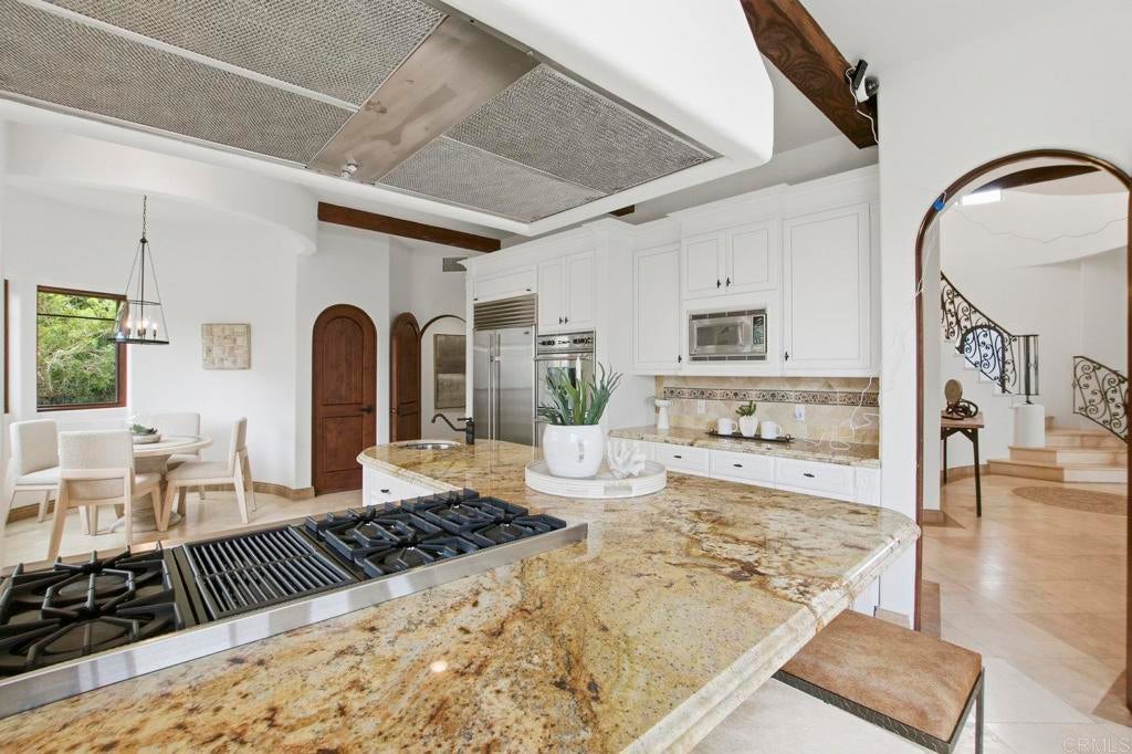 Perched above La Jolla Village with commanding Pacific and coastline views, this timeless Santa Barbara–inspired villa blends classic architecture with modern coastal luxury. Nearly 5,000 sq ft of light-filled interiors capture beautiful ocean views from every room, highlighted by vaulted and exposed-beam ceilings, Limestone floors, French doors, and elegant custom finishes. The open chef’s kitchen features a large stone-topped island, sleek white cabinetry, and top-of-the-line stainless-steel appliances, opening to the great room and expansive outdoor living areas. A spacious ocean-view patio invites al-fresco dining, sunset gatherings, and relaxed coastal entertaining. The private primary suite enjoys its own balcony overlooking La Jolla Shores and Scripps Pier, a spa-inspired bath, and generous walk-in closet. Three additional bedrooms also offer sweeping views. The spectacular home theater with eight plush reclining chairs delivers an authentic cinematic experience. Additional features include 4.5 baths, a newly refreshed interior and exterior, and an oversized 2½-car attached garage with ample storage. Light, bright, and meticulously maintained, this exceptional home captures the essence of La Jolla living—panoramic ocean vistas, timeless design, and an easy stroll to the Village’s boutiques, cafés, and beaches.