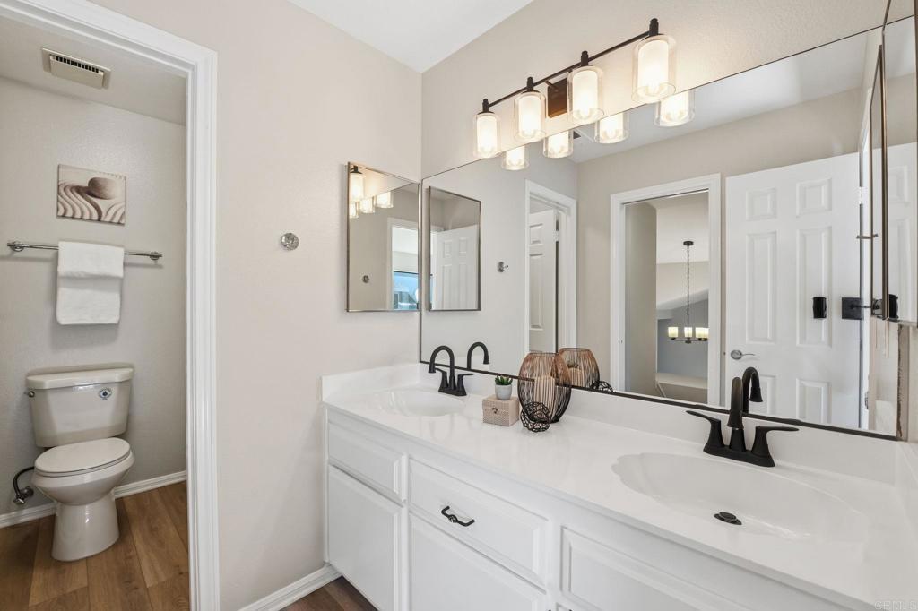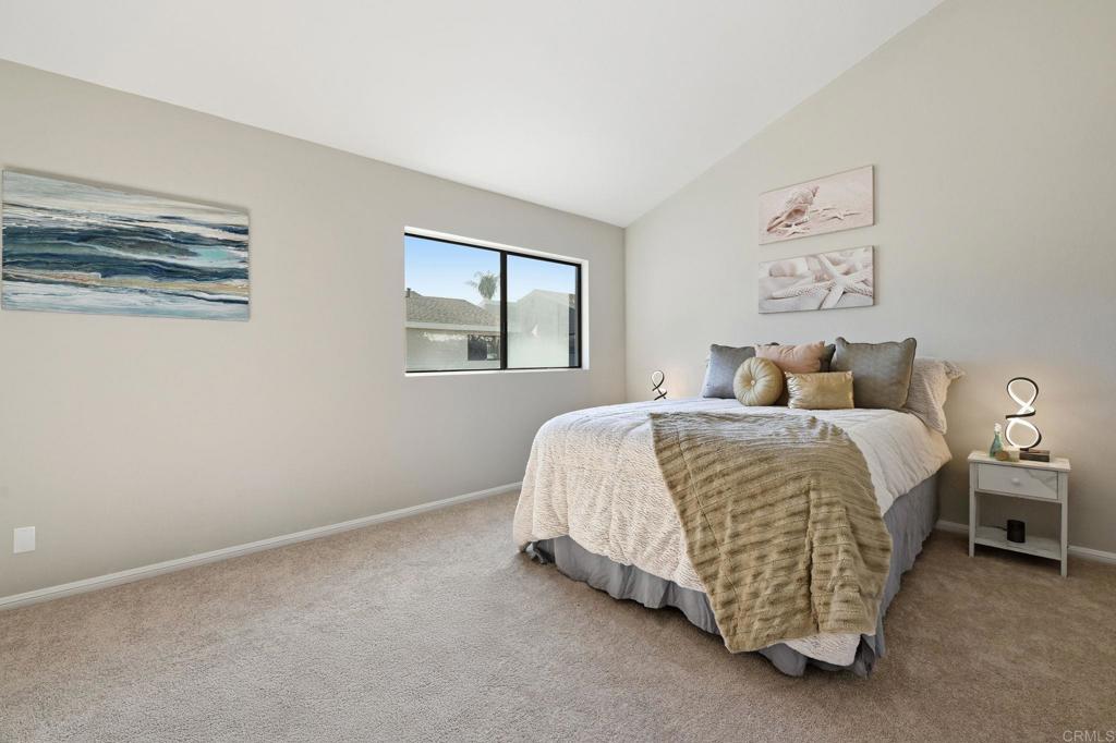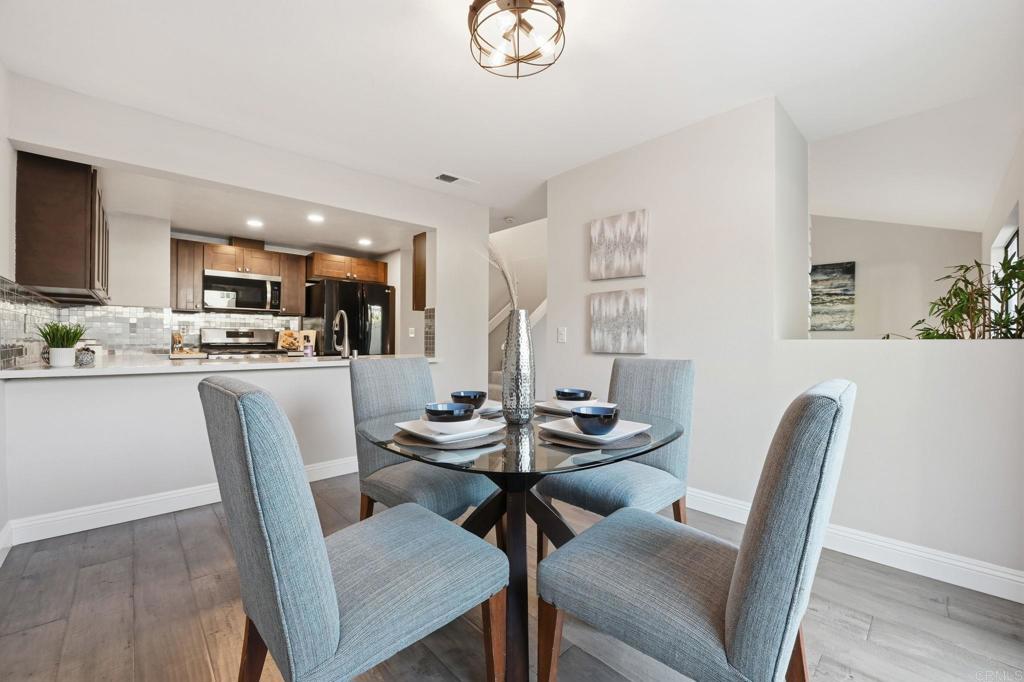Newly renovated townhome with an oversized attached two-car garage. Bright and open with vaulted ceilings in the living room and great natural light throughout. The handsome brick fireplace adds warmth and character to the space. The kitchen is perfect for entertaining, featuring stainless steel appliances, quartz countertops, abundant counter space, and plenty of cabinetry, and it opens to a large dining area. The interior has been freshly painted and features wood floors along with updated kitchen and bathrooms. Upstairs, all bedrooms have vaulted ceilings, including a huge primary suite with two closets and dual sinks in the bathroom. The secondary bedrooms are spacious, and the private back patio provides a peaceful place to relax. Located in a serene community with a pool, spa, clubhouse, and gym. Great central location! Close to Tri City Medical Center, shopping, restaurants, and freeway access.