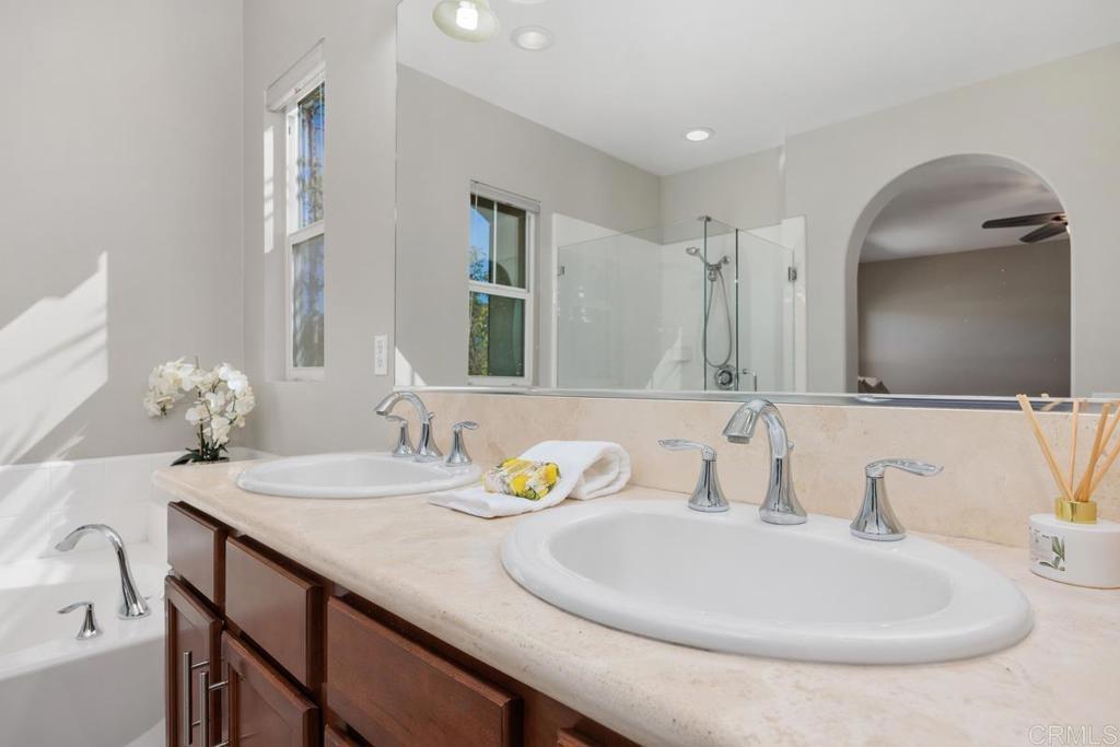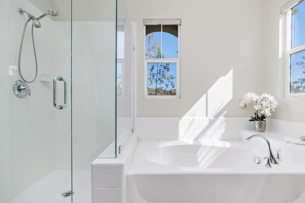 This peaceful single family home in the community of 53 Melrose among the most charming circle of homes in the La Costa Ridge section of Carlsbad built in 2011 Pristine condition home with classic timeless decor The kitchen says it all!! Brand new white kitchen with white Quartzite counter tops, marble herringbone backsplash, large plank tile flooring, gold hardware and large farmhouse sink. The Primary suite is light bright and spacious with a large soaking tub, new frameless glass shower surround, private balcony. Dr Horton built the home to be efficient with a gas fireplace in the family room that puts out heat, stays cool in the summer but has A/C if needed. Handscraped hardwood low maintenance flooring on the 1st floor. Upstairs there is a family Bonus room/loft/office with 3 bedrooms ALL ensuite with black out shades, laundry room, Newer water heater. Private outdoor entertainment area has new sod with easy access to the kitchen for outdoor entertaining, low maintenance landscaping on low water system, Extra long driveway for plenty of parking. 2028 sq ft with 3bed 4bath low HOA, TOP school district of SMUSD