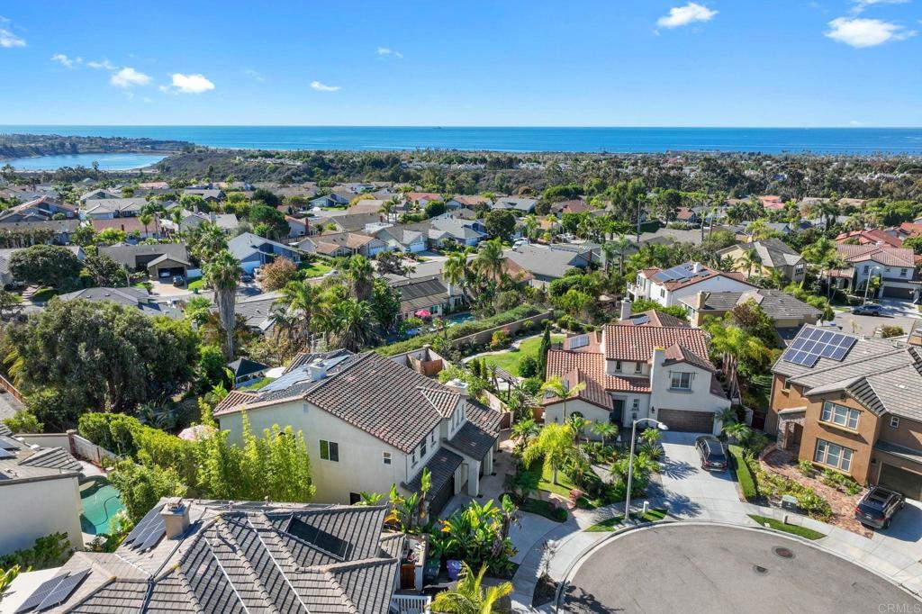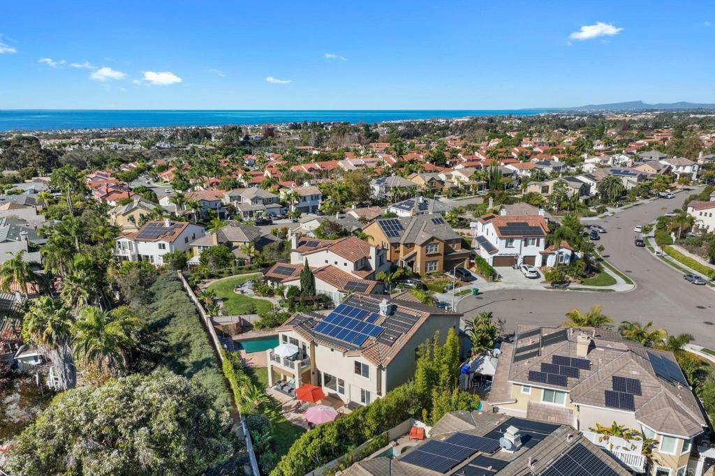 Welcome to this beautiful oasis situated in the ideal cul-de-sac of the prestigious Bay Collection. Enjoy panoramic ocean views and sunsets, expansive green space, a large pool and spa, outdoor BBQ, and a custom elevated patio deck — all on one of the largest lots in the community. This home features leased solar for the house and owned solar for the pool, as well as a whole-house fan for energy-efficient comfort. Inside, you’ll find beautiful granite and dark wood cabinetry throughout, travertine floors and granite countertops in the bathrooms, and newer wood floors that flow through the open living areas. The kitchen has been thoughtfully updated with new canned LED lighting that never needs bulb replacement, fresh pendant lights, and convenient pull-out shelving in the cabinets. Large, newer sliding glass doors fill the home with natural light and invite in the refreshing ocean breeze. The floor plan is flexible with one full bedroom and bath downstairs, plus three bedrooms and a spacious bonus room upstairs that could serve as a fifth bedroom. The front living room has been enclosed with elegant double glass barn doors, creating a perfect home office or quiet retreat. Additional upgrades include a tankless water heater, recirculating pump for instant hot water, and a three-car garage with built-in cabinetry, new lighting, and a one-year-old smart garage door opener with a built-in camera. The seller has added extensive landscaping with fruit trees, a built-in BBQ island, and the pool and spa, creating a private outdoor paradise. From the master balcony, unwind in the evenings and enjoy breathtaking sunsets over the ocean. All this, located close to top-rated schools, shops, restaurants, Batiquitos Lagoon, and the beach, making this one of Carlsbad’s most desirable neighborhoods!