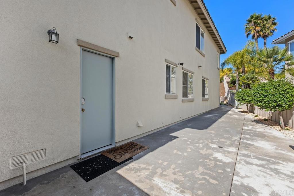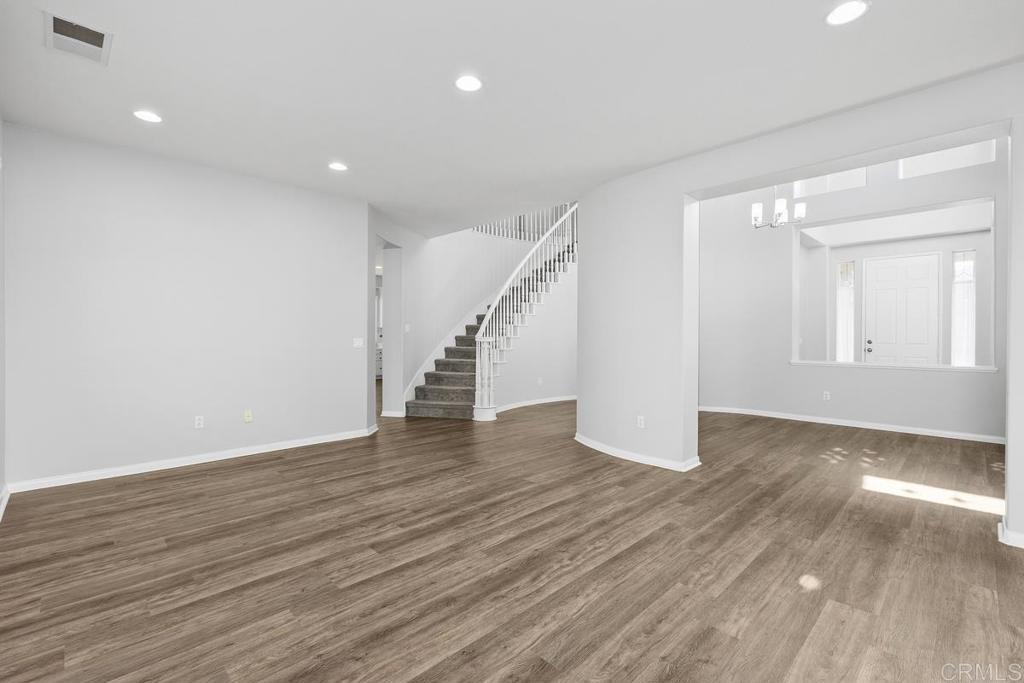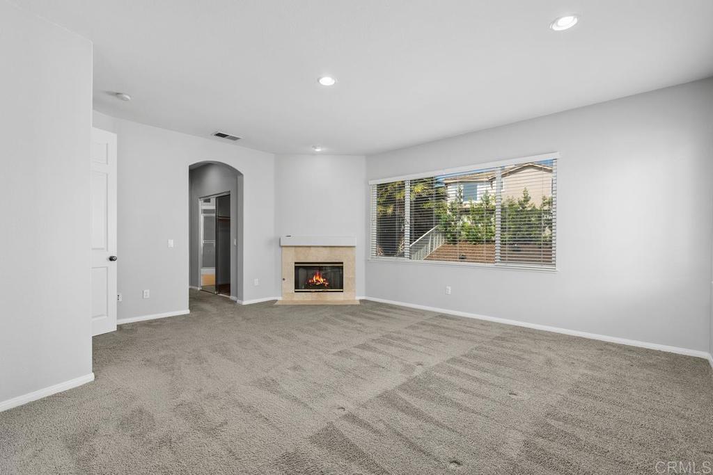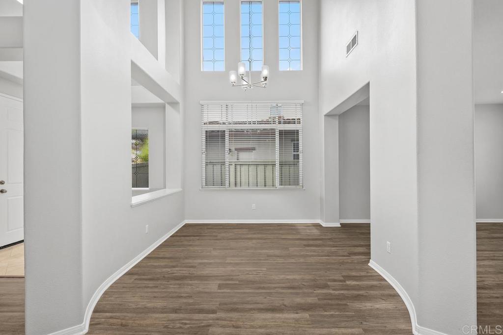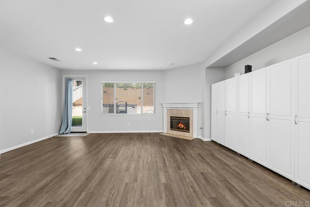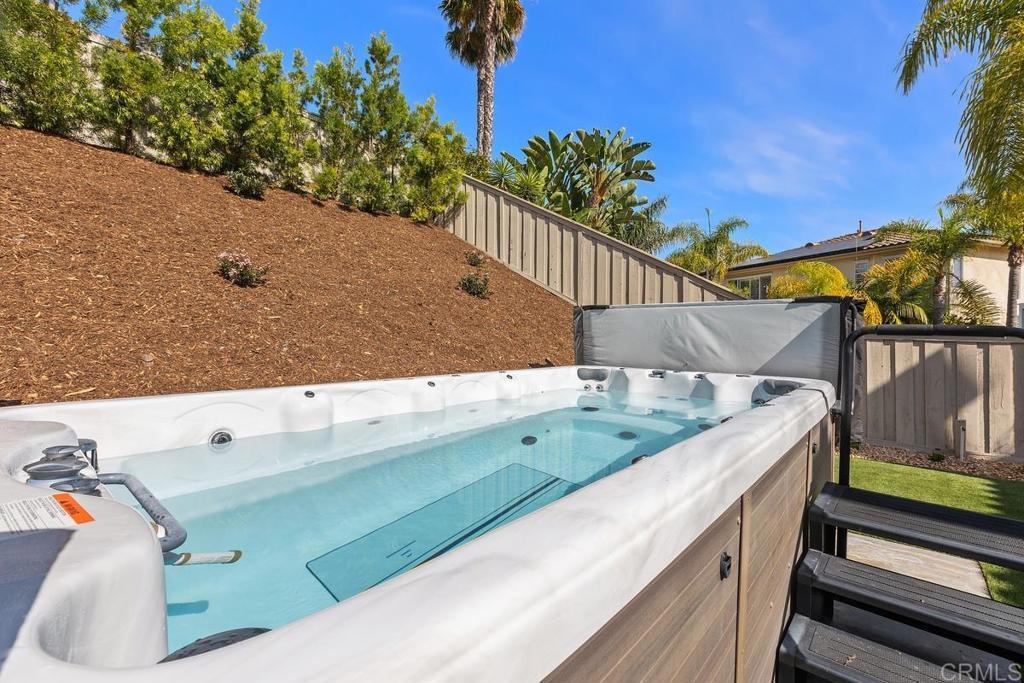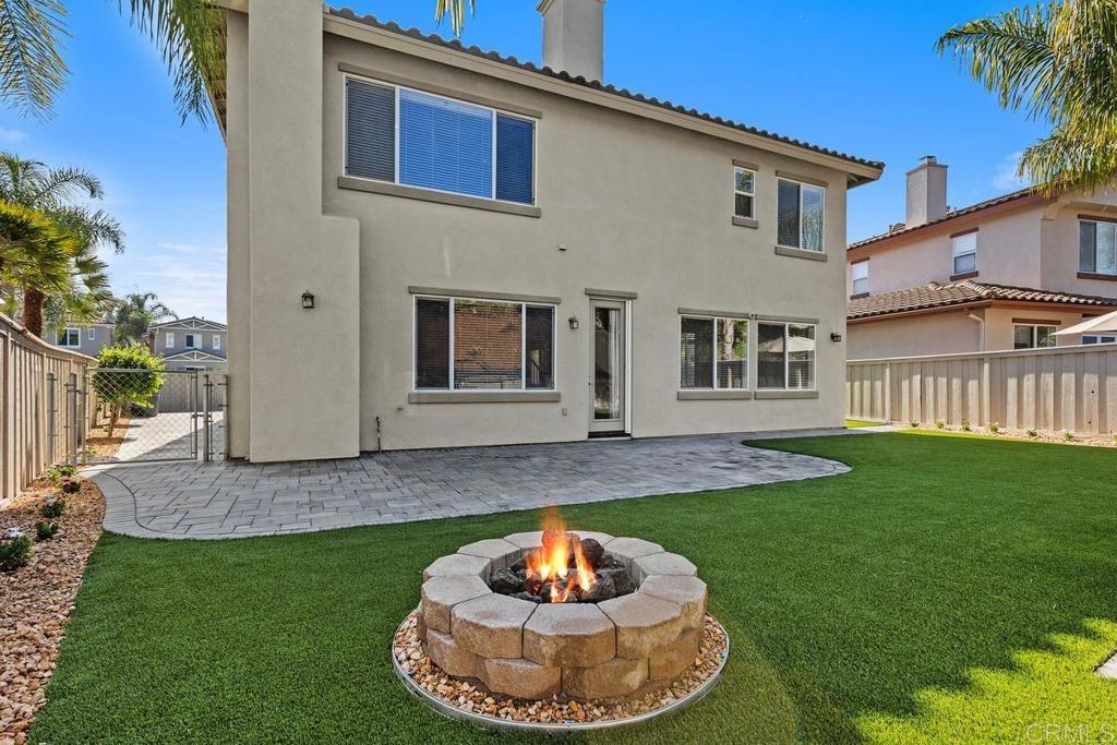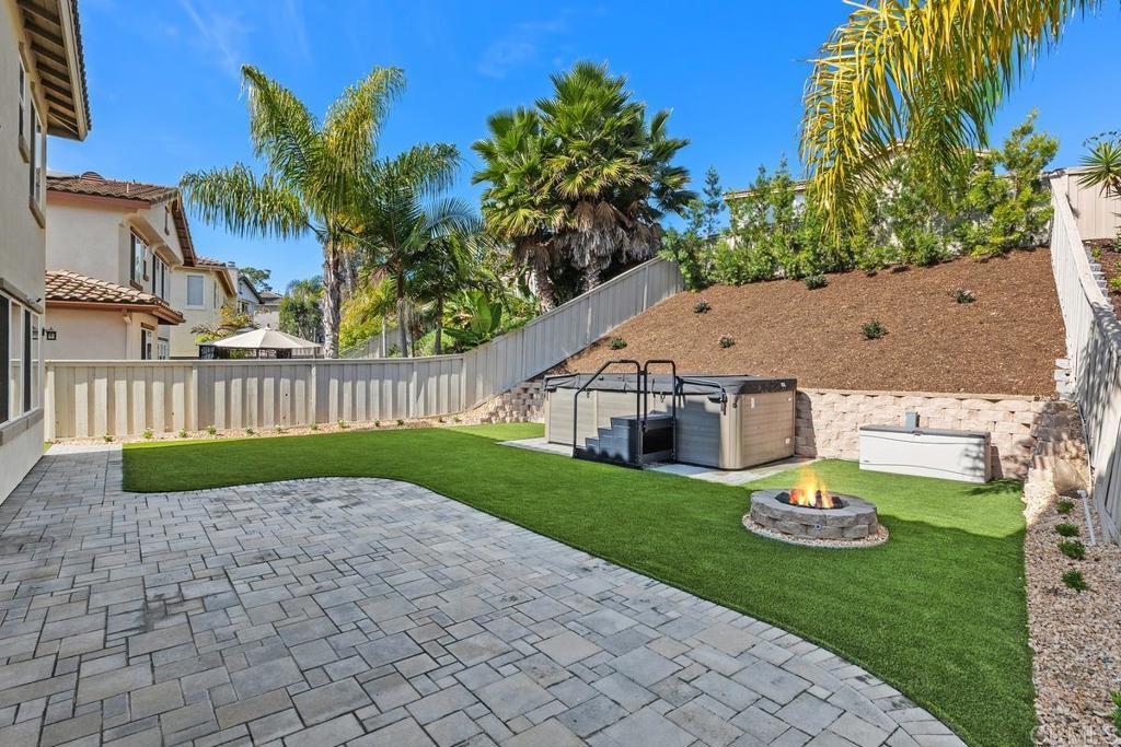Welcome to this exceptional 5-bedroom, 3-bath Calavera Hills home with owned solar, a main-level bedroom, full bath, and a large yard with a swim spa. A soaring two-story foyer welcomes you and flows into the formal spaces. The two-story dining room showcases a wall of windows that fill the space with natural light and seamlessly lead into the adjacent formal living room. Luxury vinyl plank floors extend throughout this level, leading to the heart of the home: an expansive kitchen with classic white cabinetry, a center island with breakfast bar, double ovens, and a daily dining area. The family room centers on a fireplace with a media niche and a wall of windows to the yard. Completing this level are a bedroom with French doors, a full bath with a walk-in shower, and a laundry room with a utility sink and upper cabinets. An elegant, curved staircase leads to the generous primary suite with a fireplace, two walk-in closets, and a private retreat that closes with French doors. The primary bath includes a large walk-in shower with a bench, an oversized soaking tub, two vanities plus a seated vanity, and a separate water closet. Three additional bedrooms, a hall bath, and an expansive walk-in linen closet complete the upper level. Outdoors, enjoy turf, a paver patio, a gas fire pit, a large swim spa, and two oversized side yards, one turf and one concrete. Additional features include dual-zoned AC and furnace (new in 2021), Ecobee thermostats, ceiling fans, and a Ring camera system. Conveniently located near Lake Calavera Preserve with access to Calavera trails, parks, shopping, and a short drive to the beach.