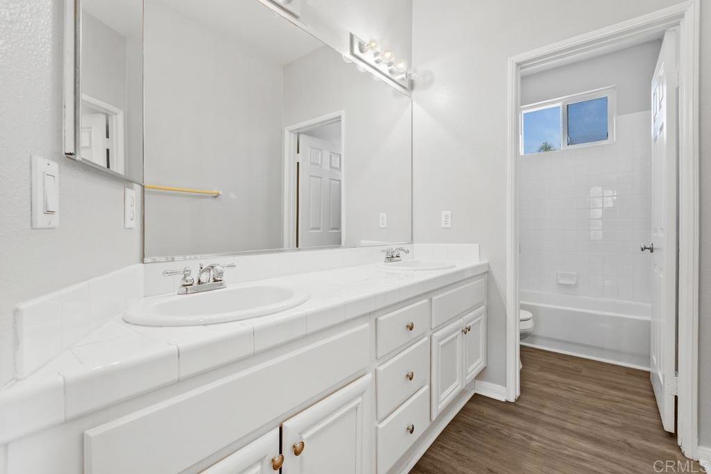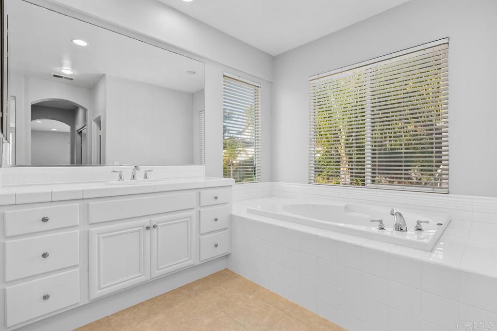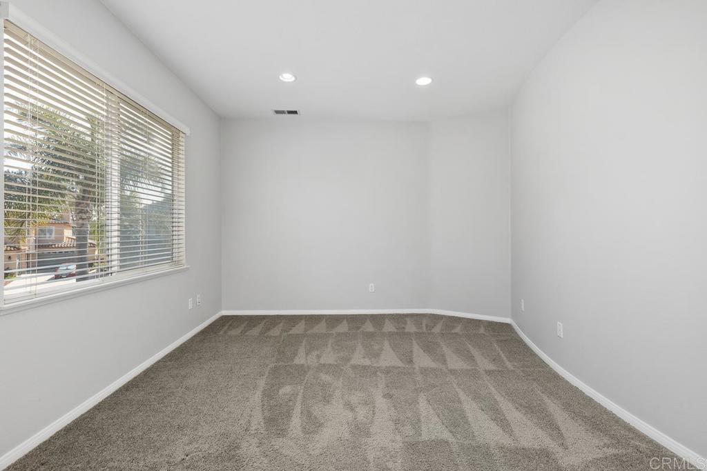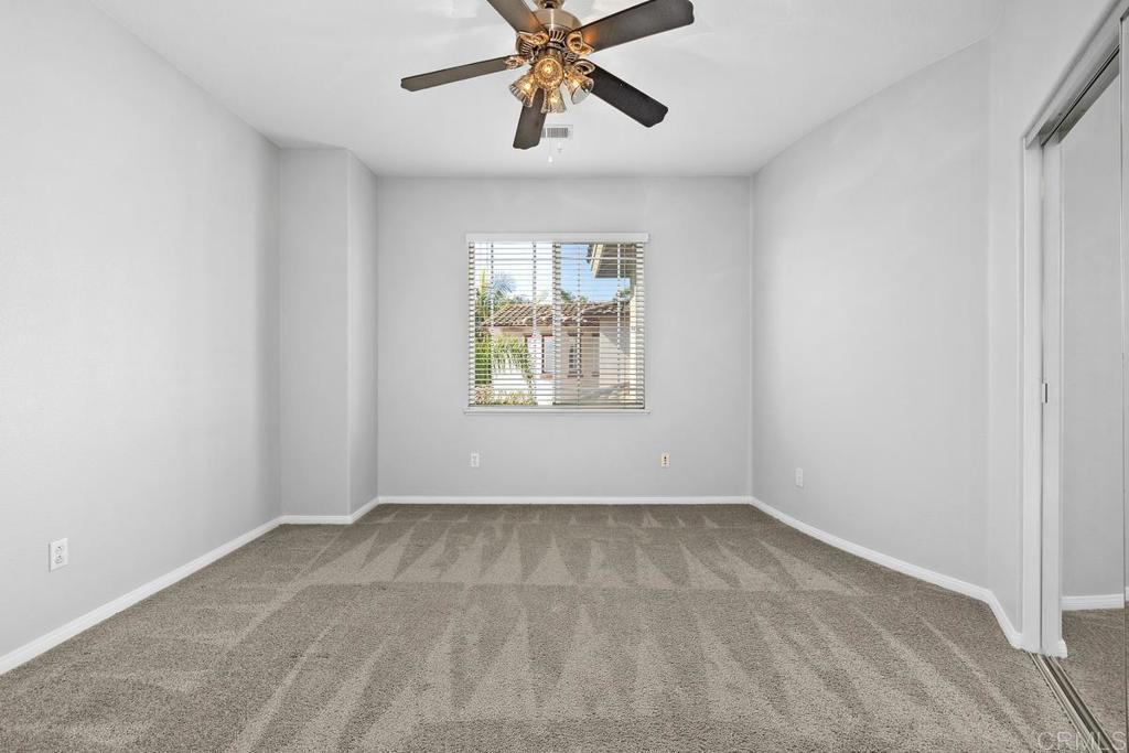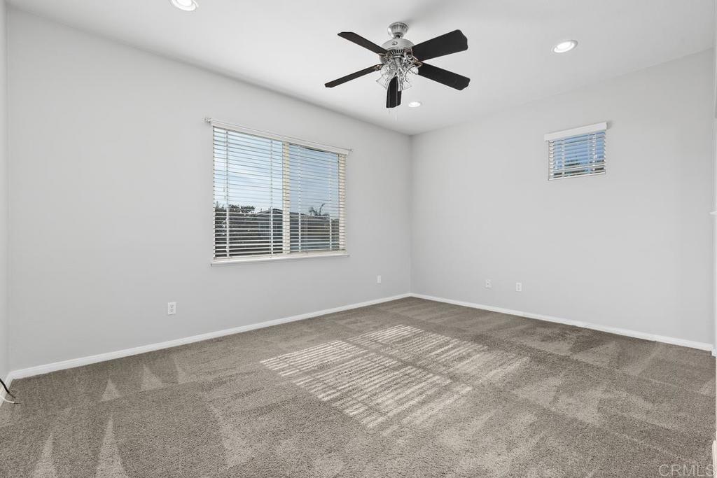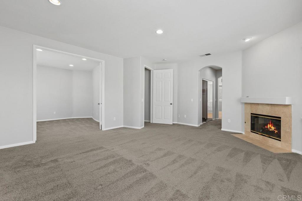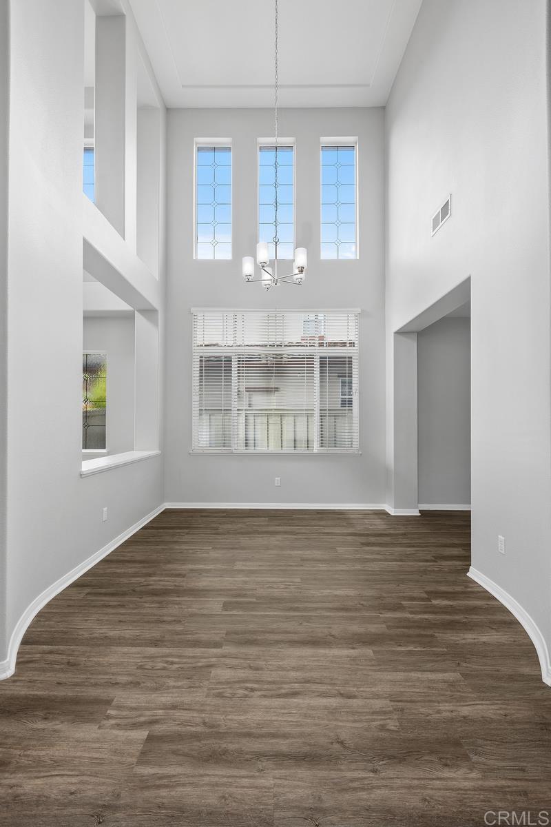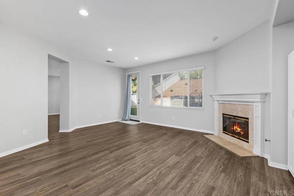 Welcome to this exceptional 5-bedroom, 3-bath Calavera Hills home with owned solar, a main-level bedroom, full bath, and a large yard with a swim spa. A soaring two-story foyer welcomes you and flows into the formal spaces. The two-story dining room showcases a wall of windows that fill the space with natural light and seamlessly lead into the adjacent formal living room. Luxury vinyl plank floors extend throughout this level, leading to the heart of the home: an expansive kitchen with classic white cabinetry, a center island with breakfast bar, double ovens, and a daily dining area. The family room centers on a fireplace with a media niche and a wall of windows to the yard. Completing this level are a bedroom with French doors, a full bath with a walk-in shower, and a laundry room with a utility sink and upper cabinets. An elegant, curved staircase leads to the generous primary suite with a fireplace, two walk-in closets, and a private retreat that closes with French doors. The primary bath includes a large walk-in shower with a bench, an oversized soaking tub, two vanities plus a seated vanity, and a separate water closet. Three additional bedrooms, a hall bath, and an expansive walk-in linen closet complete the upper level. Outdoors, enjoy turf, a paver patio, a gas fire pit, a large swim spa, and two oversized side yards, one turf and one concrete. Additional features include dual-zoned AC and furnace (new in 2021), Ecobee thermostats, ceiling fans, and a Ring camera system. Conveniently located near Lake Calavera Preserve with access to Calavera trails, parks, shopping, and a short drive to the beach.
